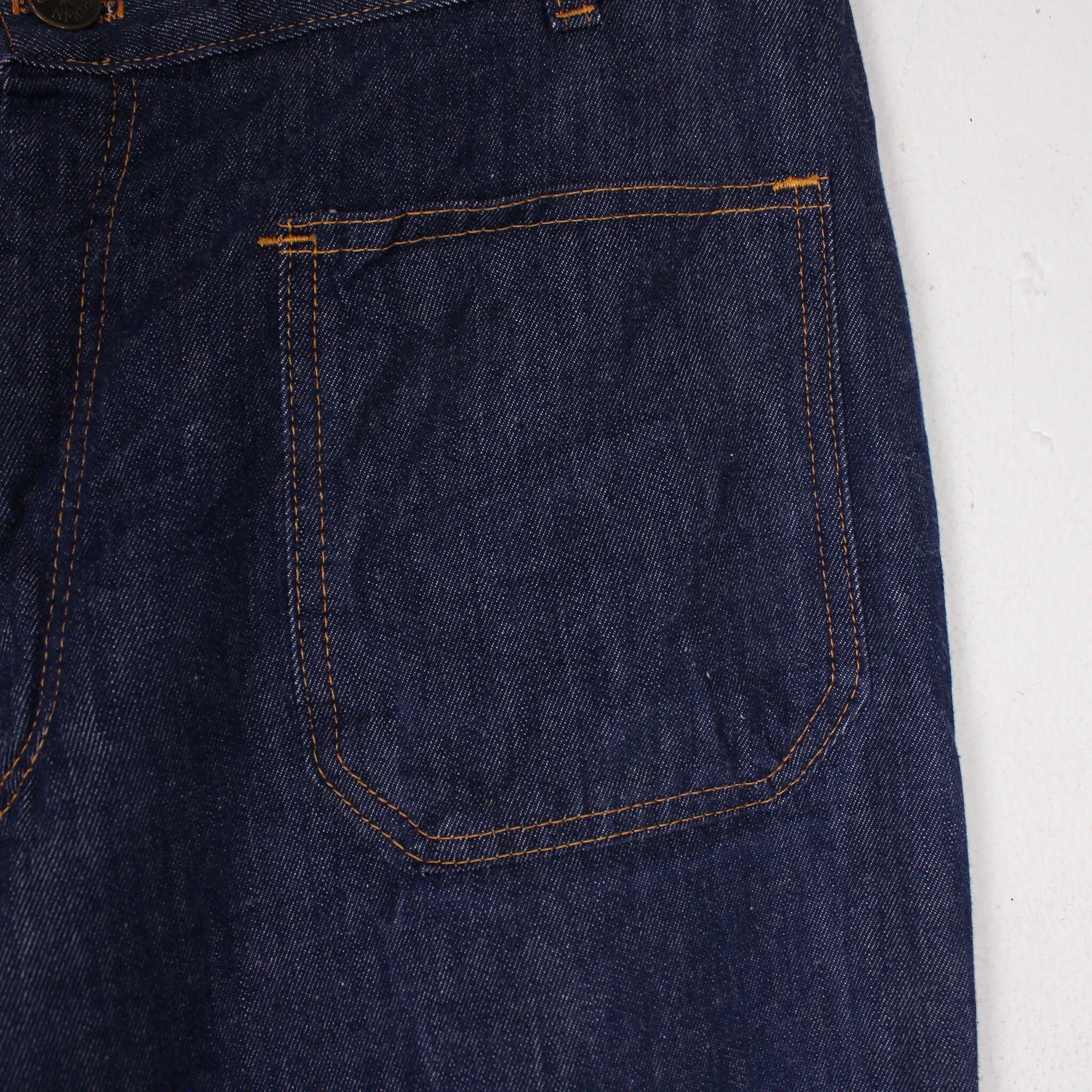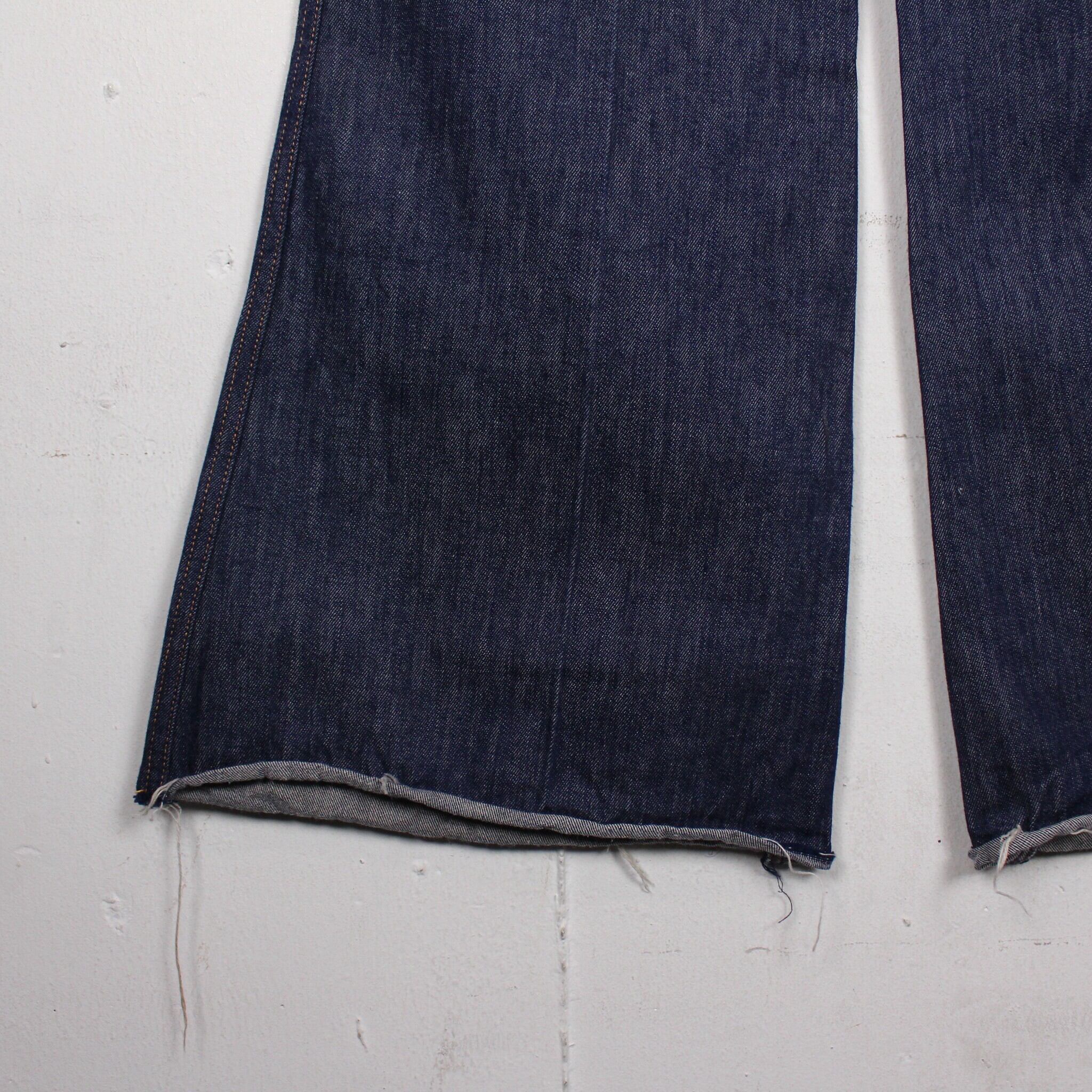 セーラーパンツのディテールを取り入れた、濃紺で色残りの良い70'sフレアデニムパンツ。