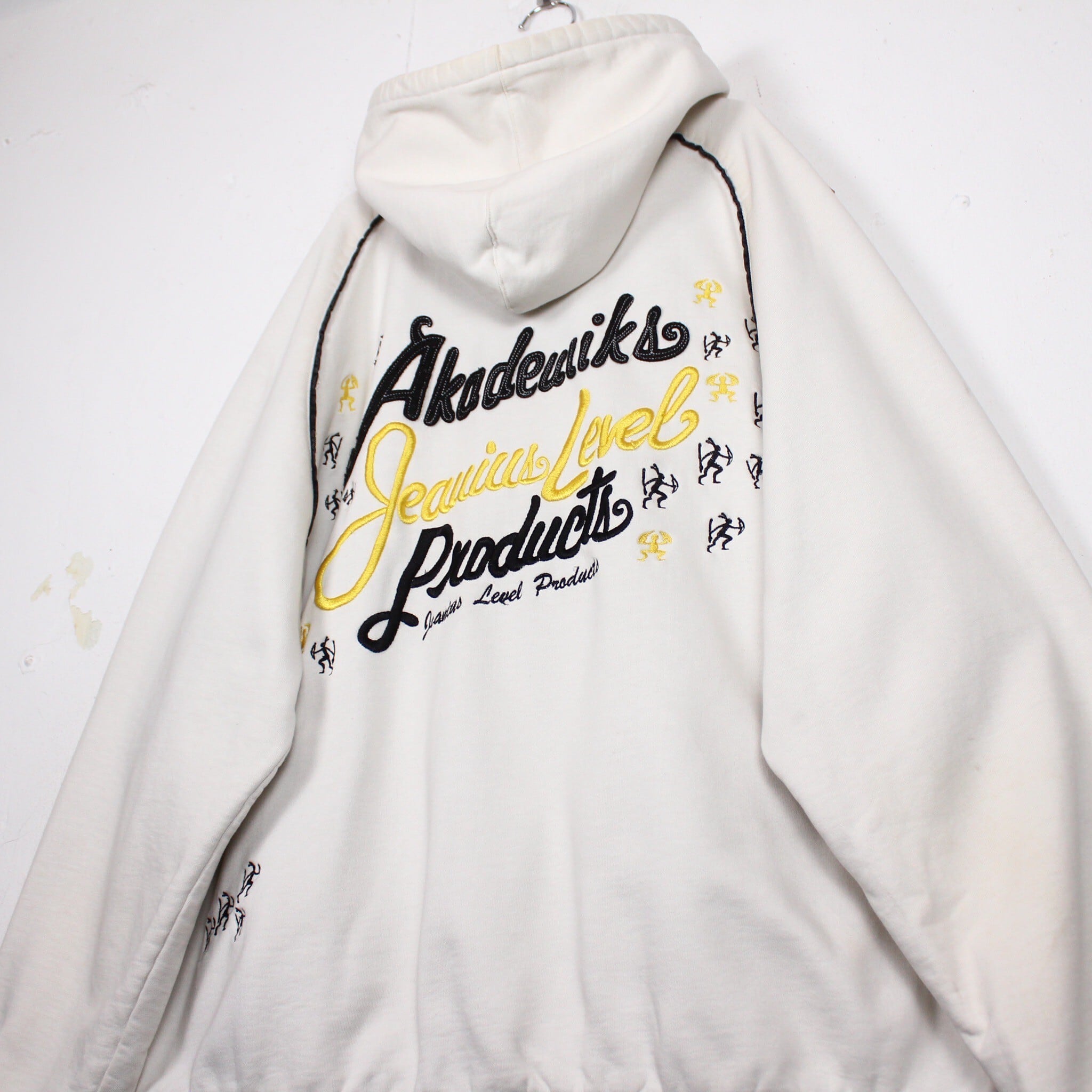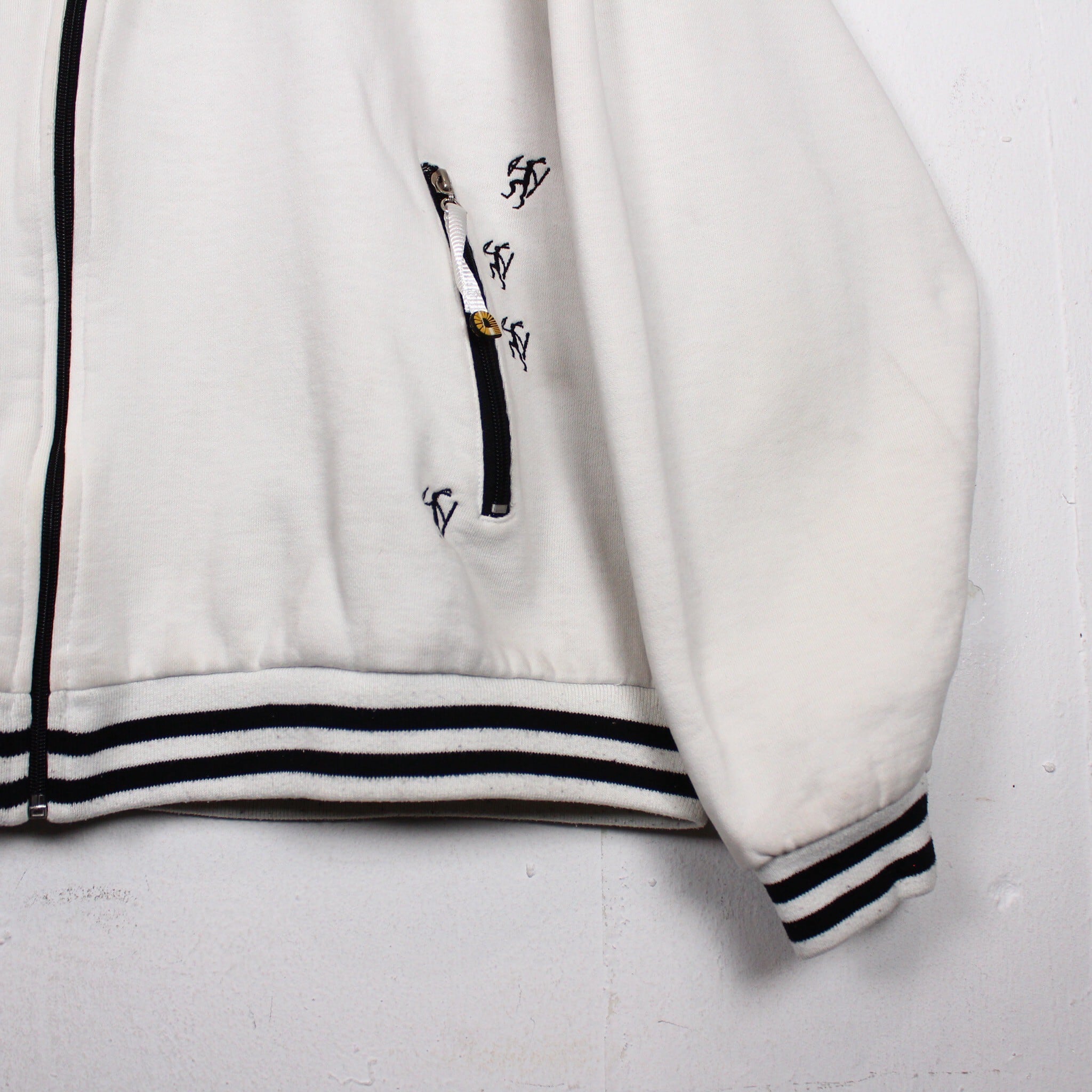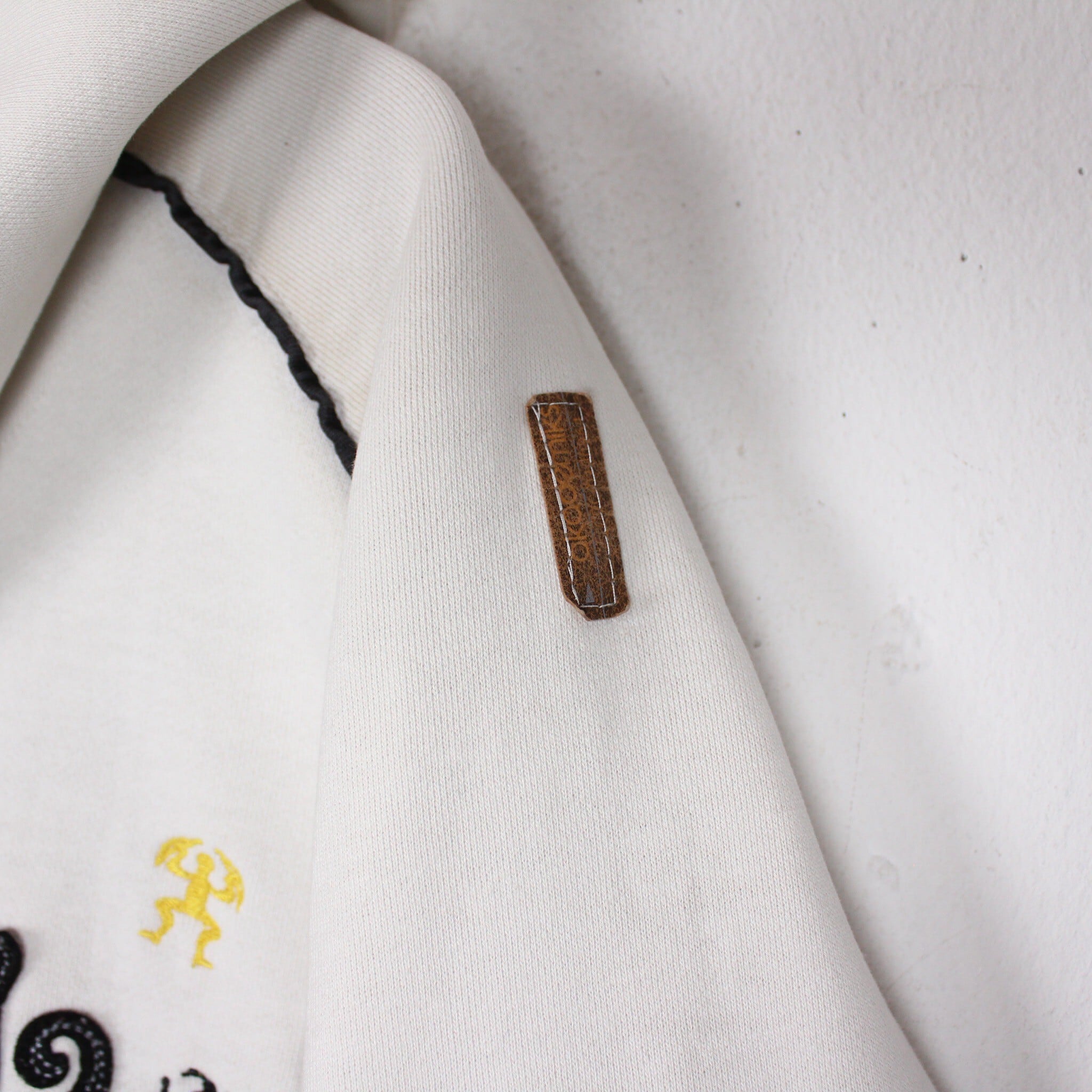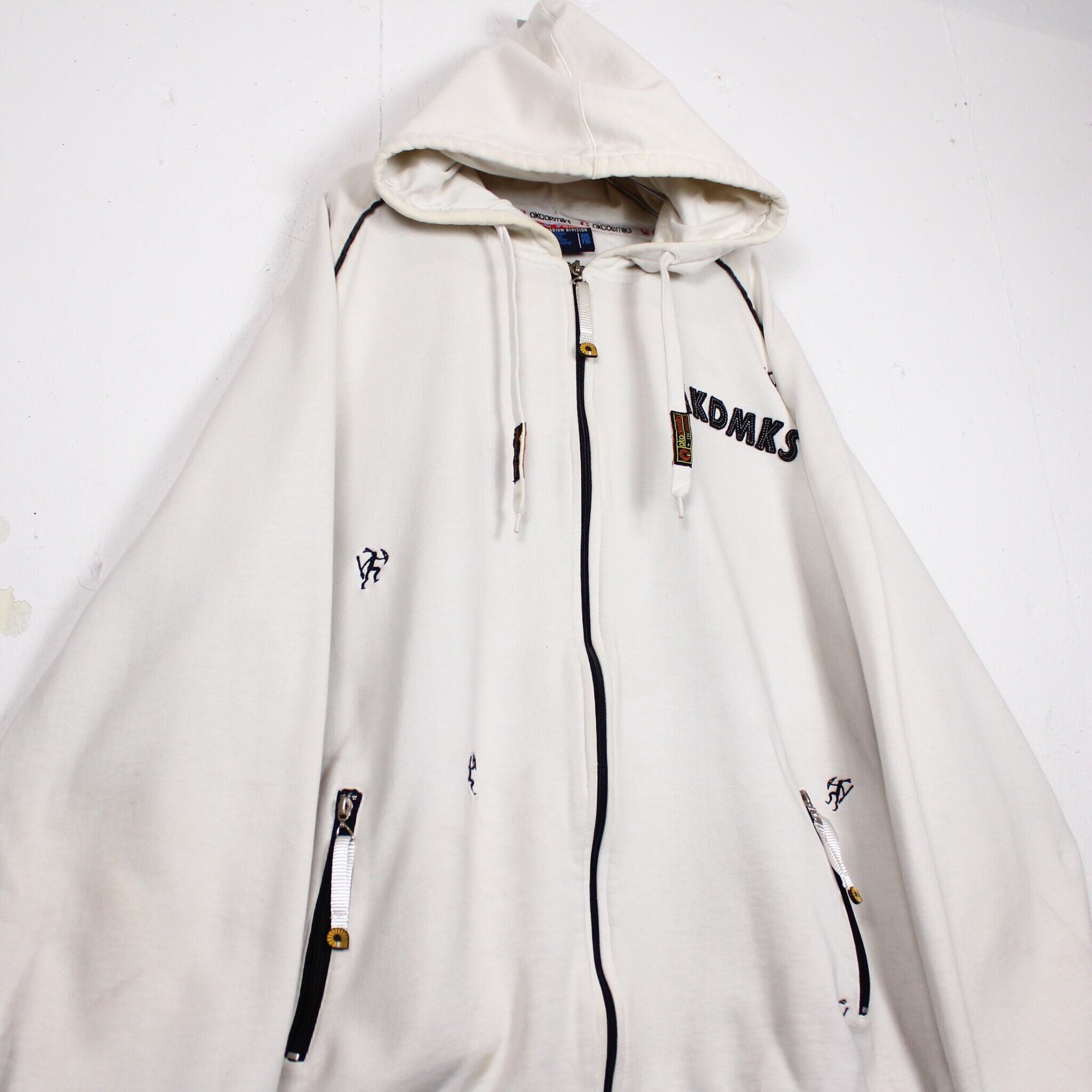 白のスウェットボディをベースに、左胸にはブランドロゴ、背面にもブランドネームをパッチや刺繍で施したジップフーディー。