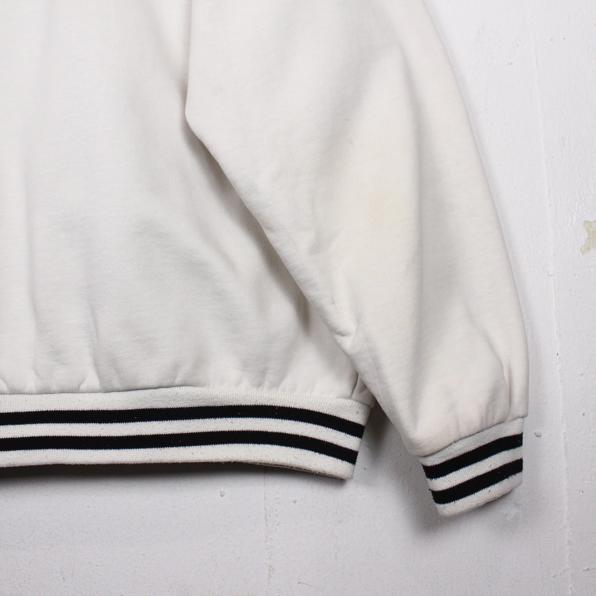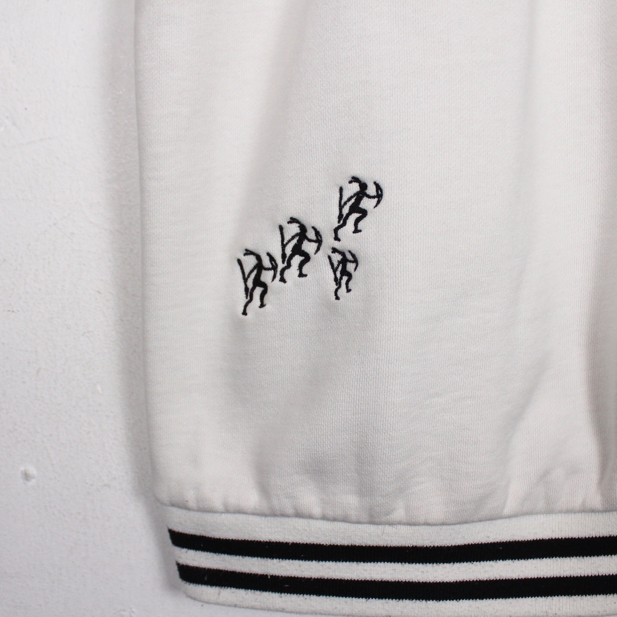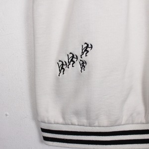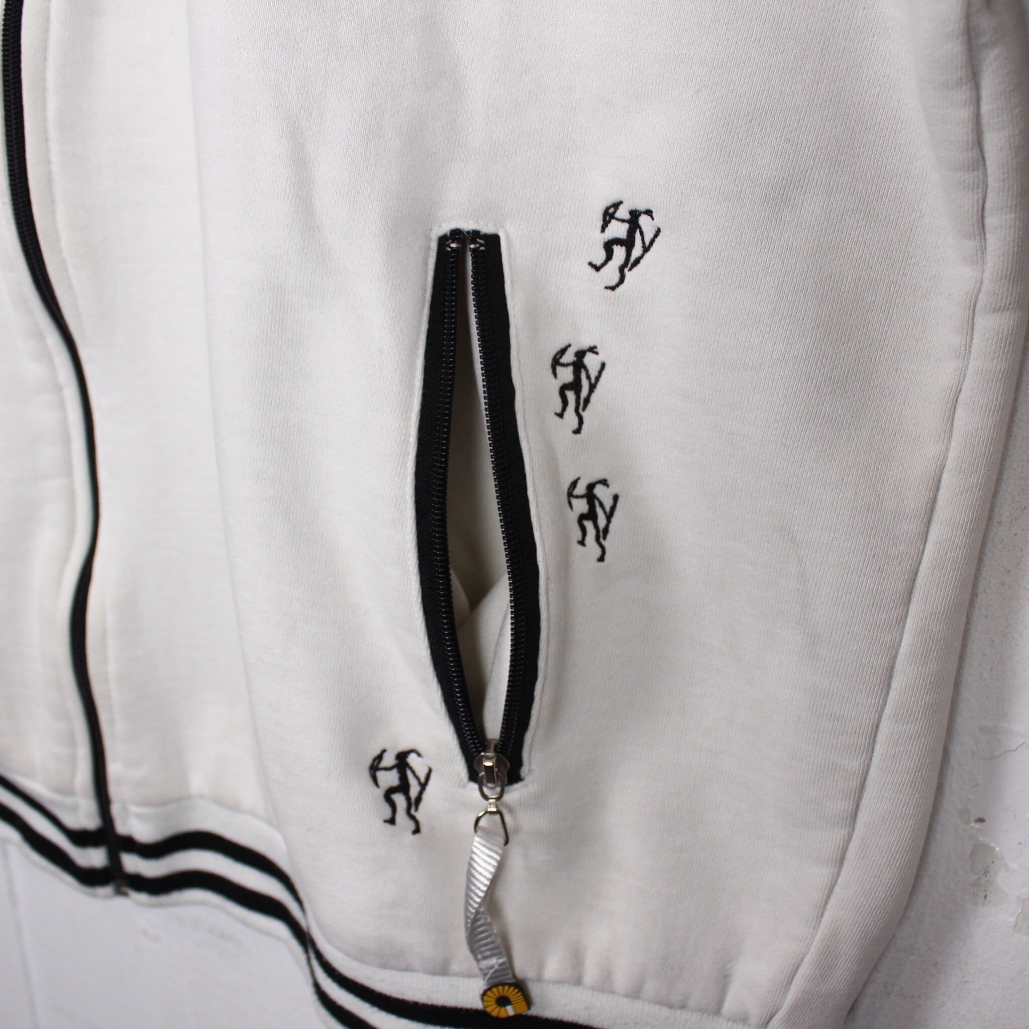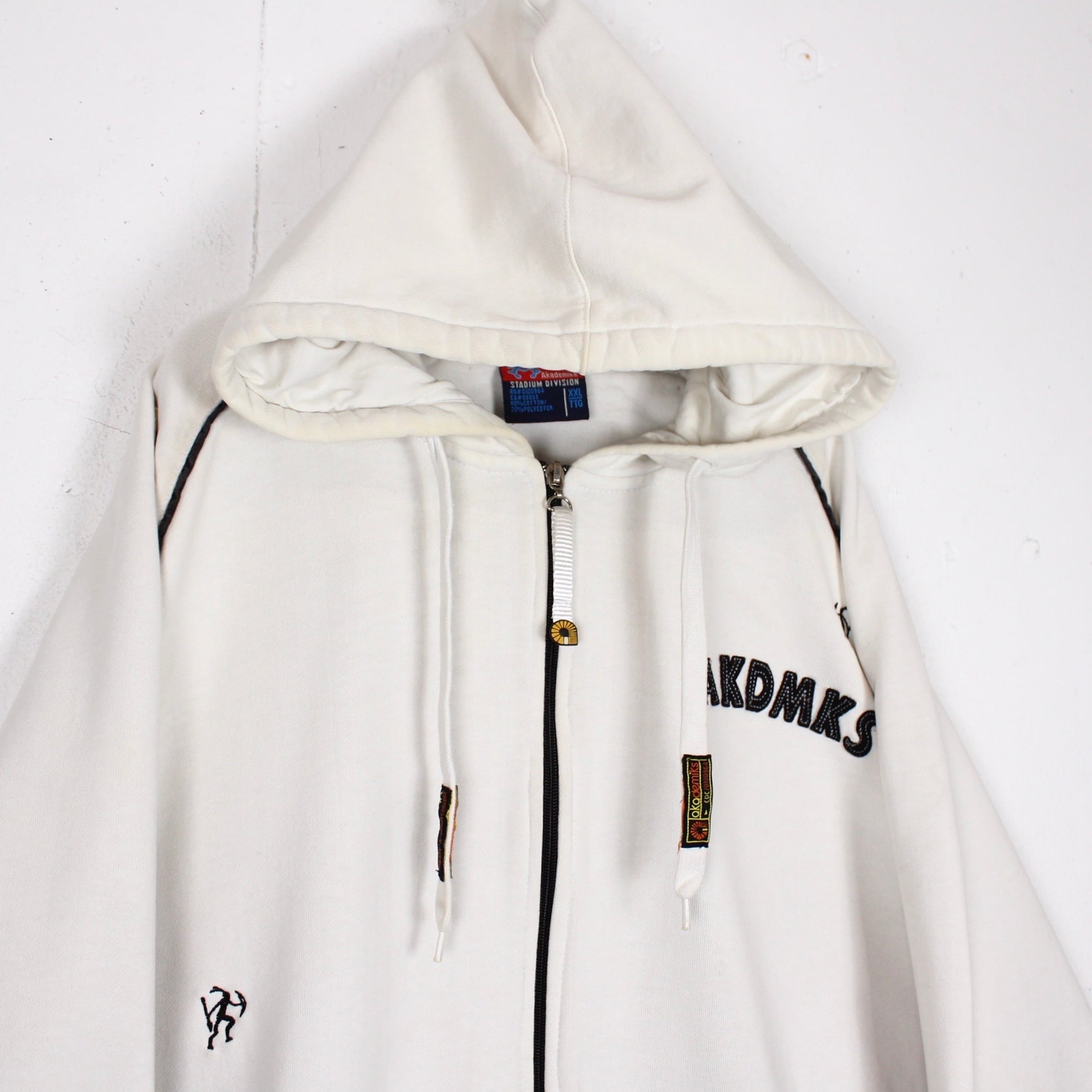 白のスウェットボディをベースに、左胸にはブランドロゴ、背面にもブランドネームをパッチや刺繍で施したジップフーディー。