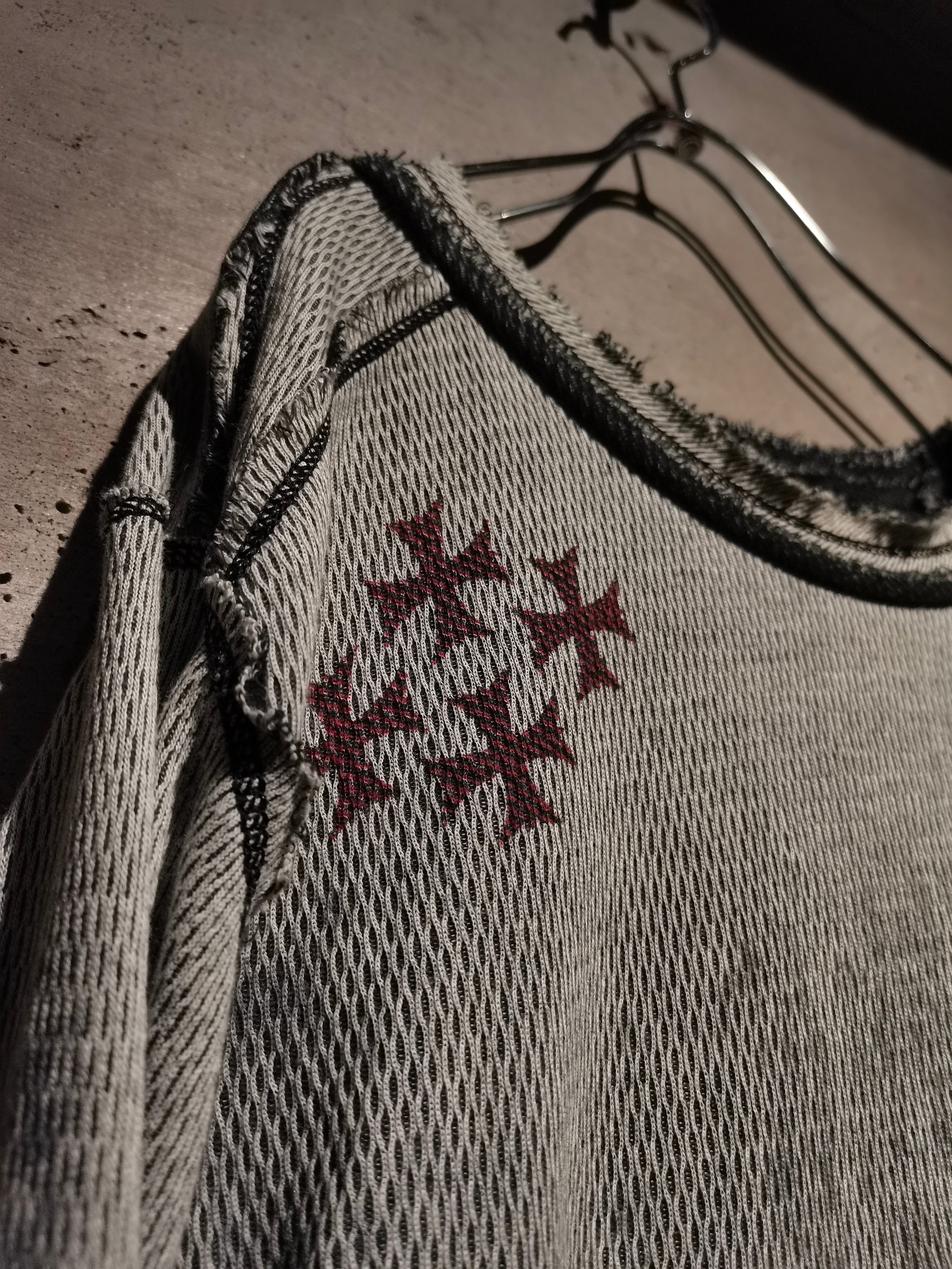 そしてシームを表面に出し、敢えてほつれさせてフリンジを効かせたインサイドアウト風のデザインと、細やかな部分までしっかりと作り込まれたクオリティの高い仕上がりとなっています。サーマルならではの凹凸のある生地感で肌触りも良く、着心地も最高です。