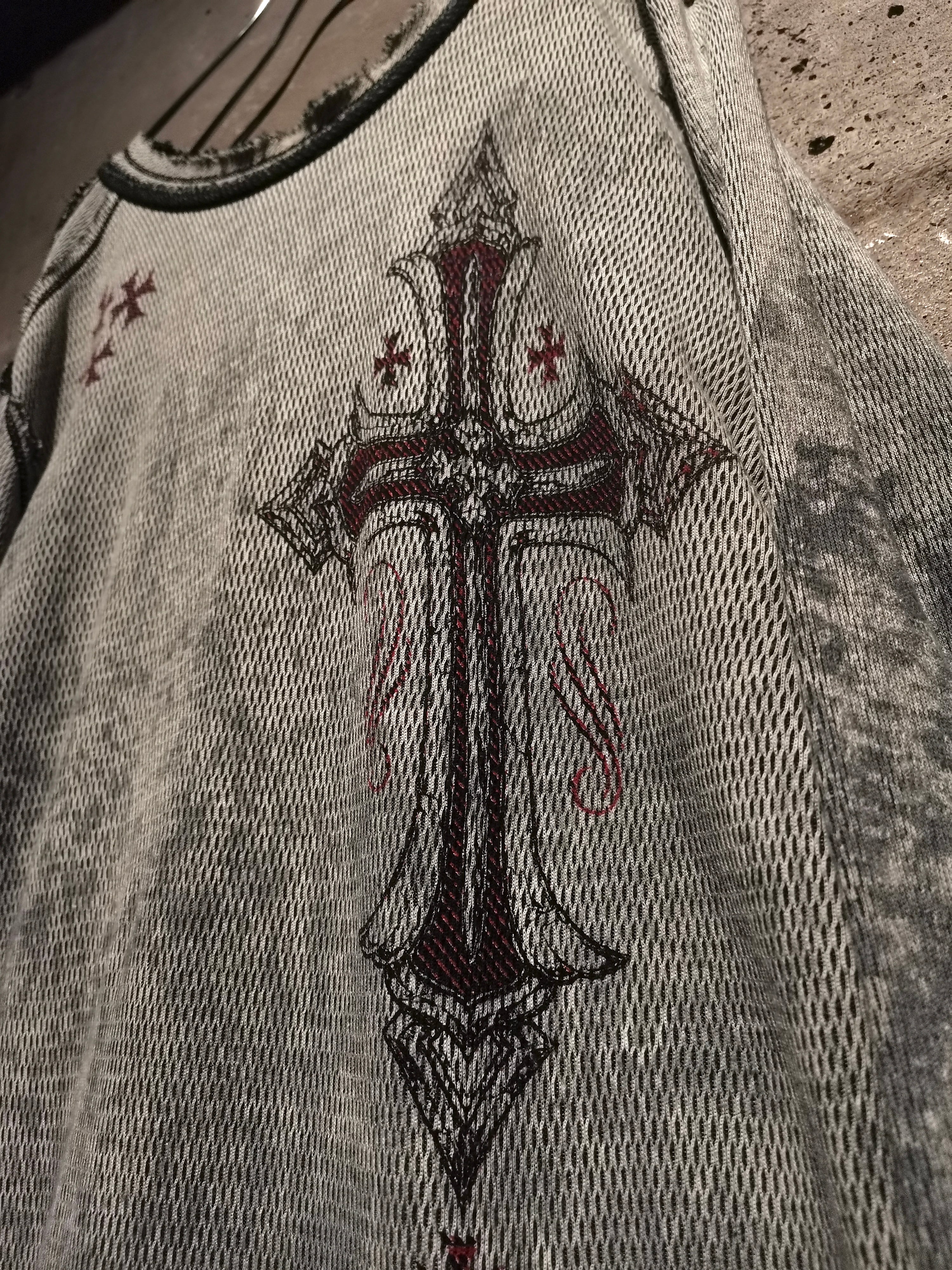 表の黒の面にはブランドらしいスカルのプリント、裏のグレーの面にはクロスとスカルのプリントが施されたゴシックな雰囲気を漂わせる1着。