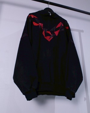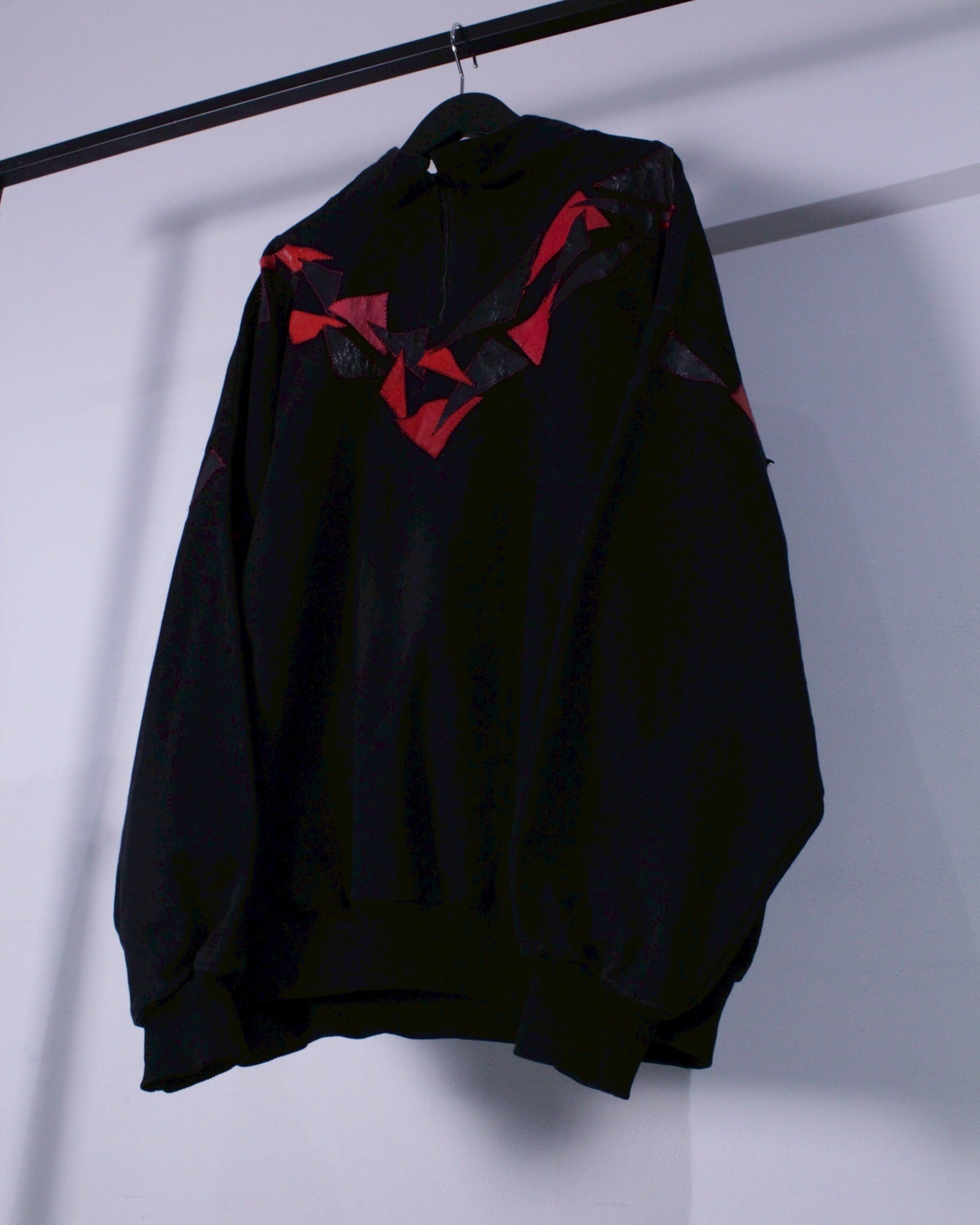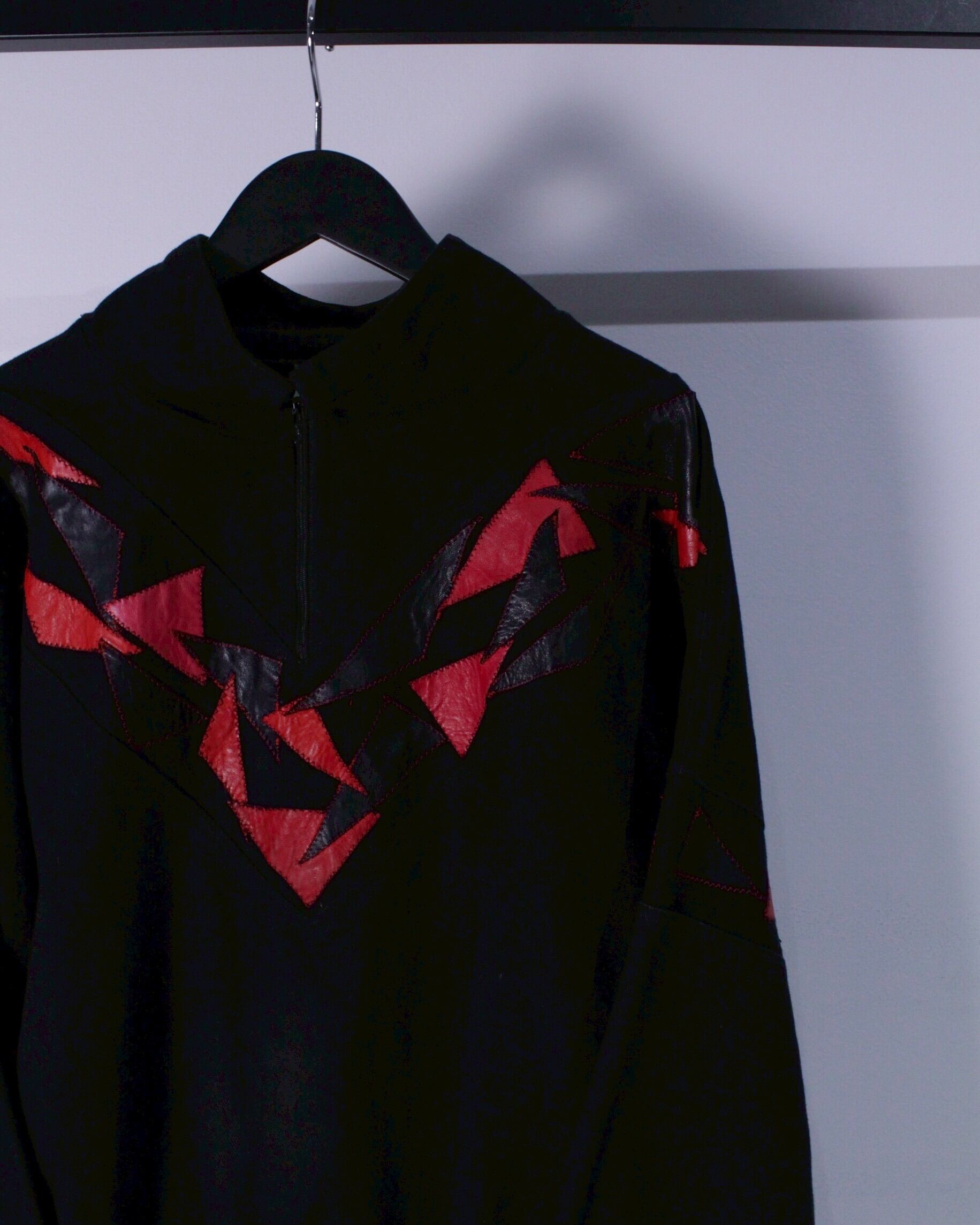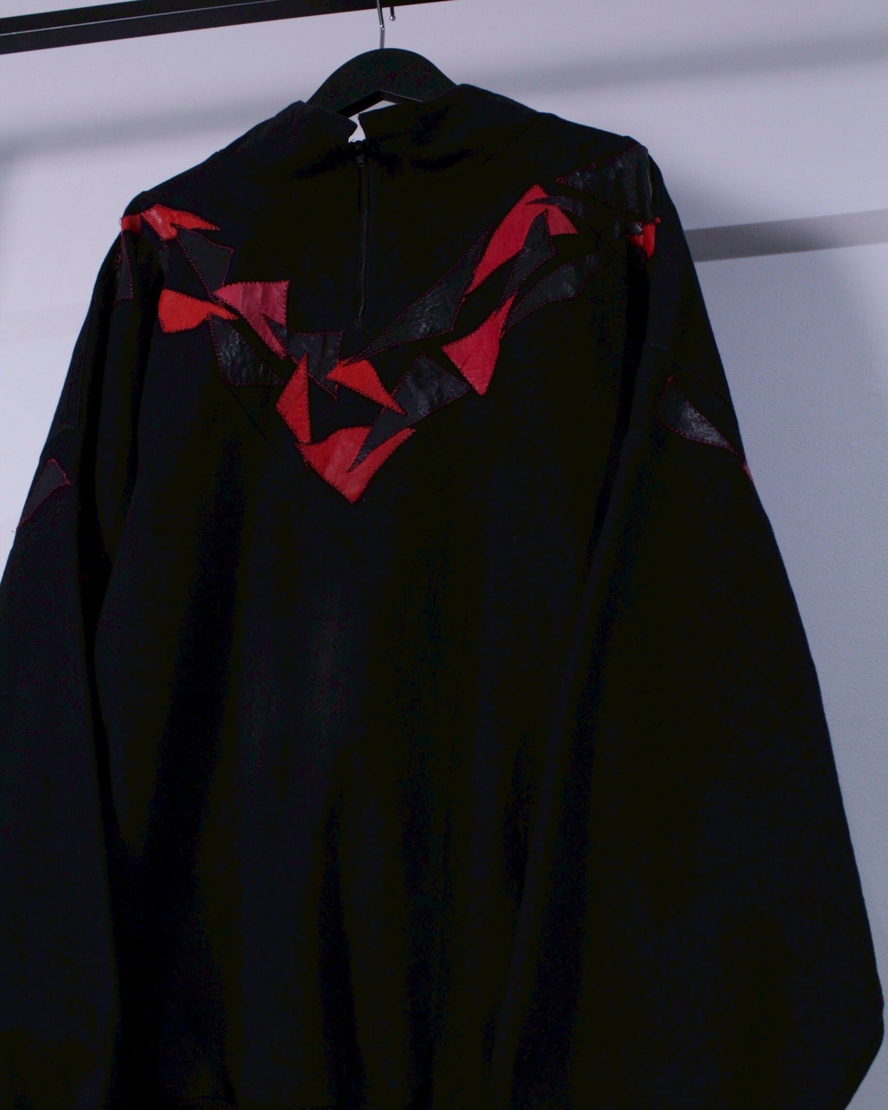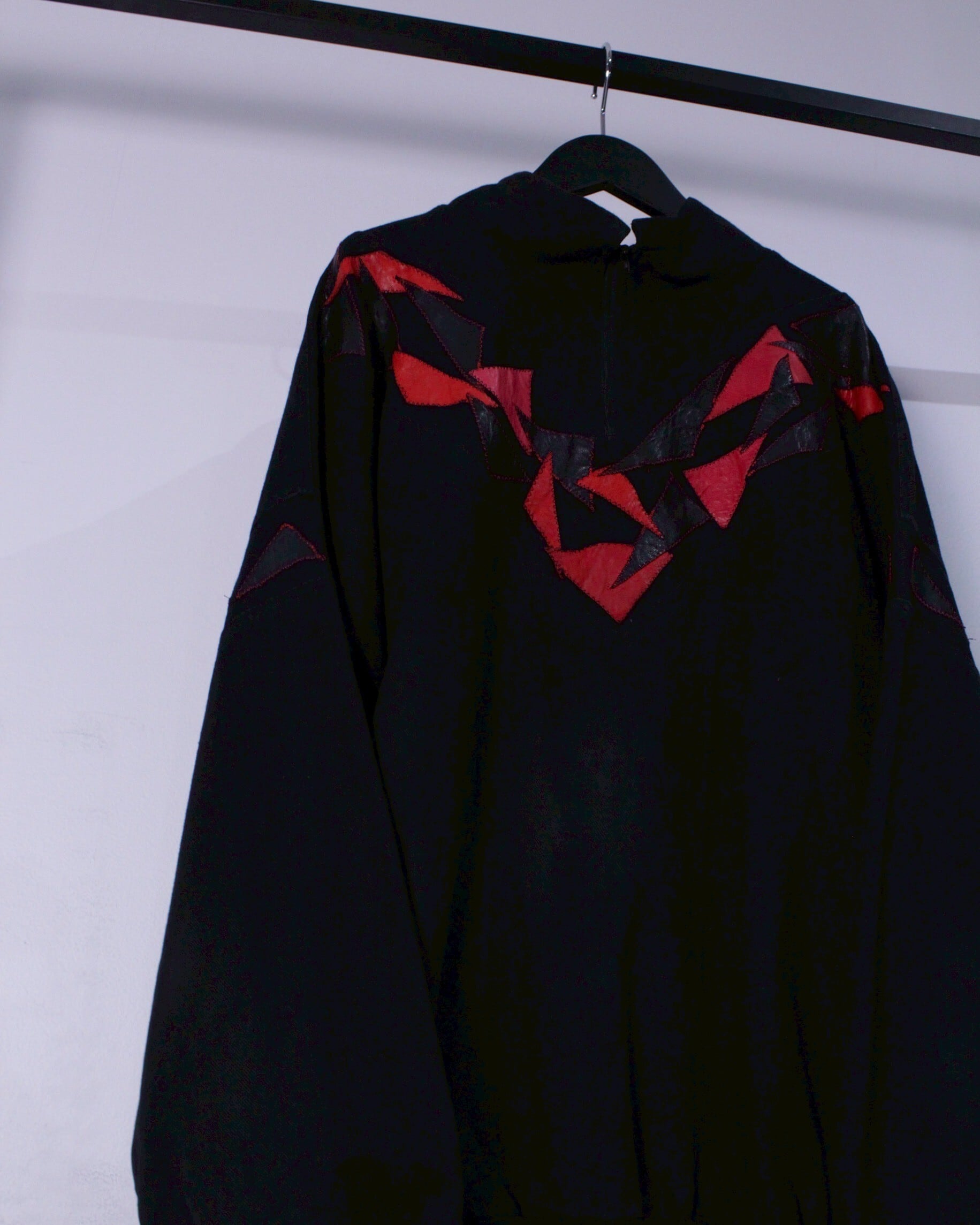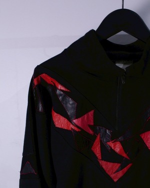 胸とアーム部分には赤と黒のレザーをパッチワーク調に縫いつけたジャケット。ブラックのコットン素材とレザーの素材感による、異素材のコントラストが特有の雰囲気を放つ1着に。