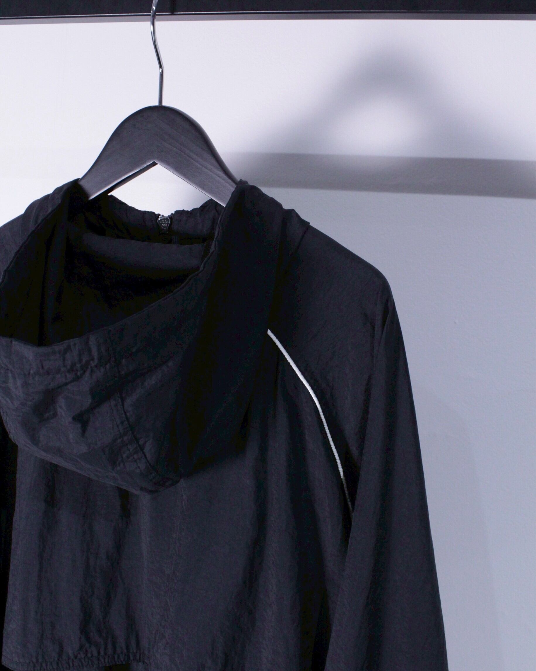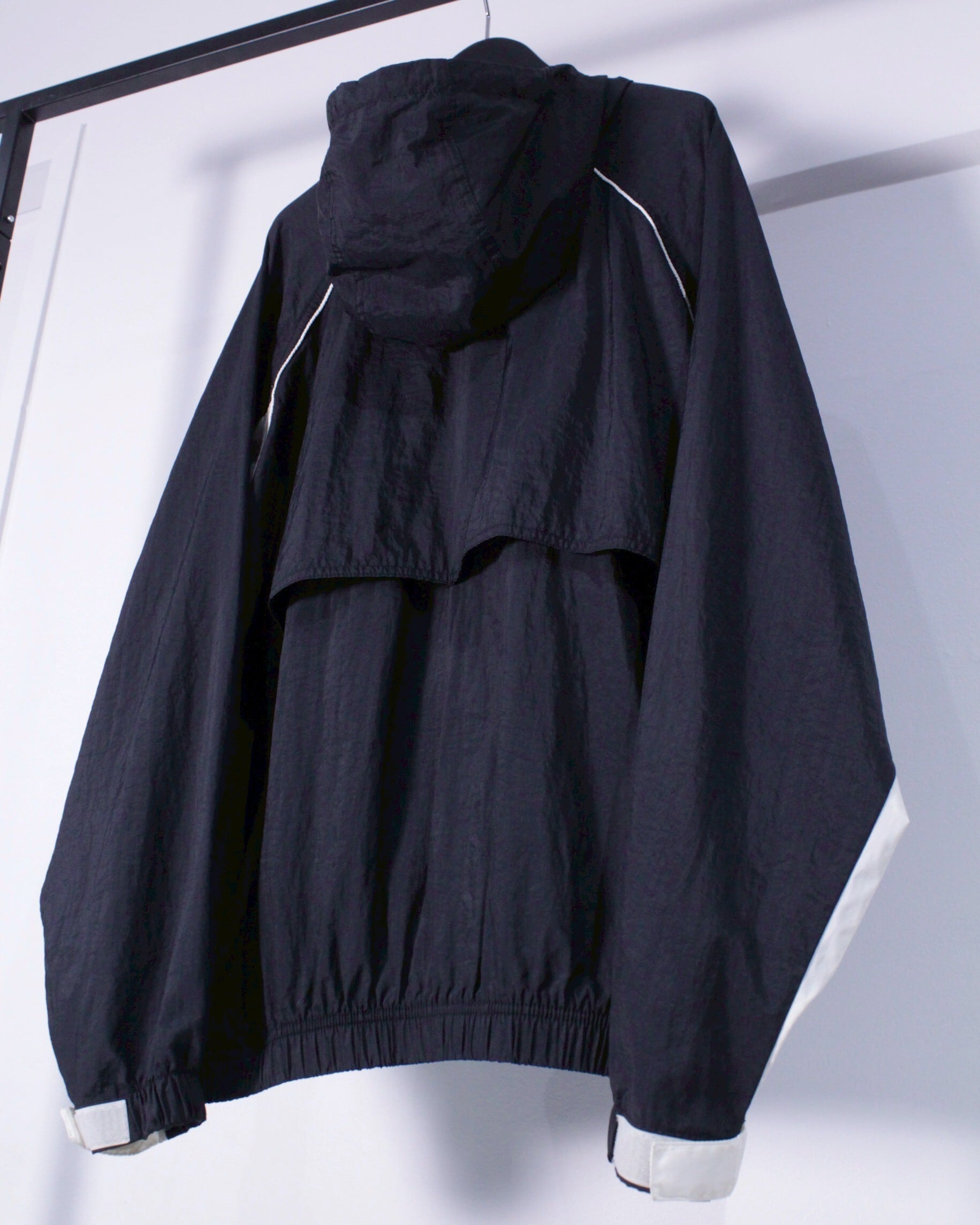 ブラックナイロン素材をベースに白のナイロン切り替え、左胸にスウォッシュロゴを配したナイロンジャケット。