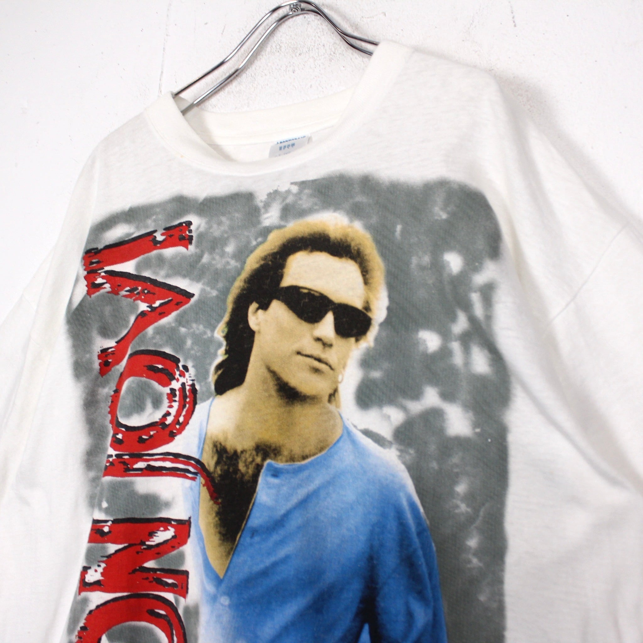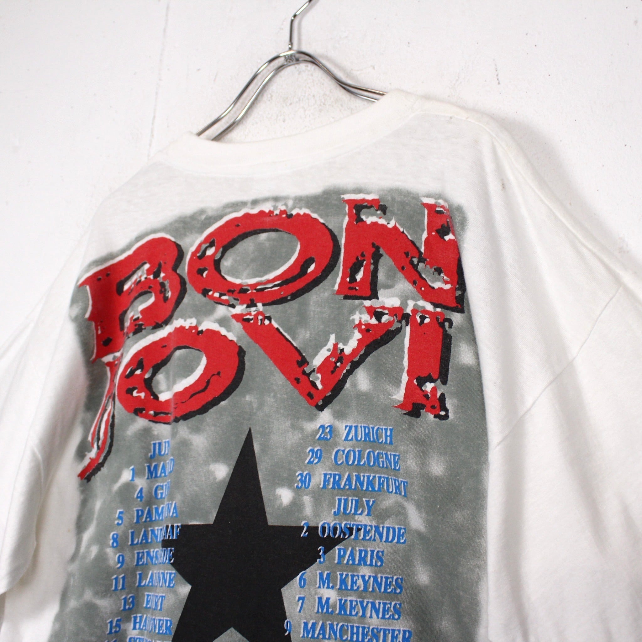 フロントにはボン・ジョヴィの顔を、背面にはバンドTシャツらしいバンド名と地名がプリントされたデザインの1着。
