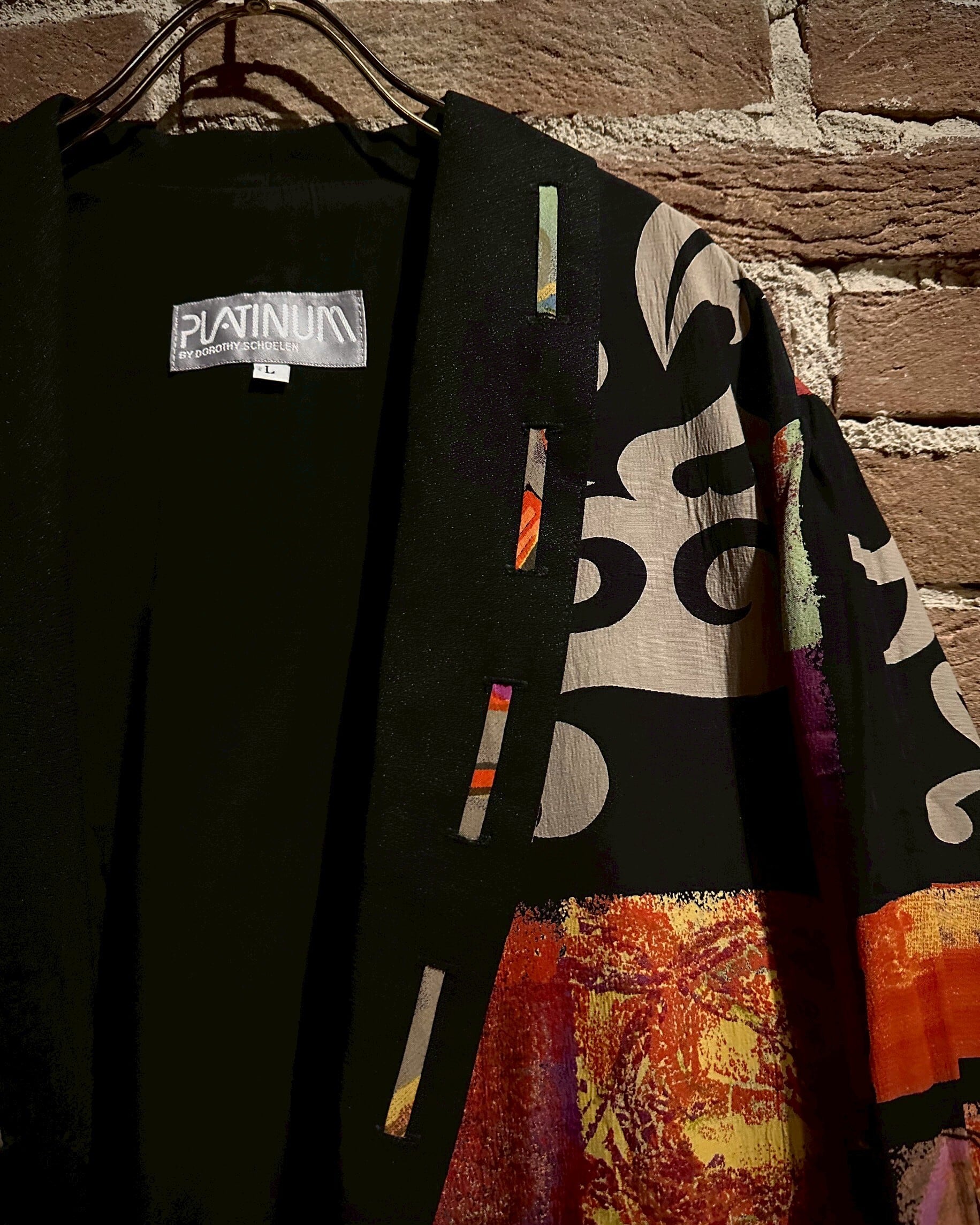 ブラックのボディのベースに、抽象的なアート柄を載せたテーラードジャケット。