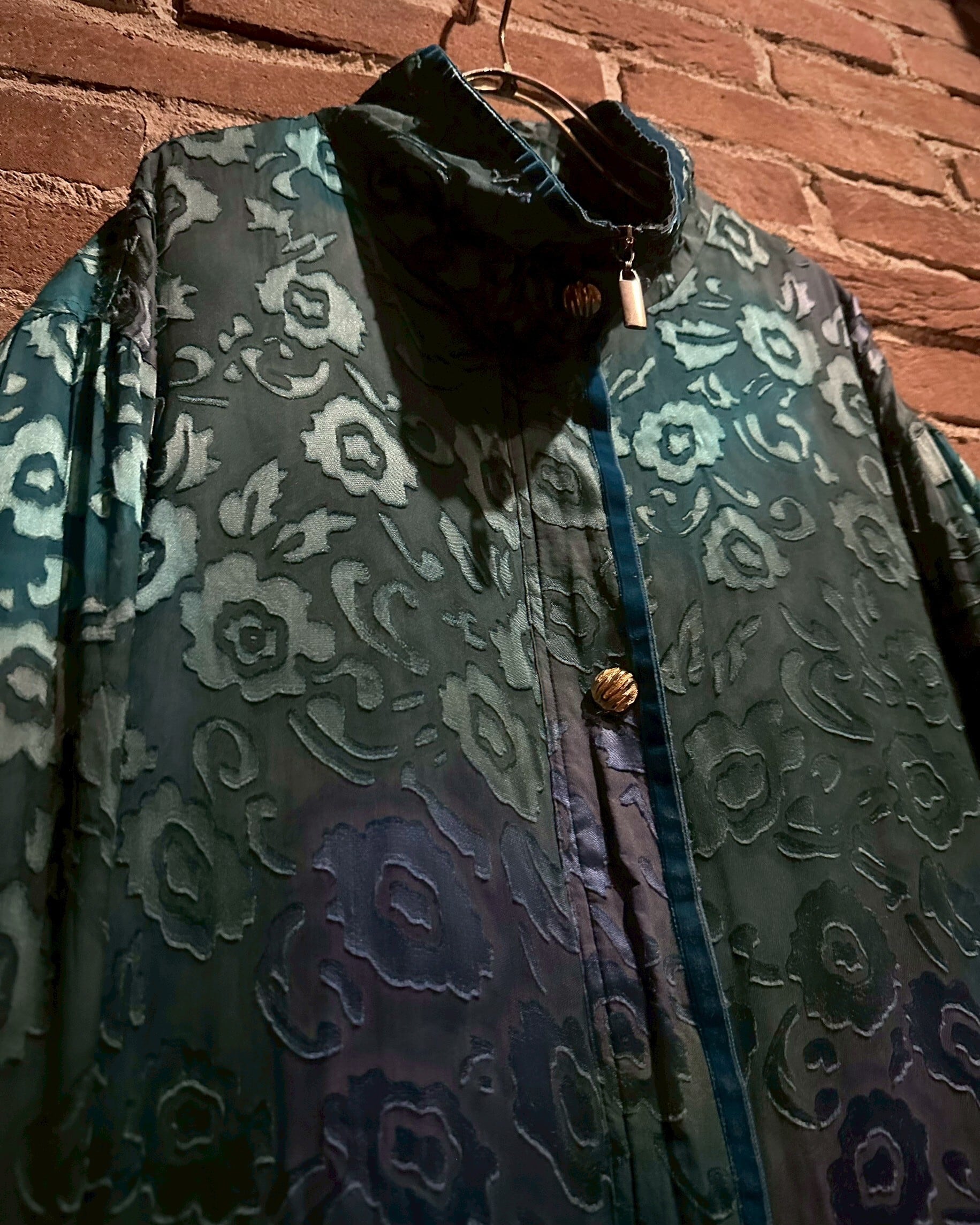 透け感もさることながら、花柄には光沢のある糸を用いており、絶妙な立体感を表現。フロントのデザインの効いたボタン使いも◎
