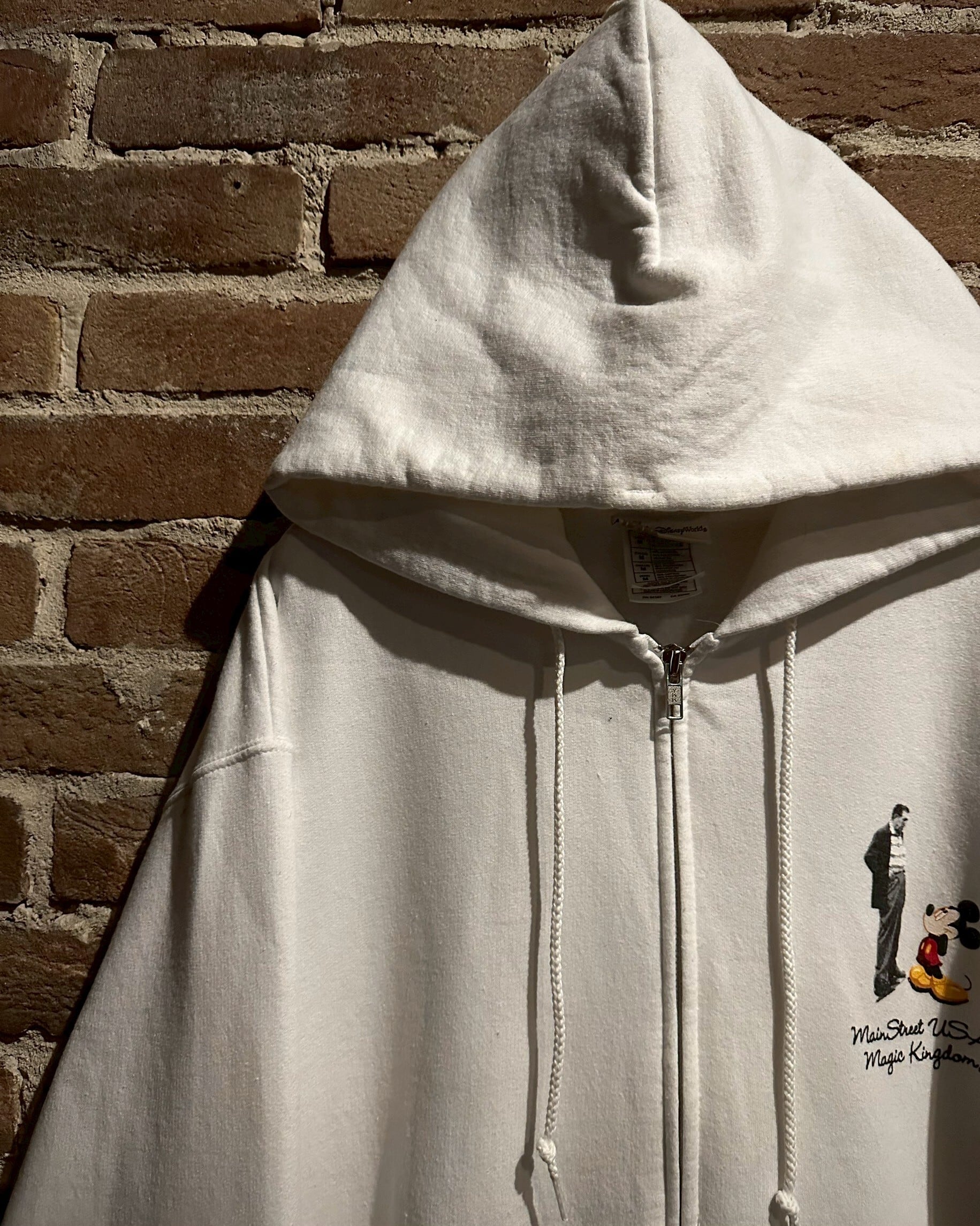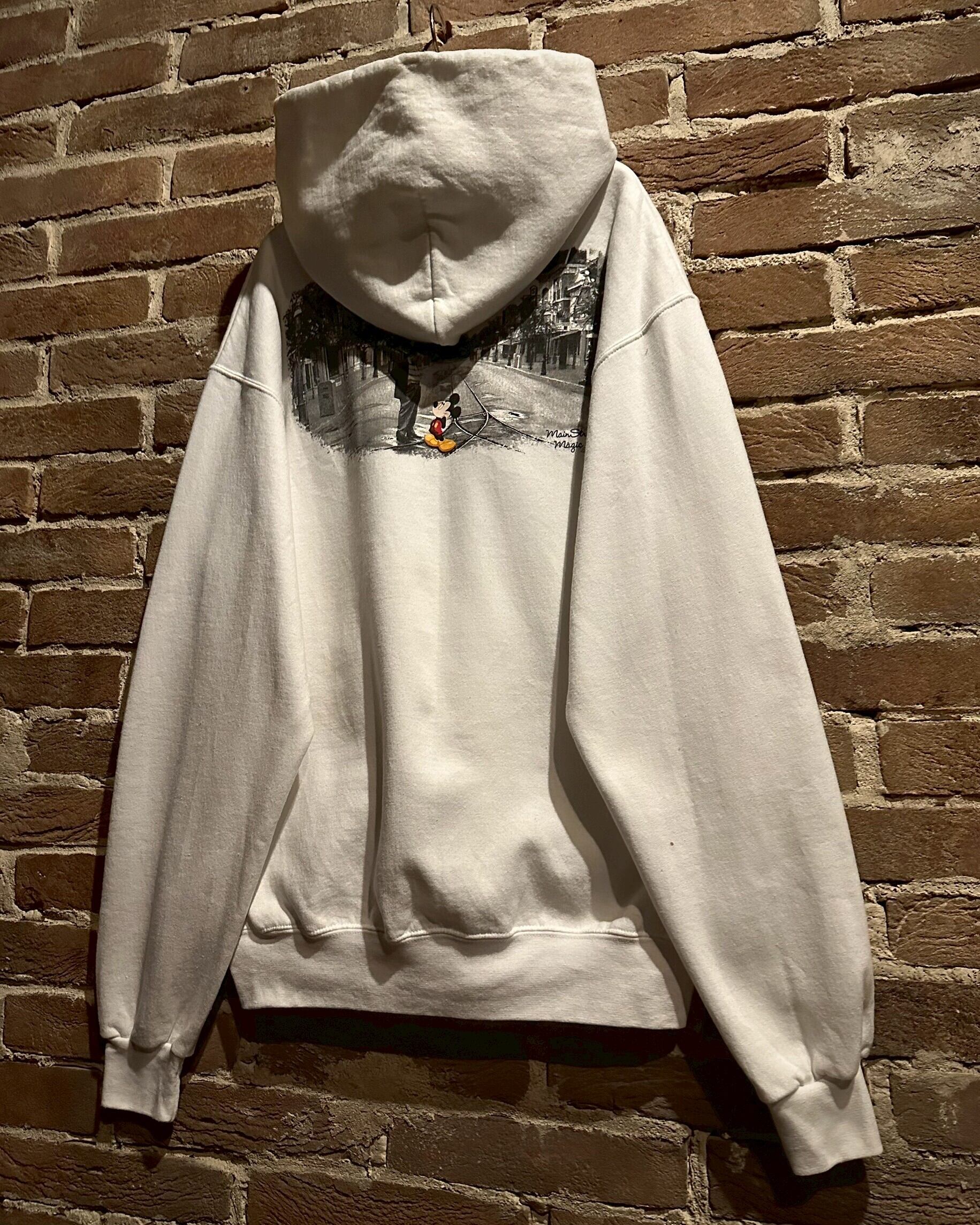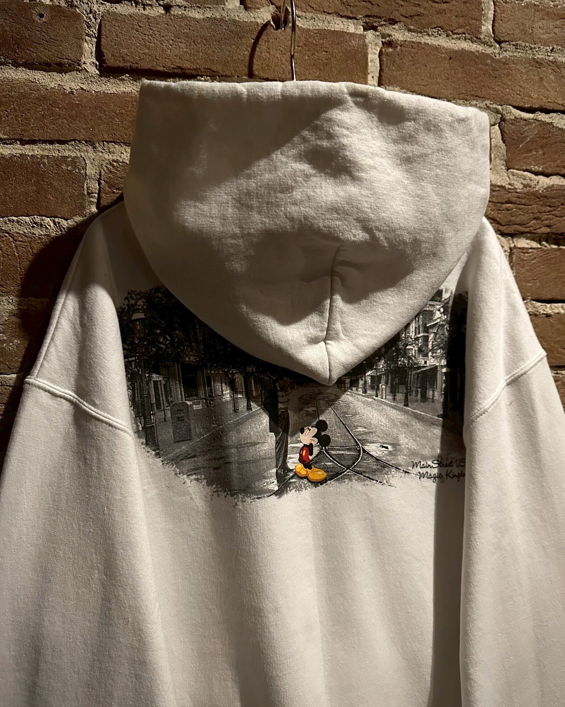コシのあるホワイトのボディに、我らがミッキーと、その生みの親"ウォルト・ディズニー"が仲睦まじく見つめ合うようにプリントされたジップアップフーディ。