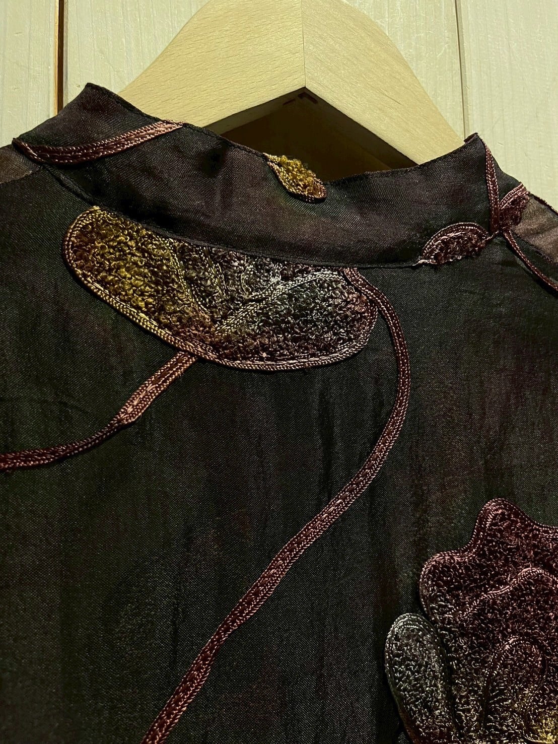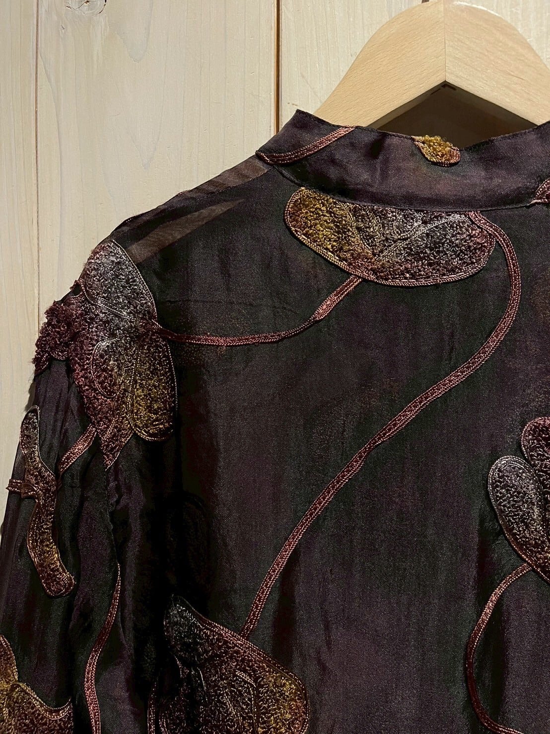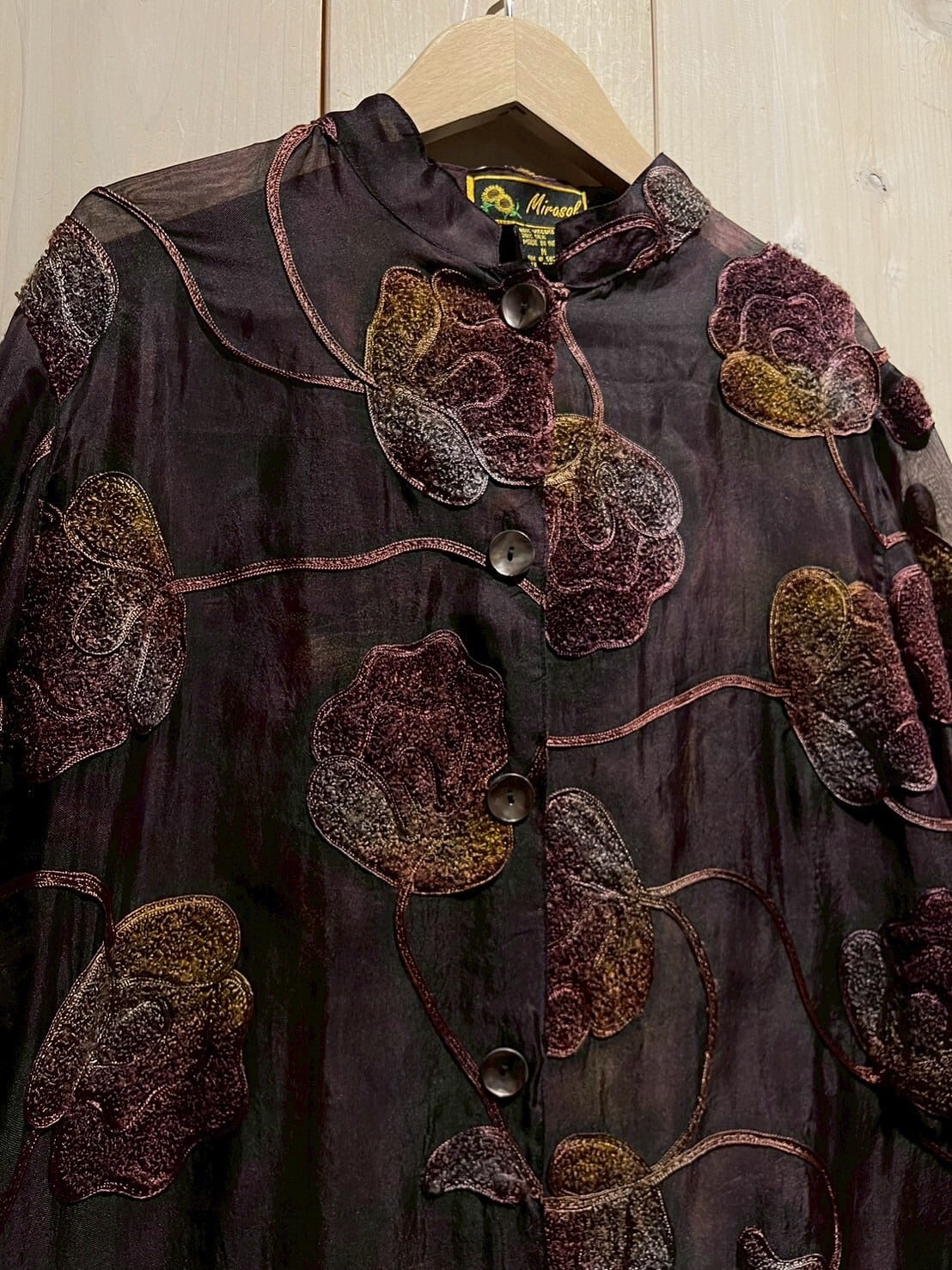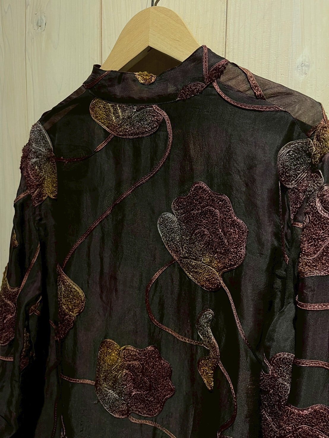 透け感の美しいシアーのボディに、グラデーションがかった花モチーフのワッペンを載せたシアーシャツジャケット。