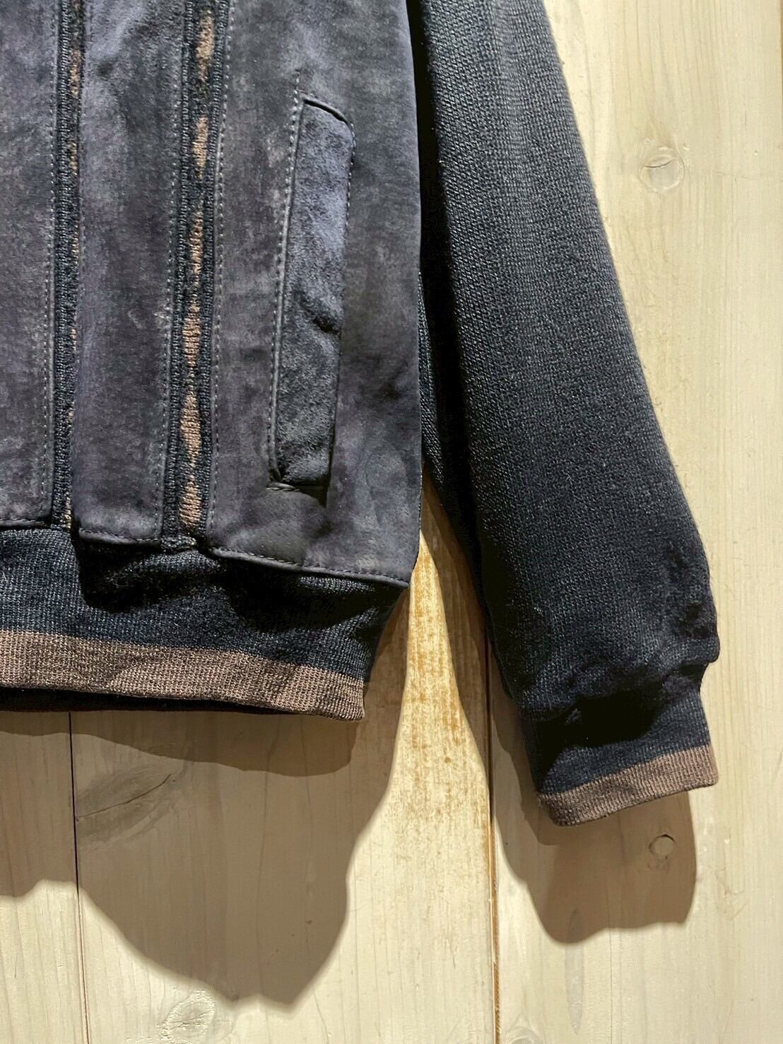 ネイビーのニットボディに、フロント、背面ヨークにしっとりと柔らかくフェード感の美しいスエードレザーを切り替えたカーディガンジャケット。