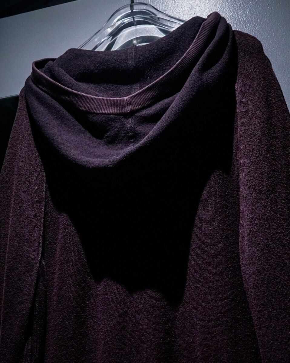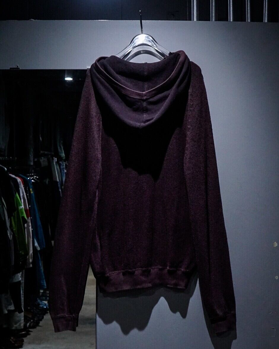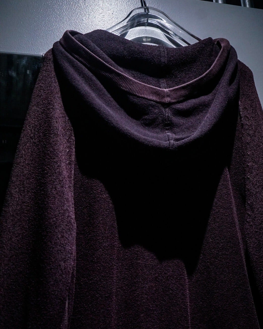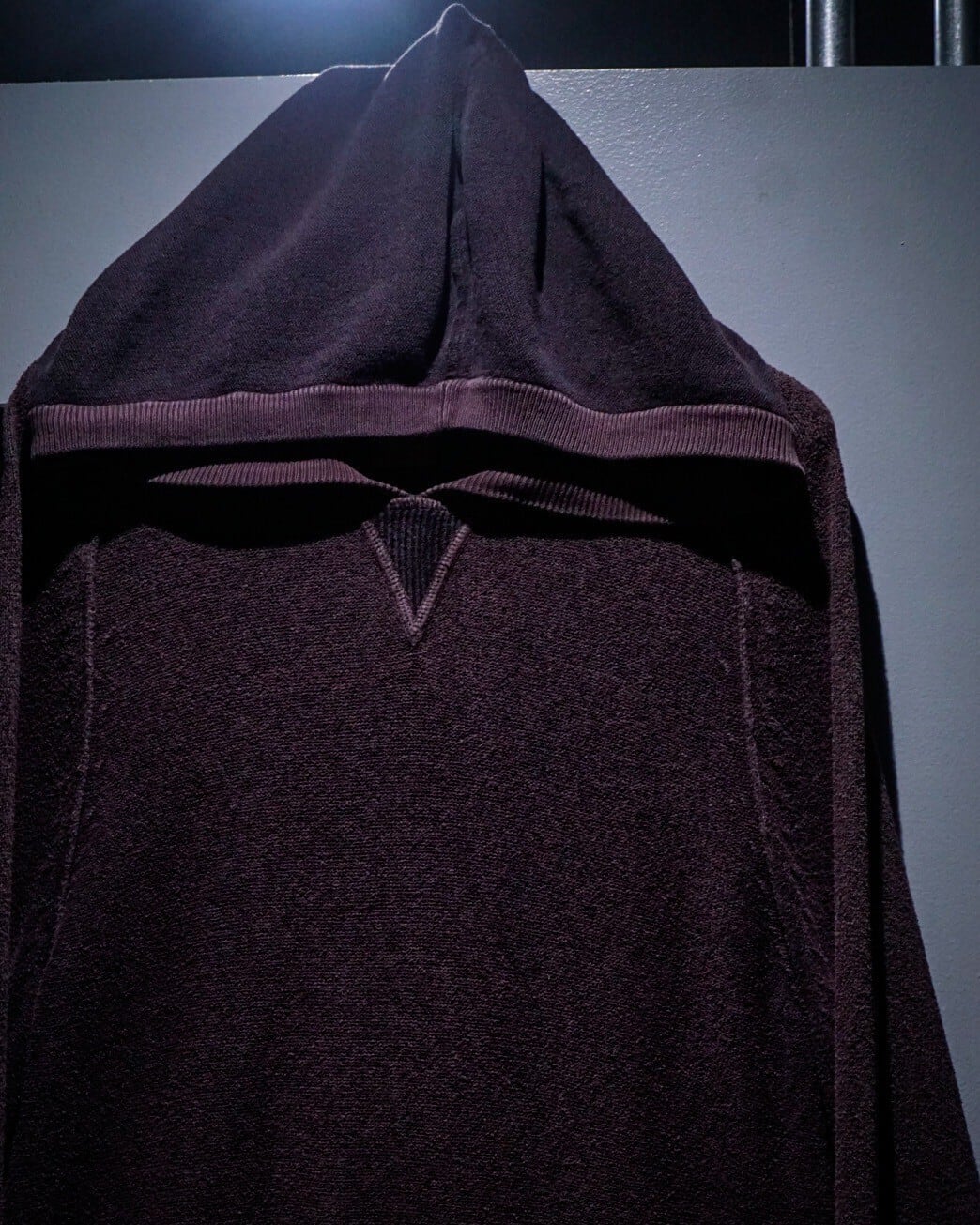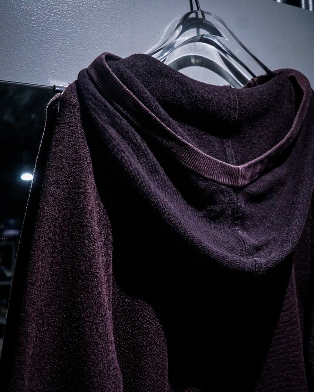 薄くサラッとしたパイル地のニット素材を用いたワインレッドのニットフーディー。