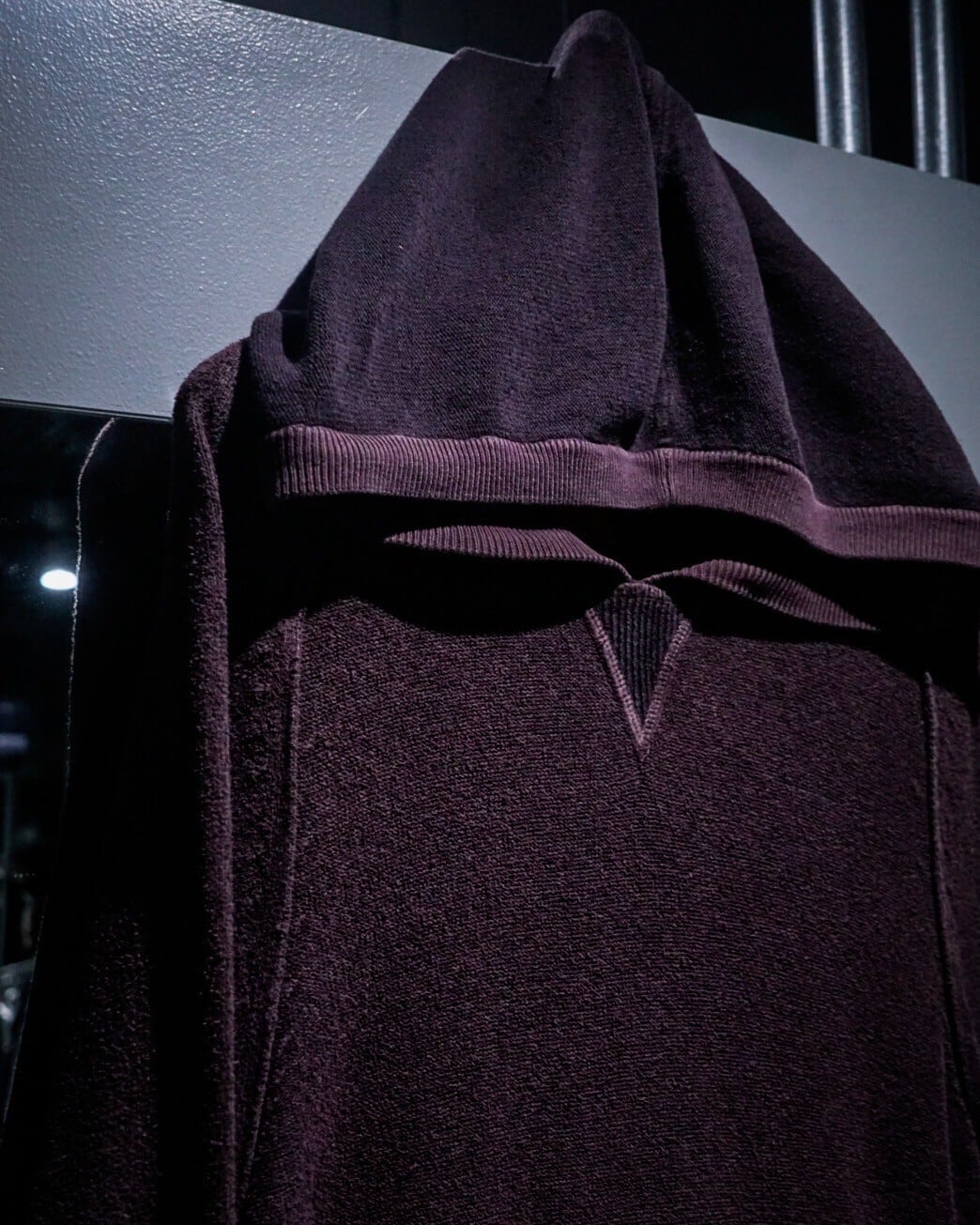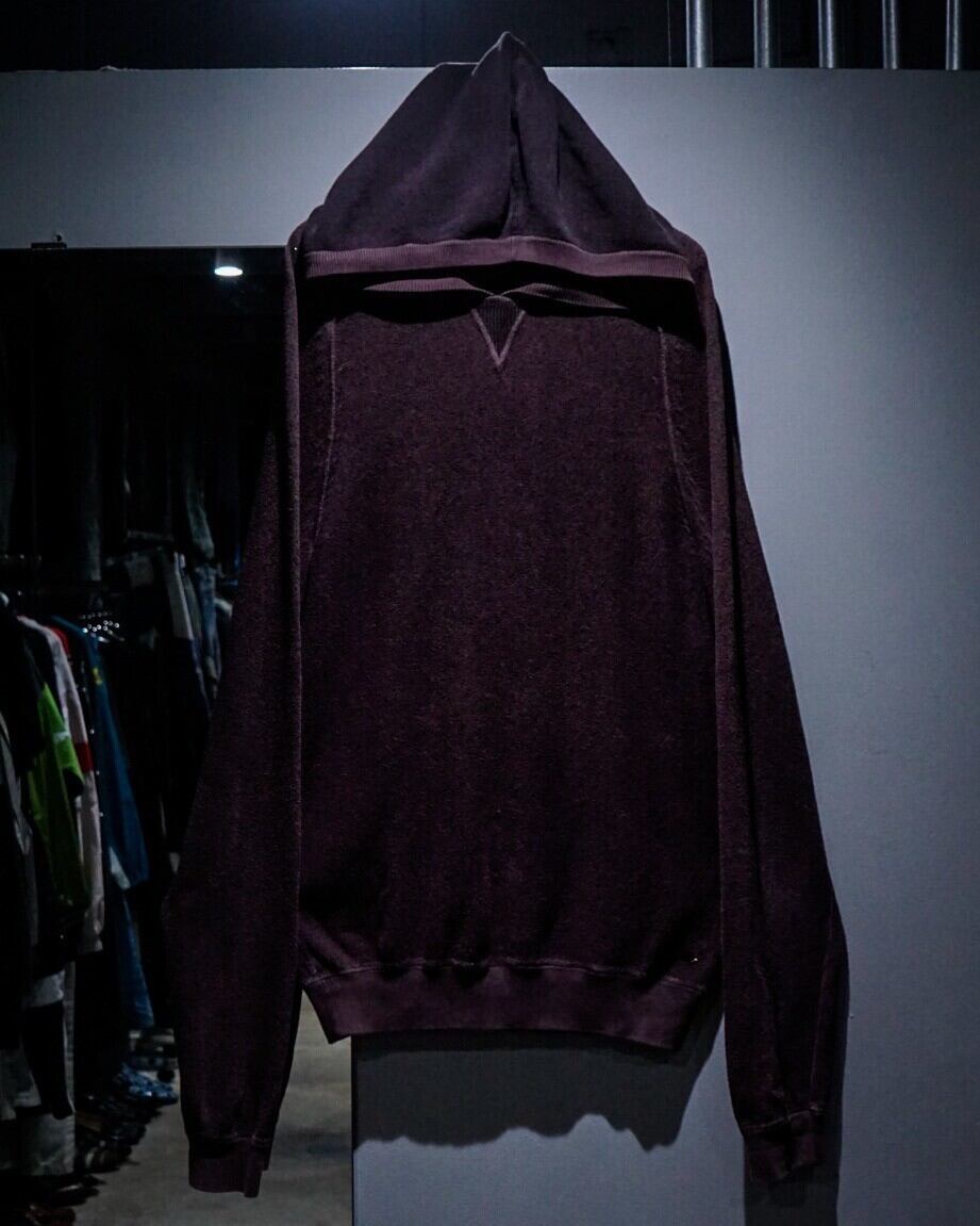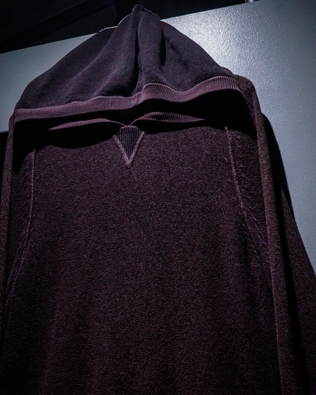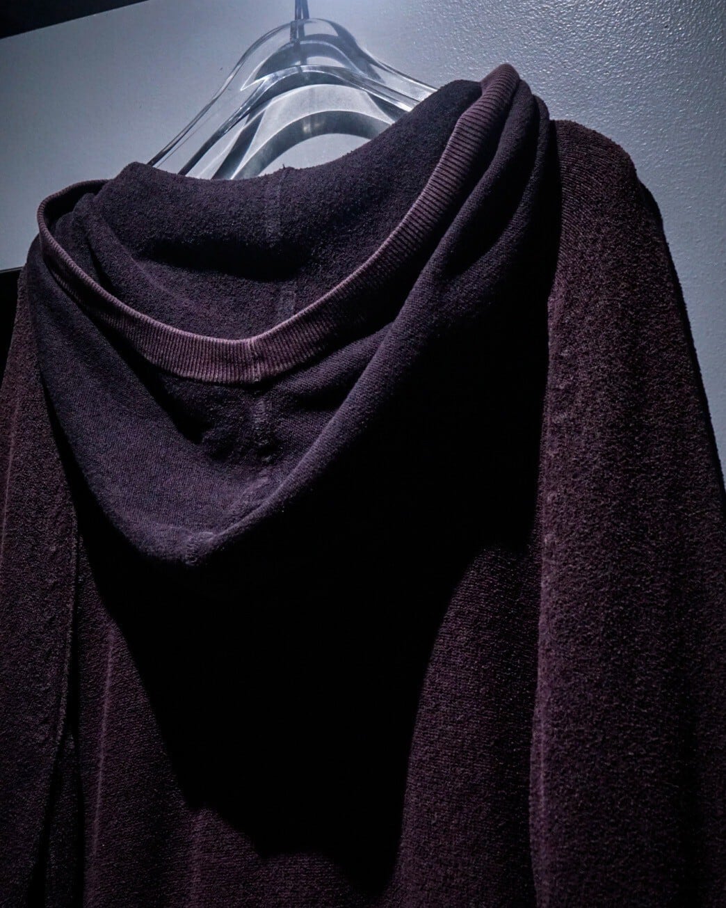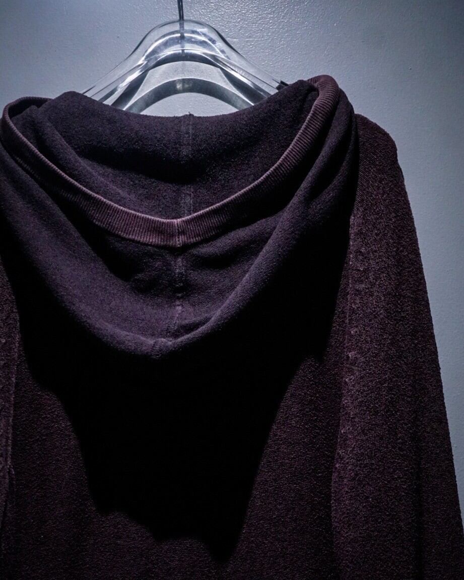 薄くサラッとしたパイル地のニット素材を用いたワインレッドのニットフーディー。