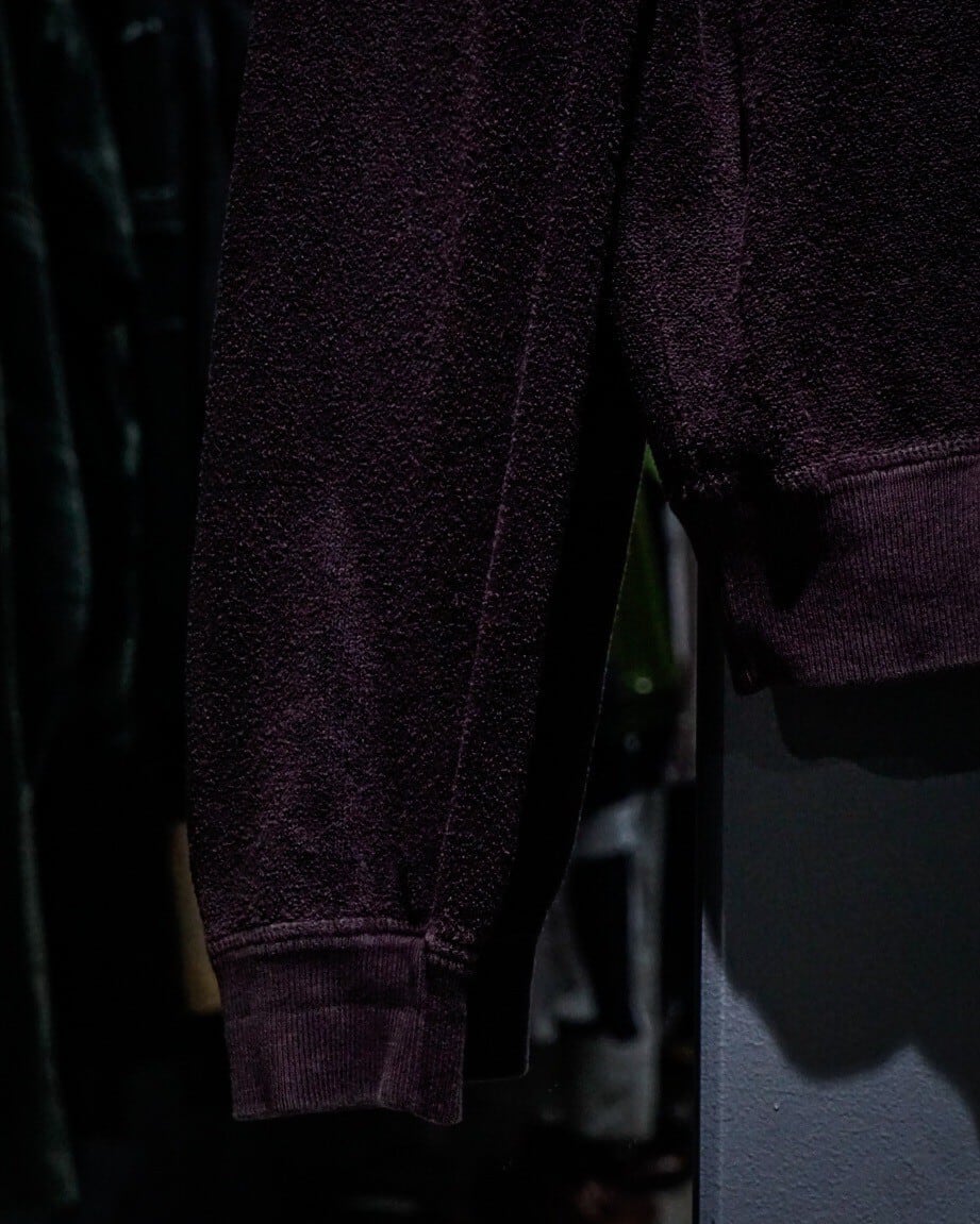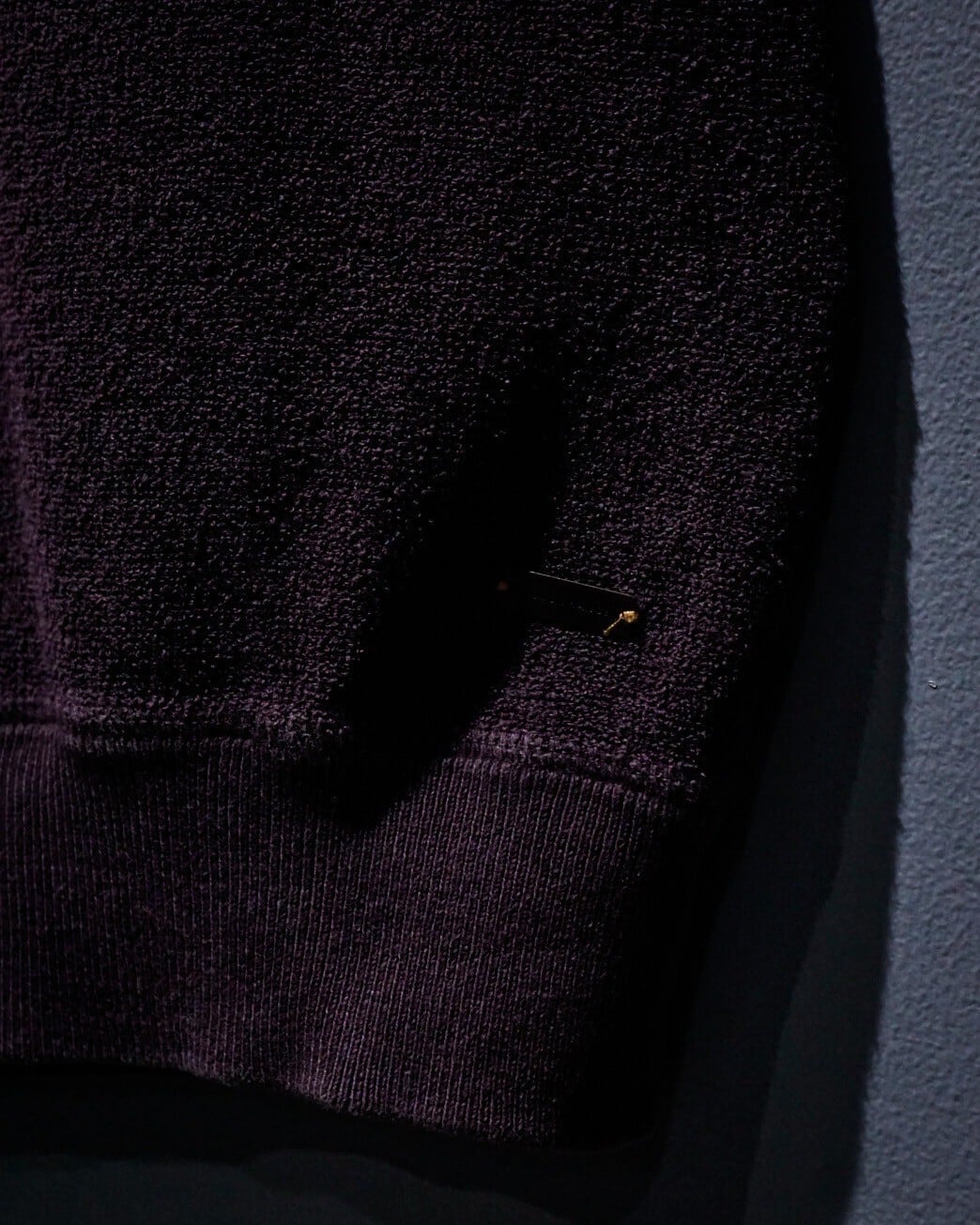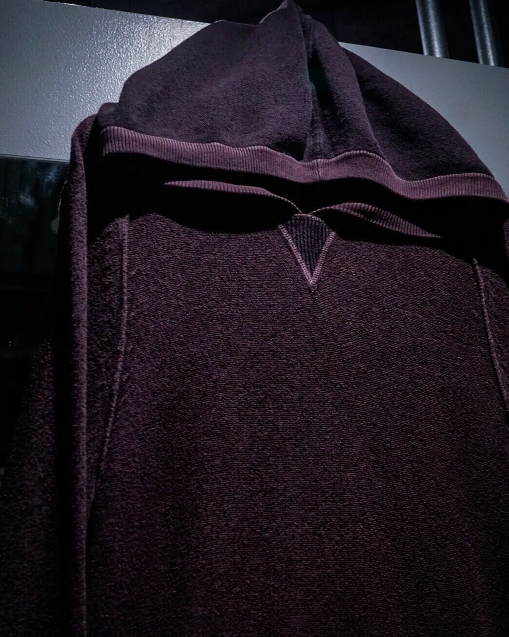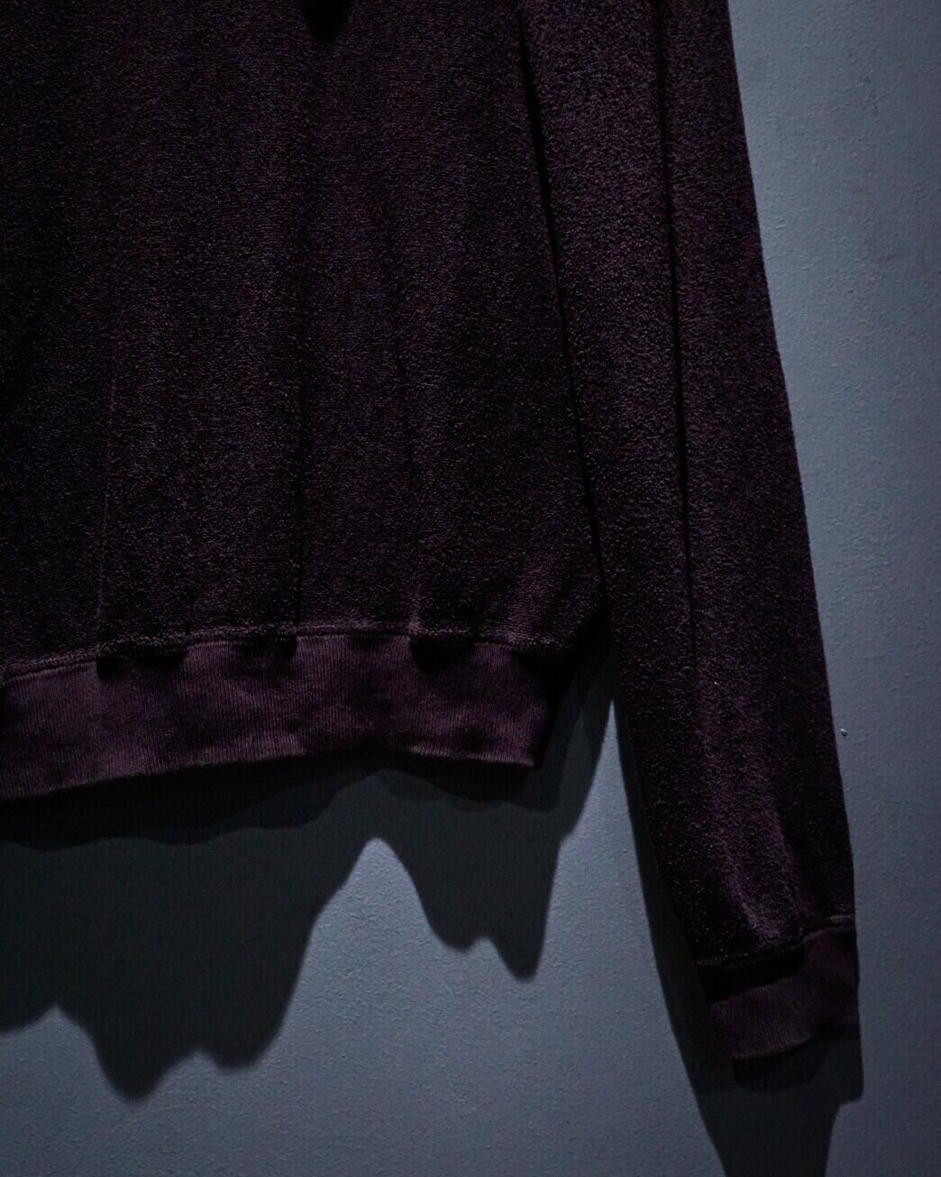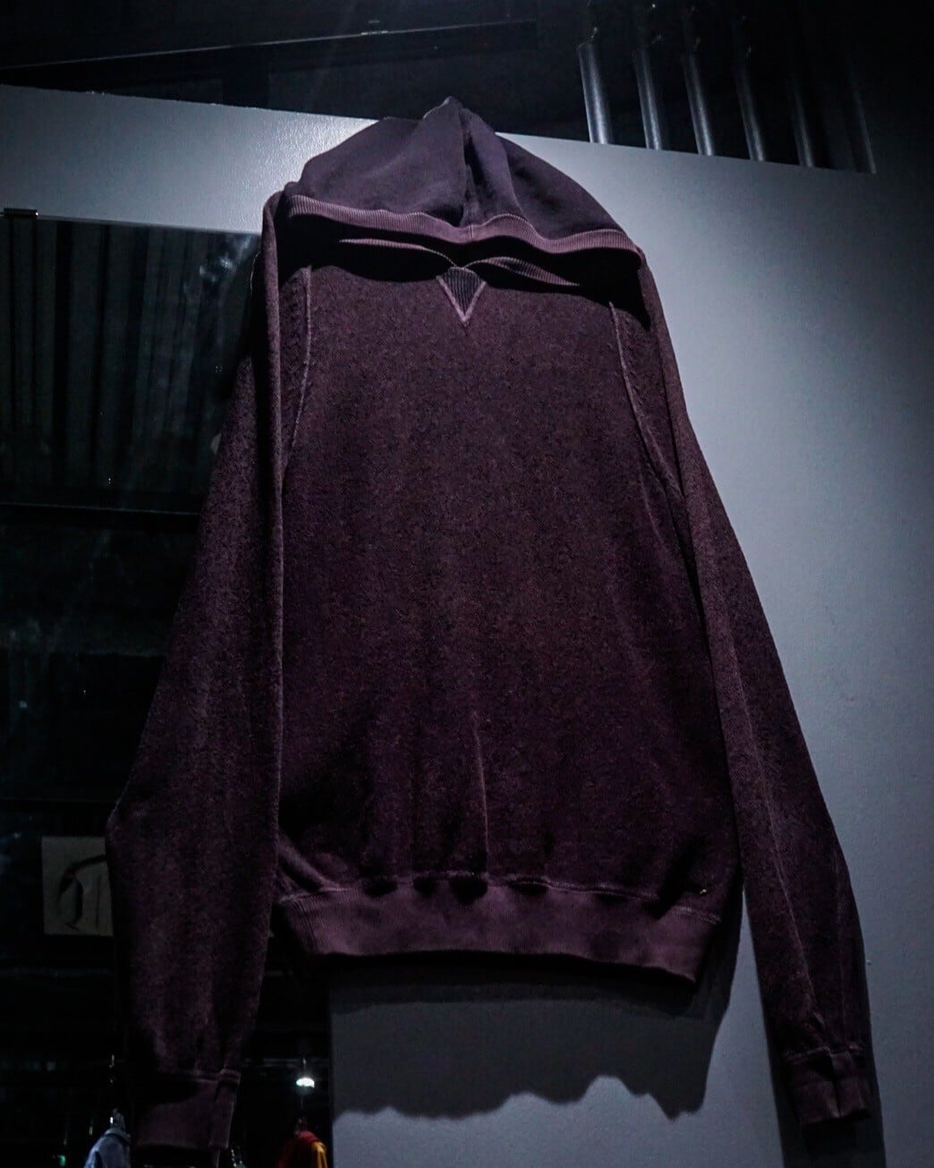 薄くサラッとしたパイル地のニット素材を用いたワインレッドのニットフーディー。