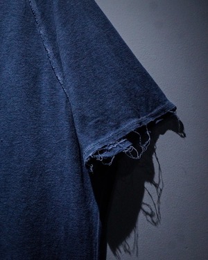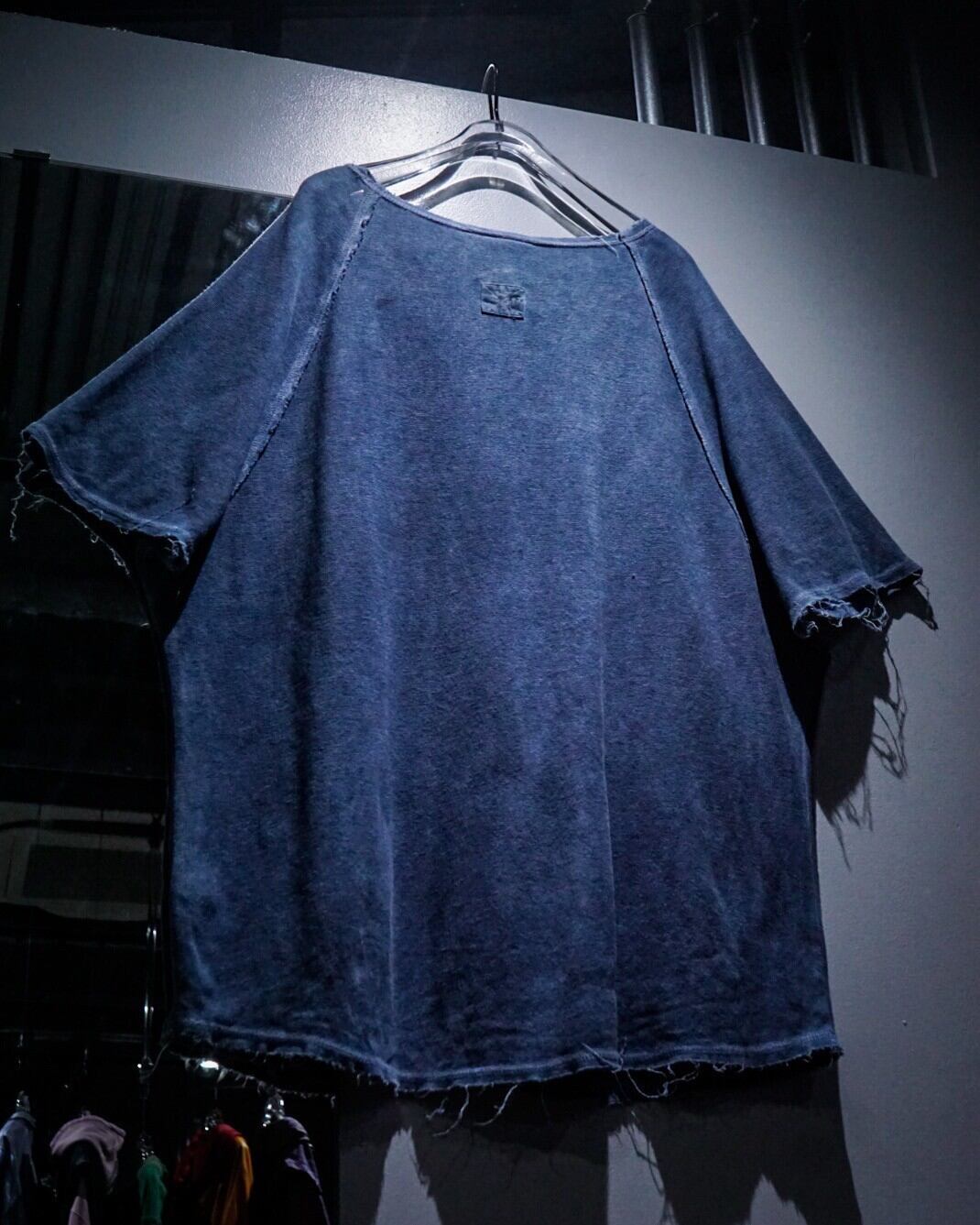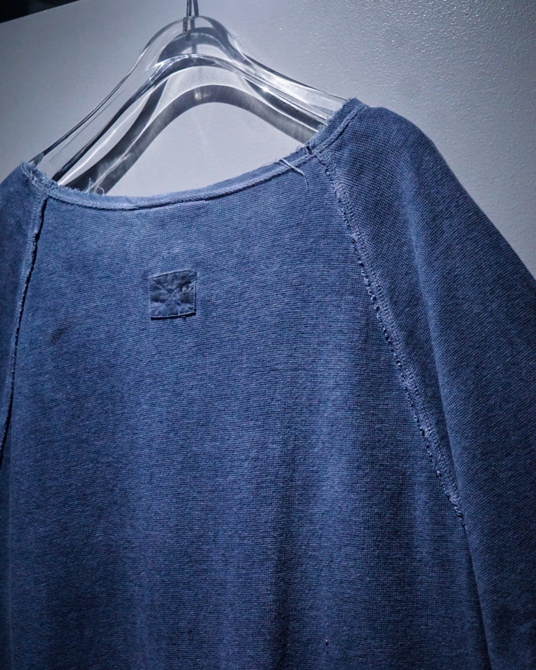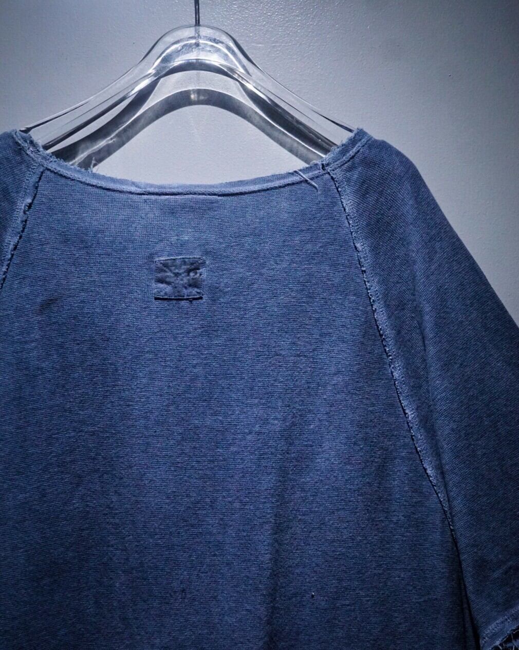 ラグランスリーブ仕様の肩部分のシーム部分はインサイドアウトのディテールをON。袖や裾から垂れるほつれをあえてそのままにすることで動きに加え、立体的な奥行きを生み出してくれています。