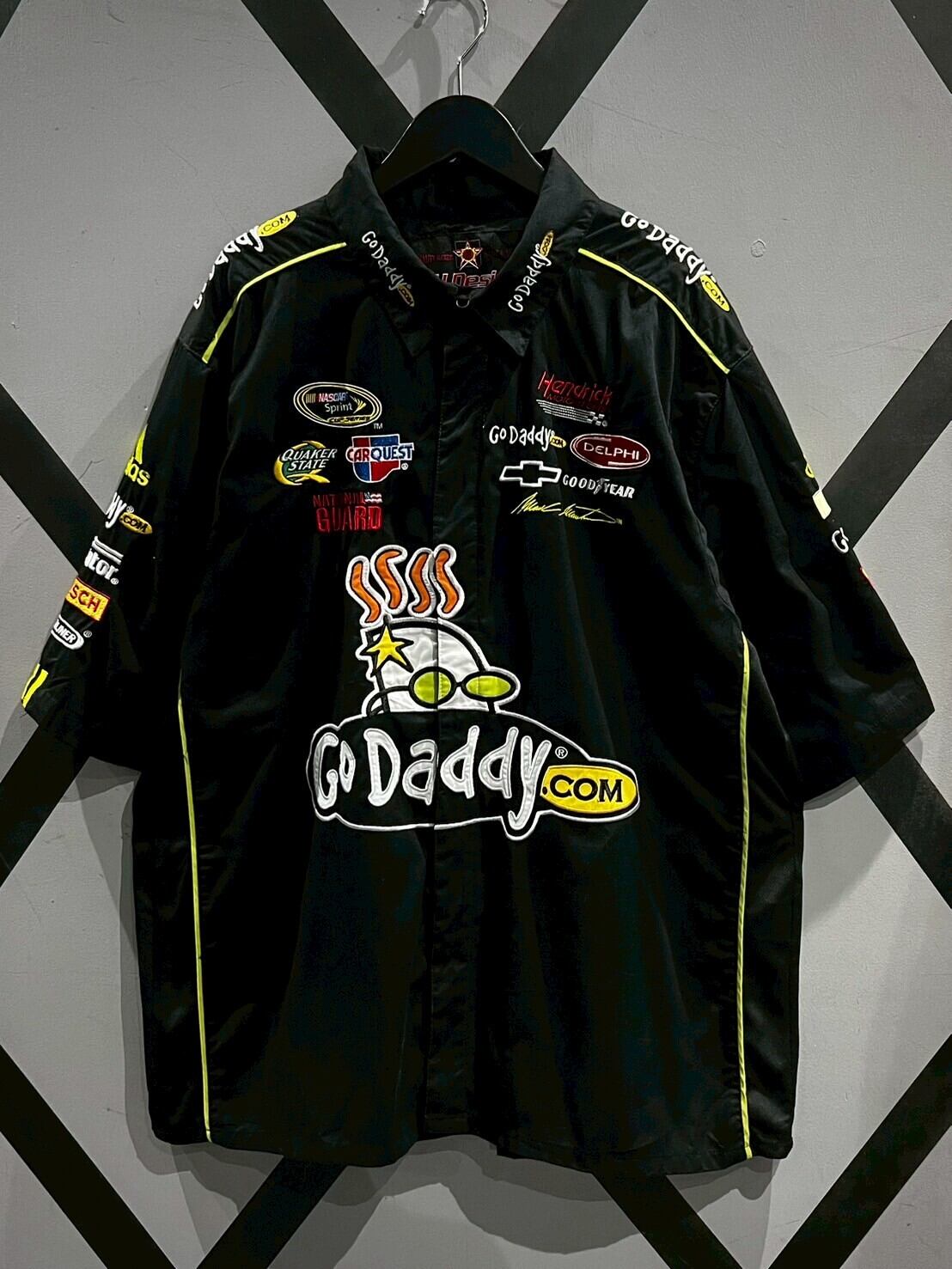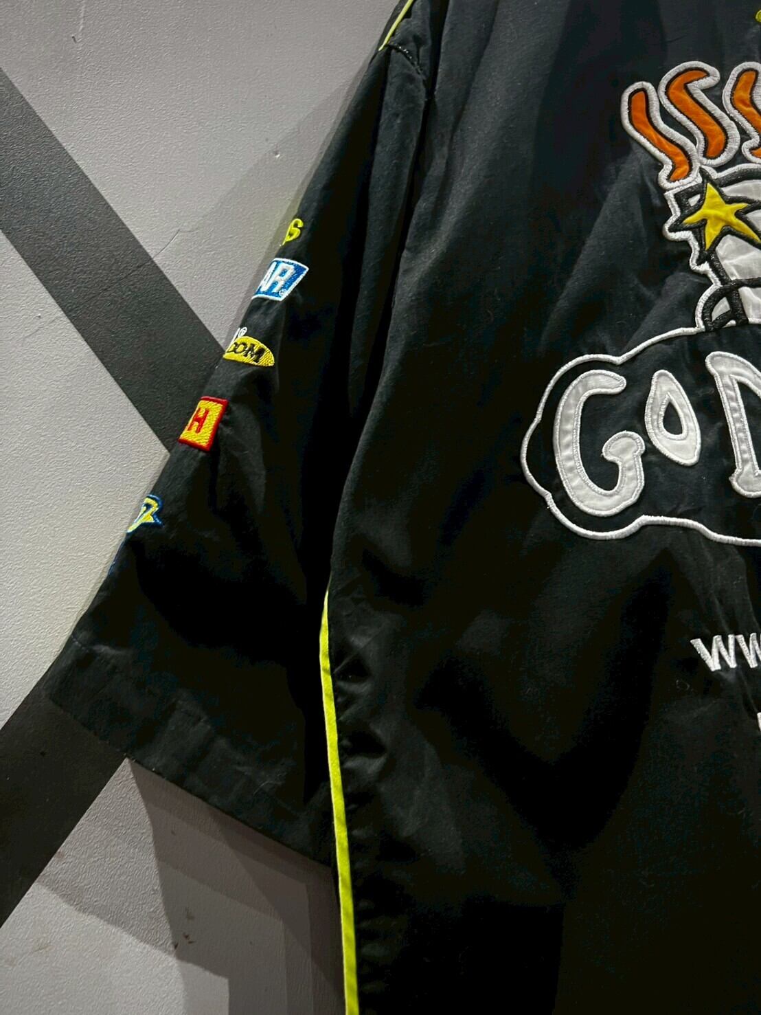 ブラックのボディをベースに、フロント、アーム、背面に協賛企業のロゴを刺繍やワッペンで載せた、稀少なレーシングモノの半袖シャツ。