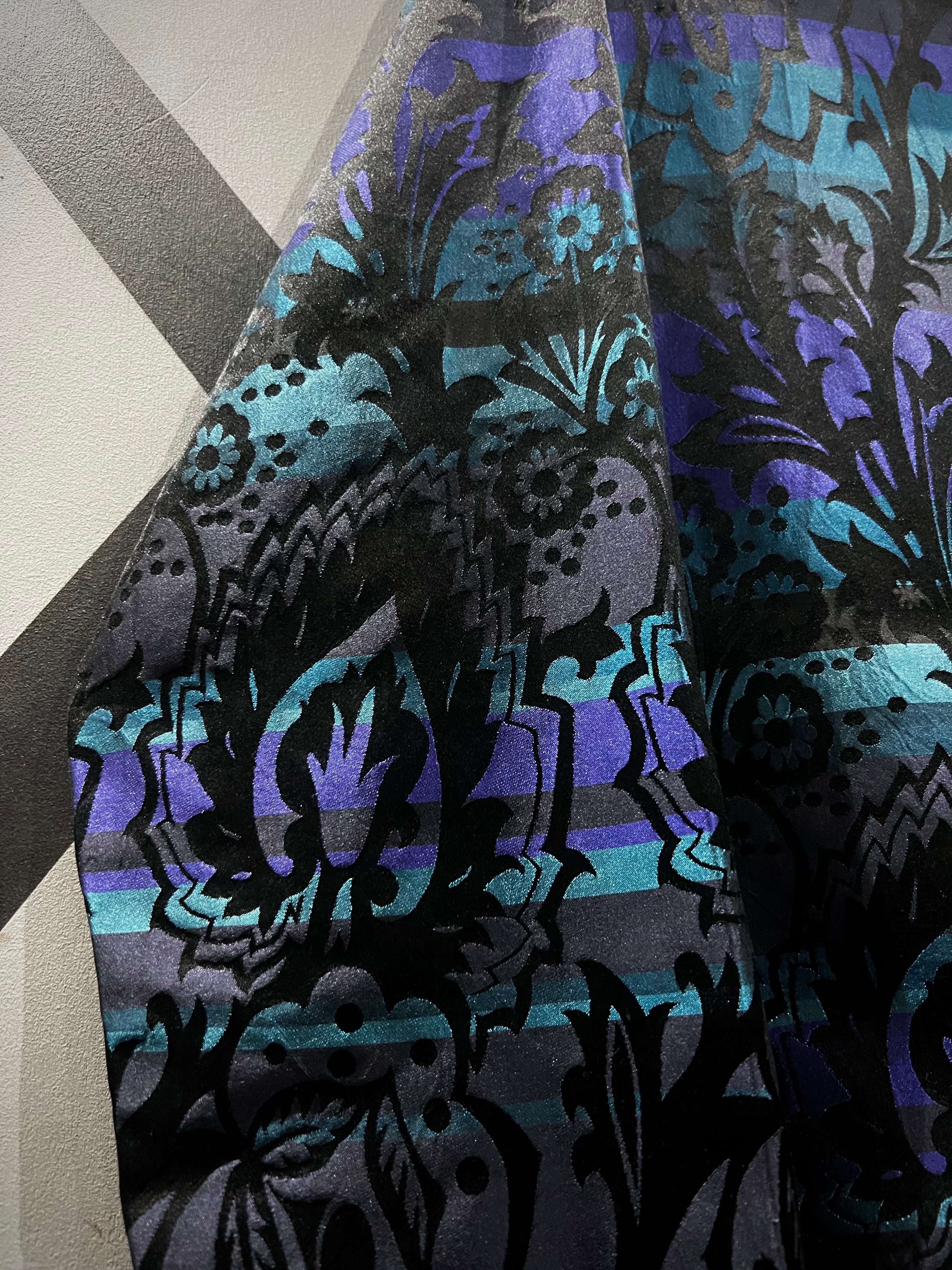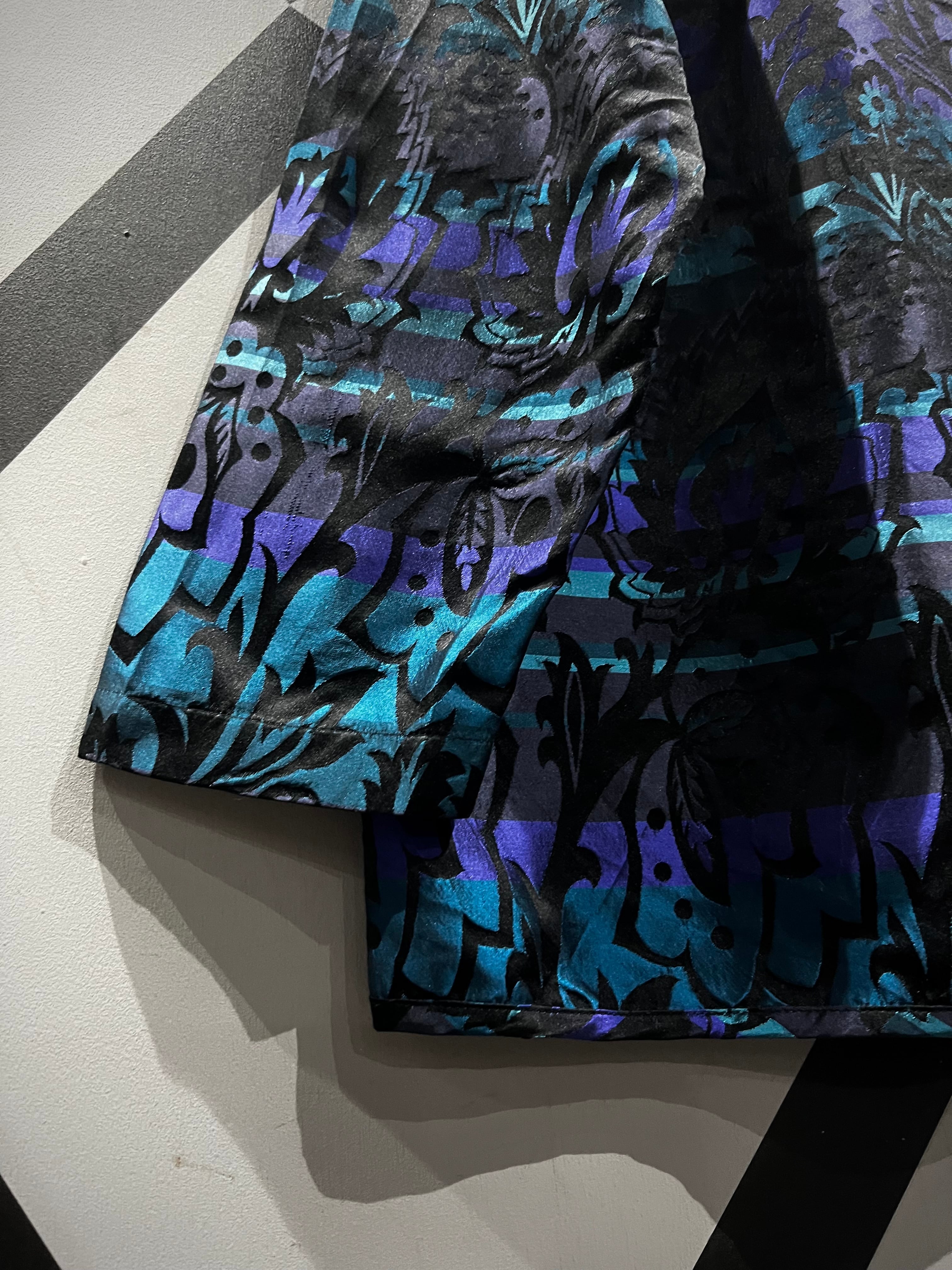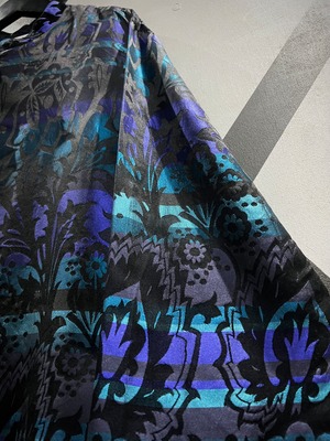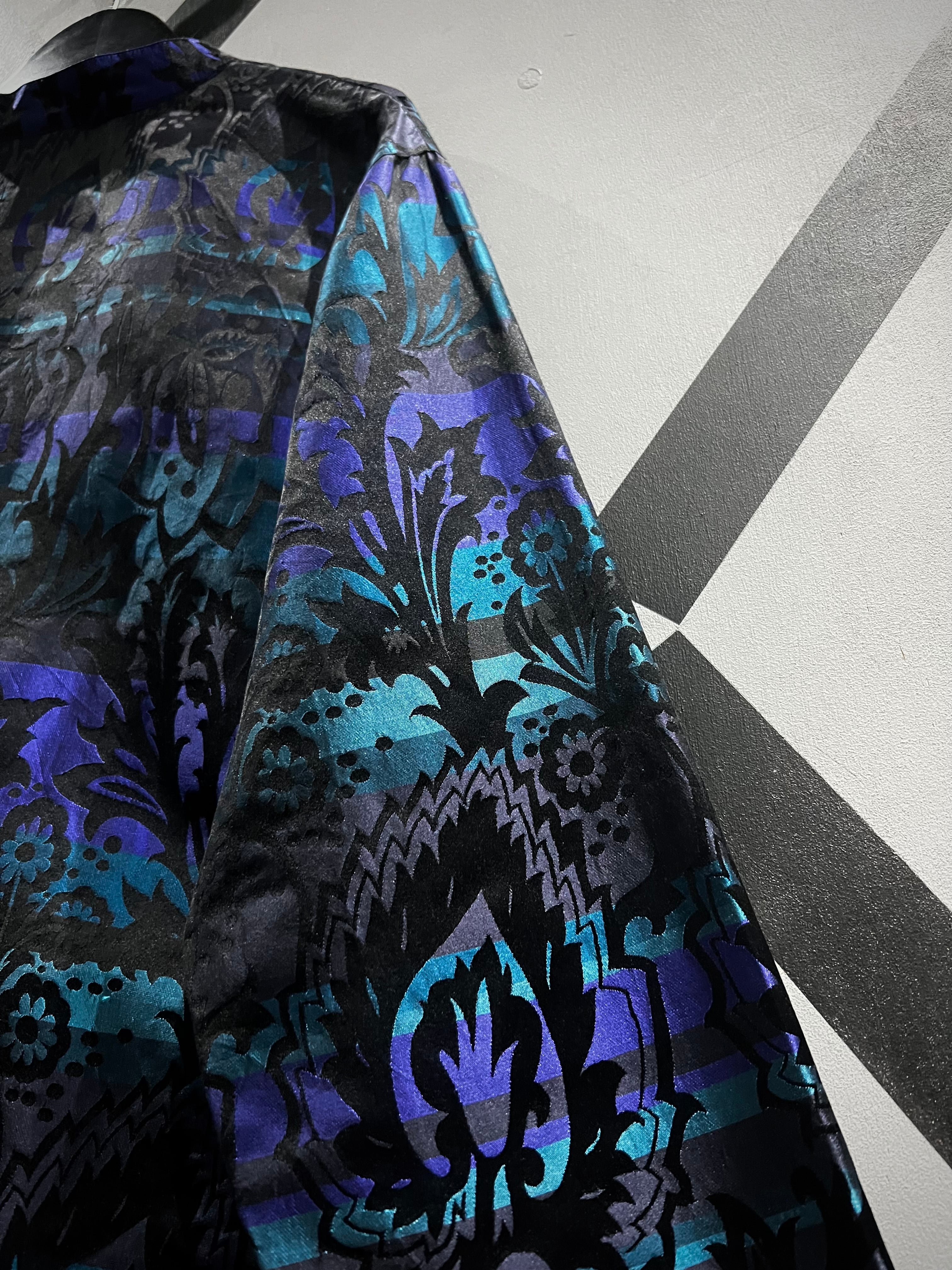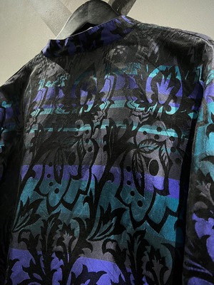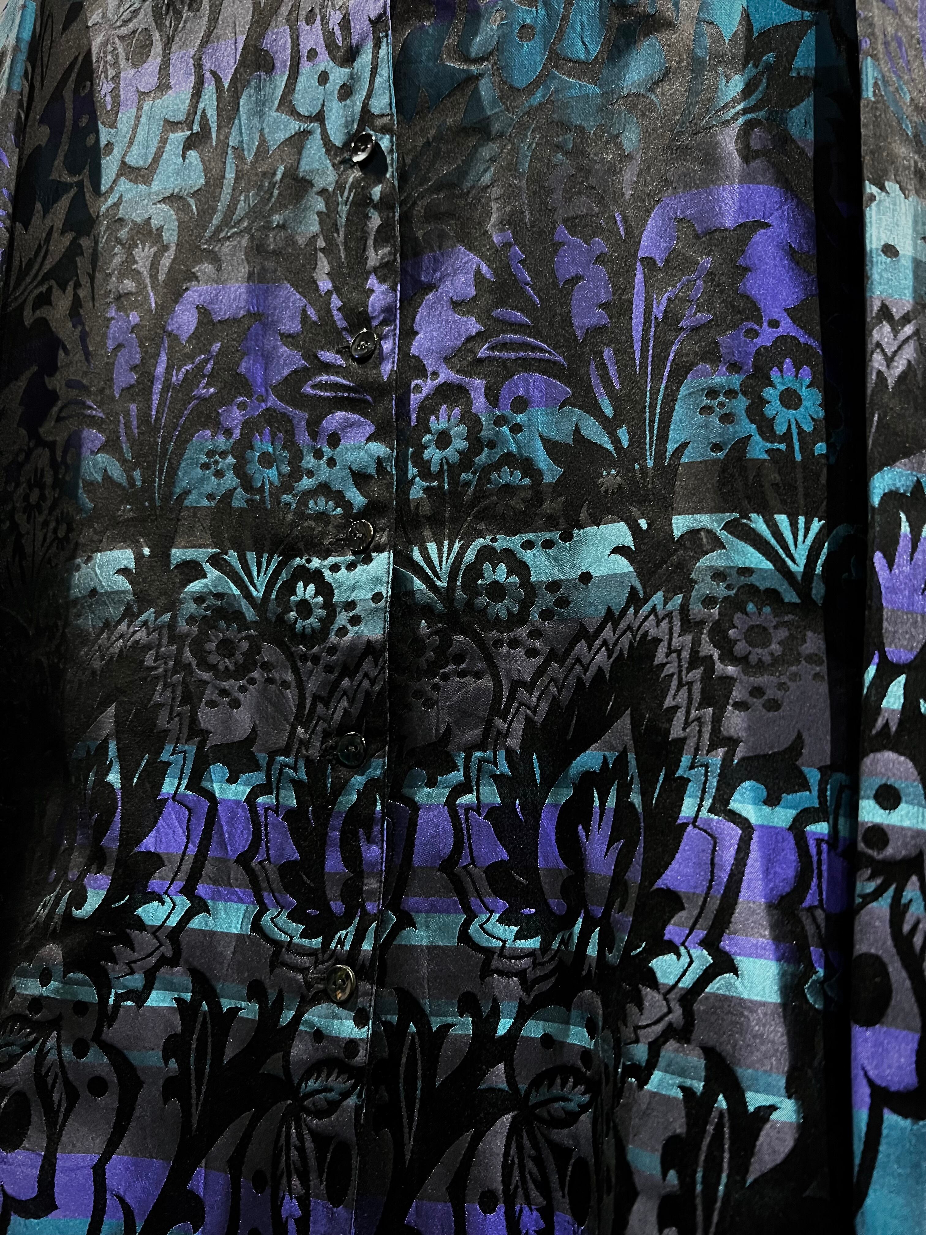 ハリがありながらも軽やかで滑らかな、上質なシルク素材を用いて黒、青紫、水色の美しいカラーリングで切り替えたボディに、さらにその上からボタニカル柄をプリントで重ねたシャツジャケット。
