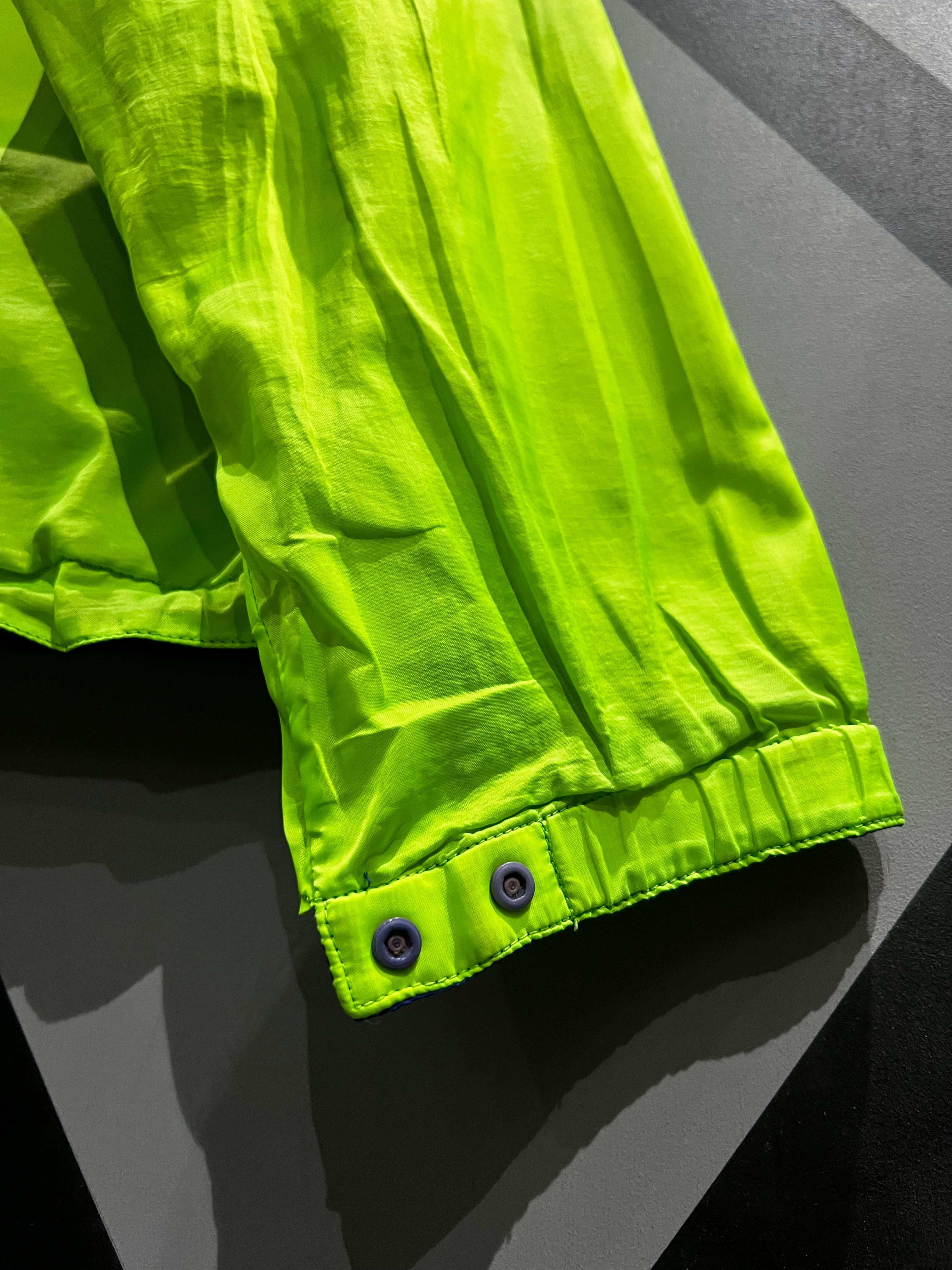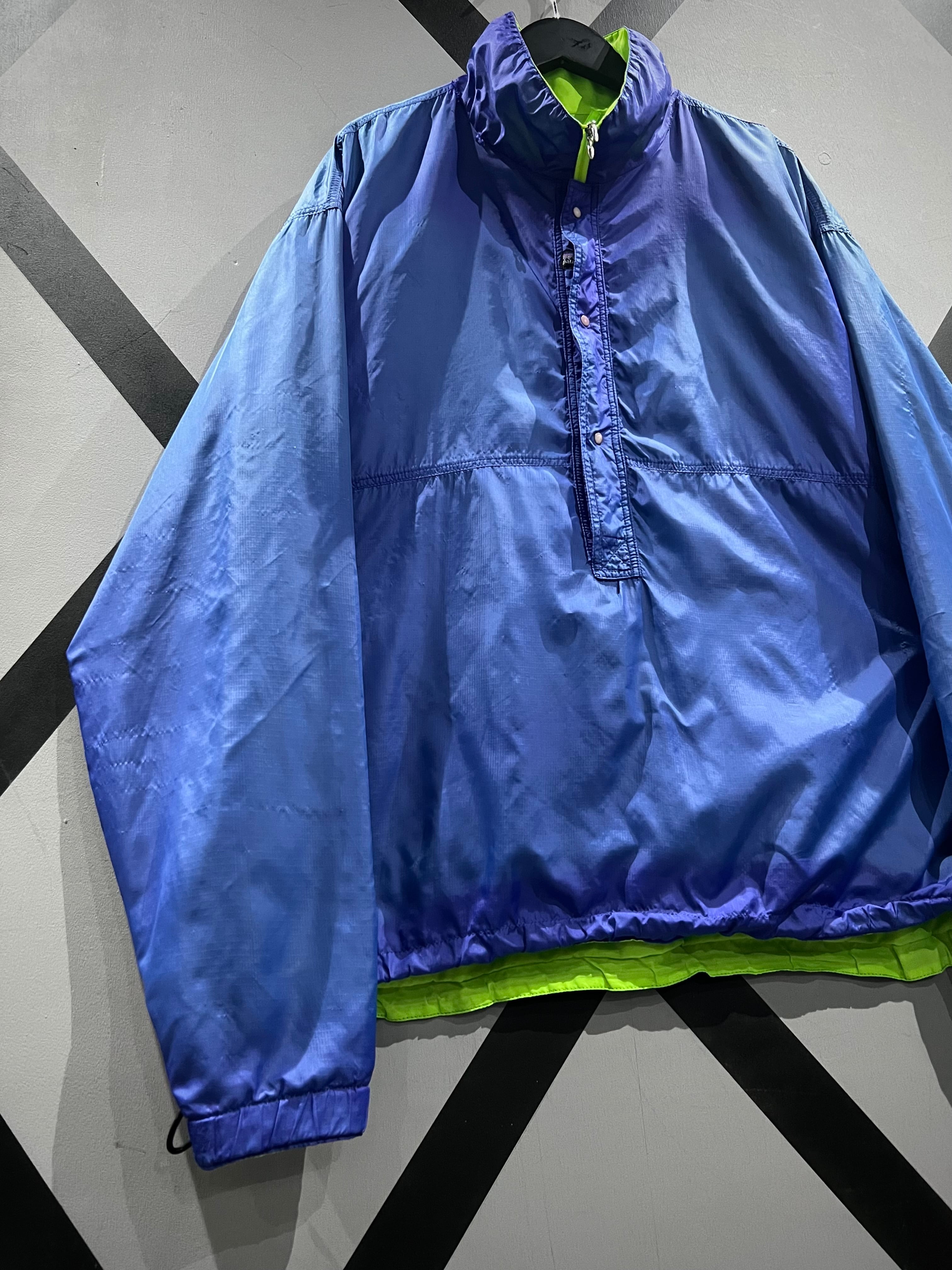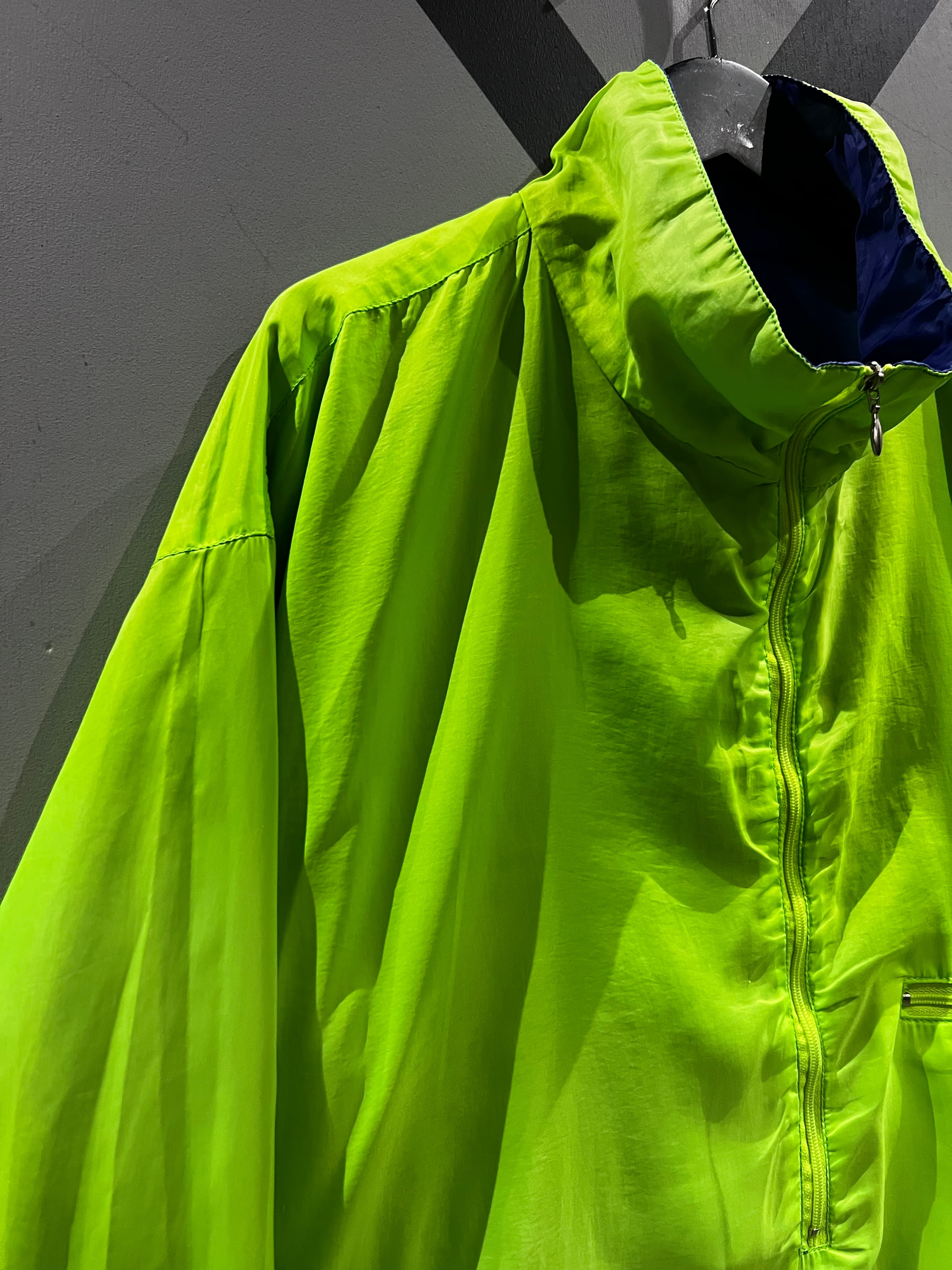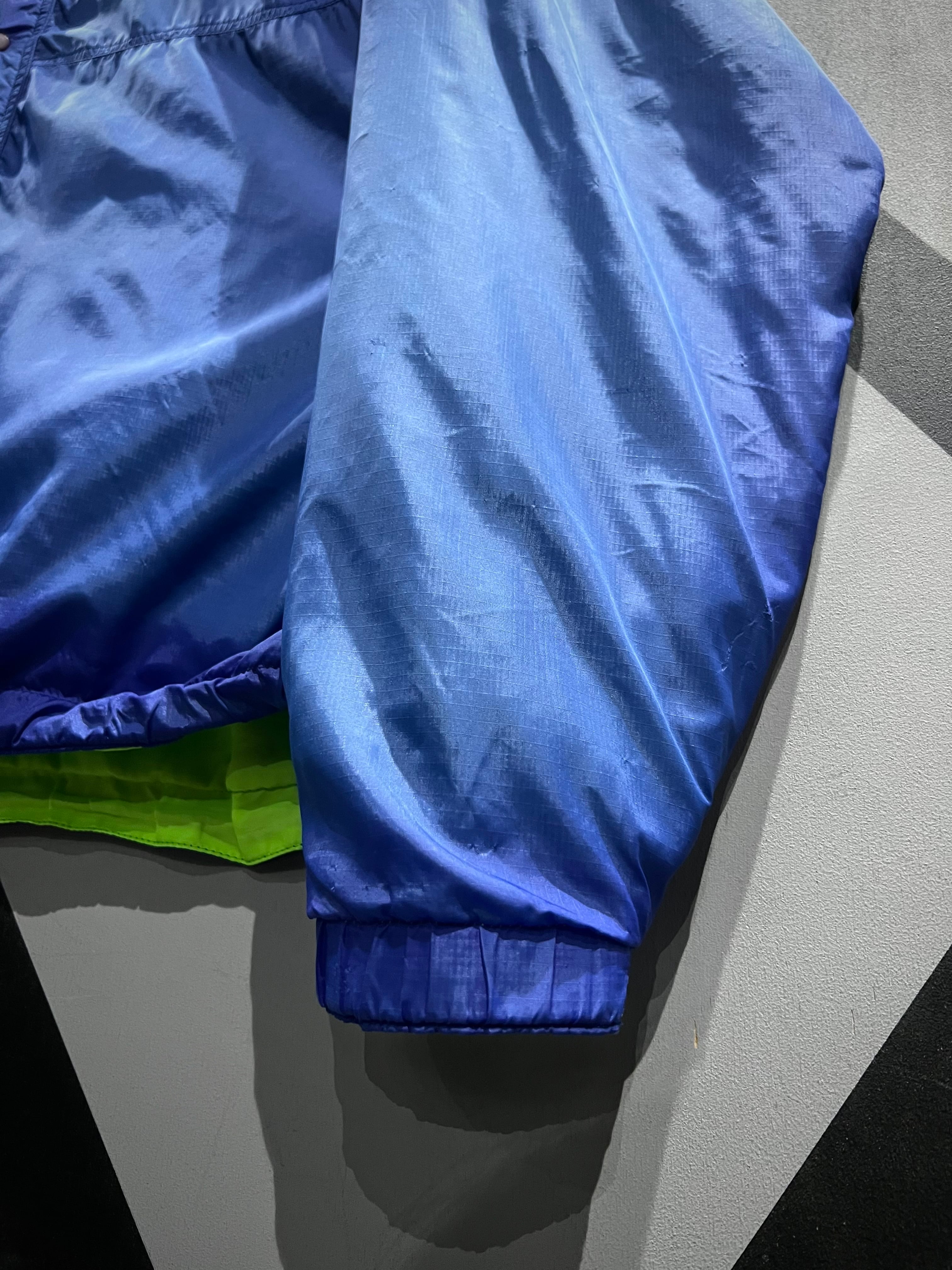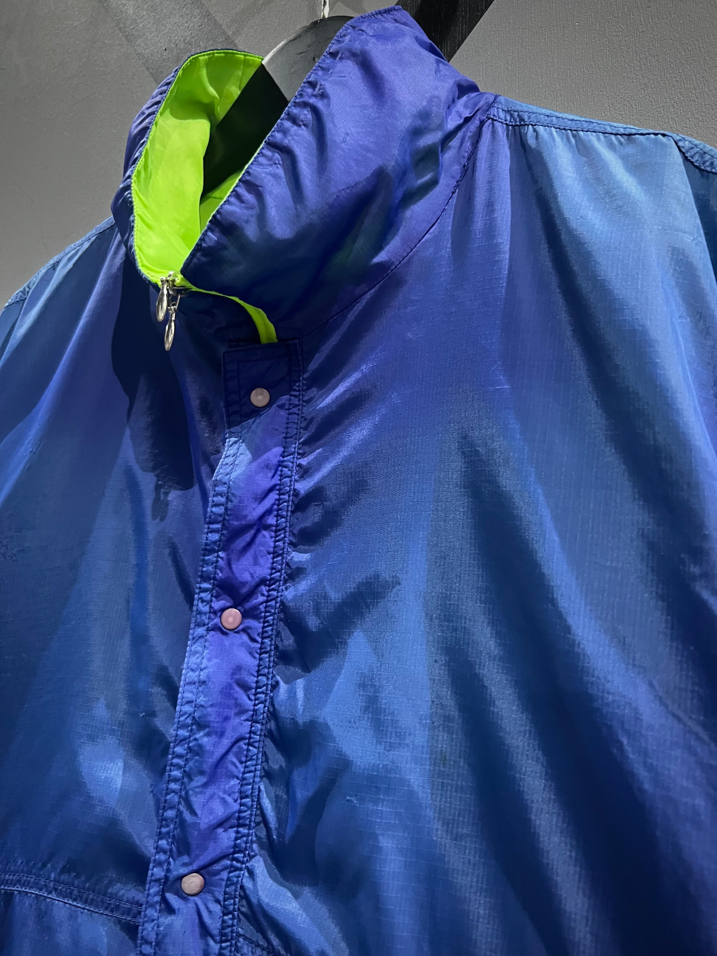 青のリップストップナイロンを用いて、ガバッと裏返すとネオングリーンへと切り替わるプルオーバー。