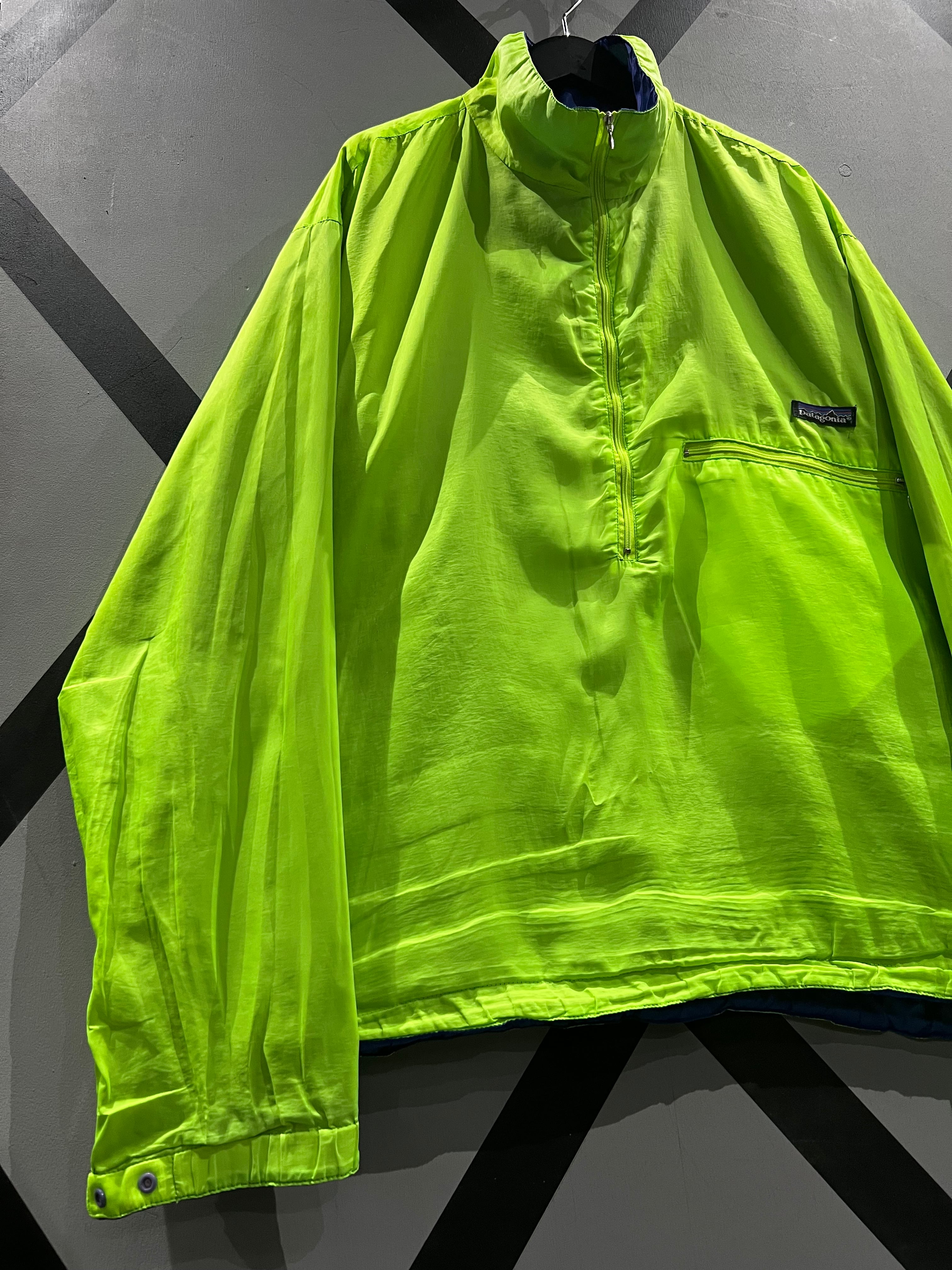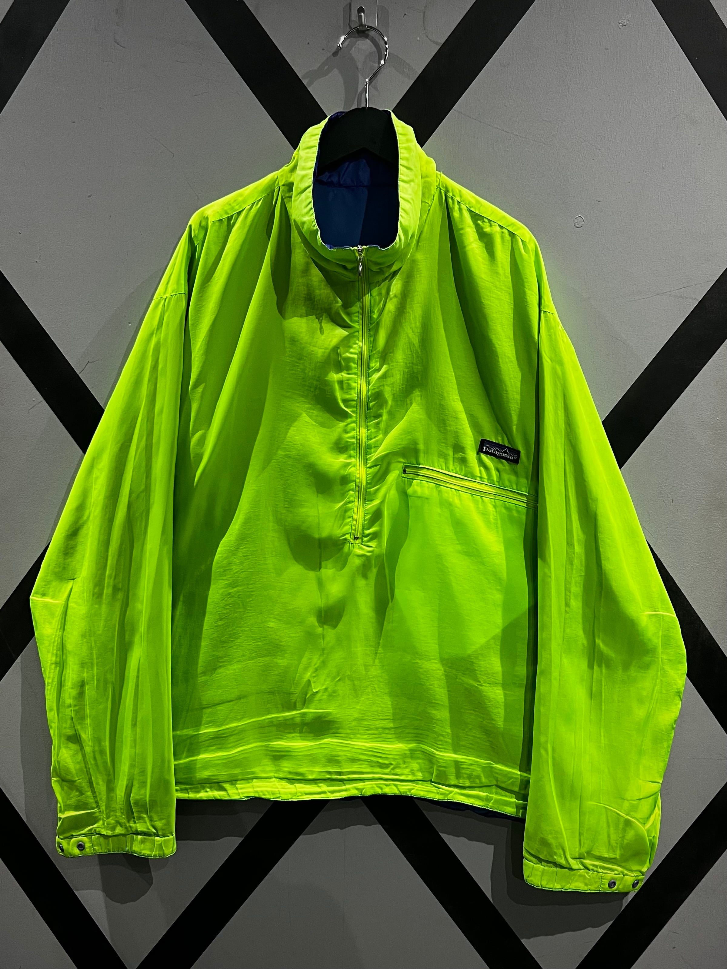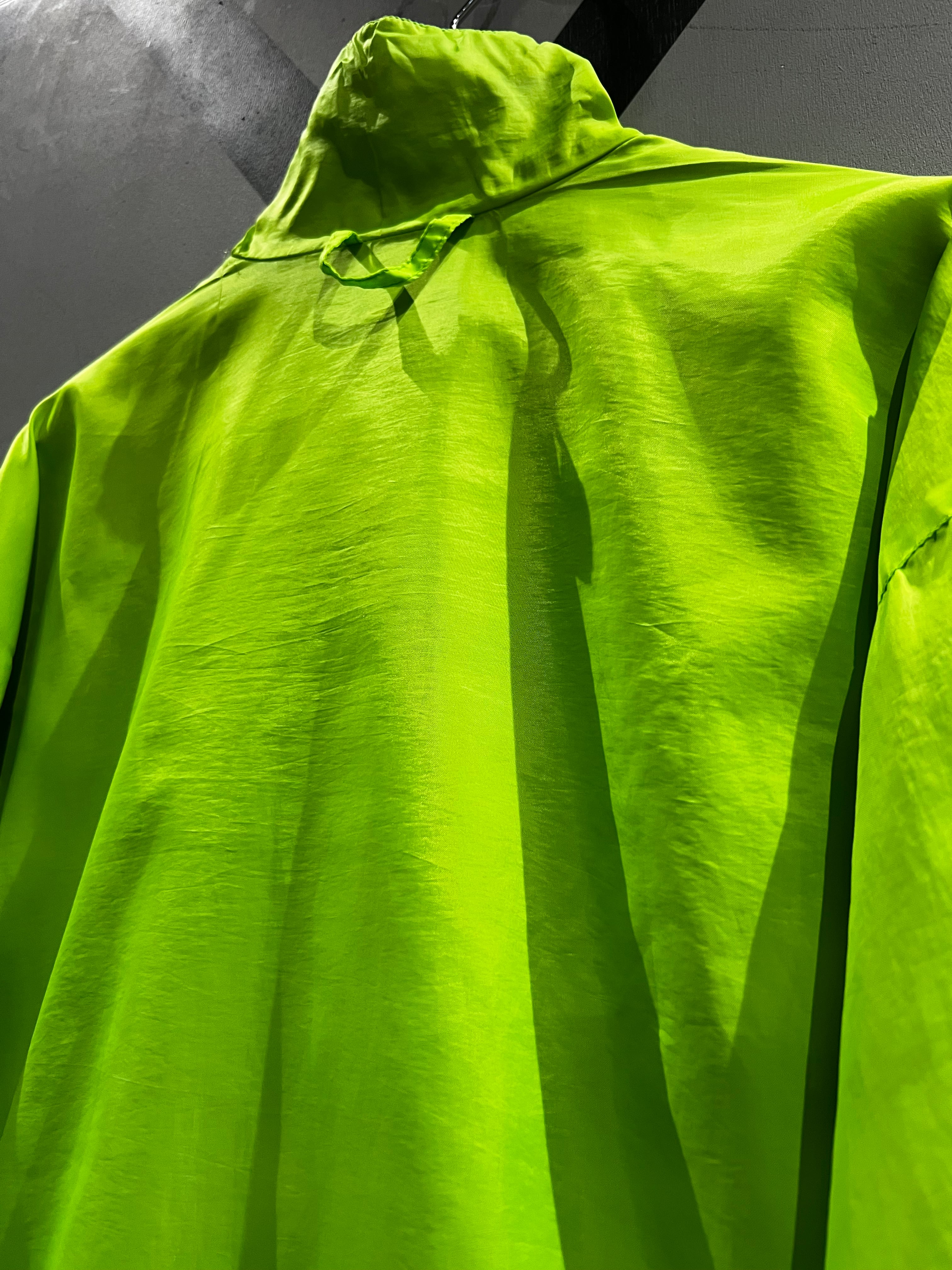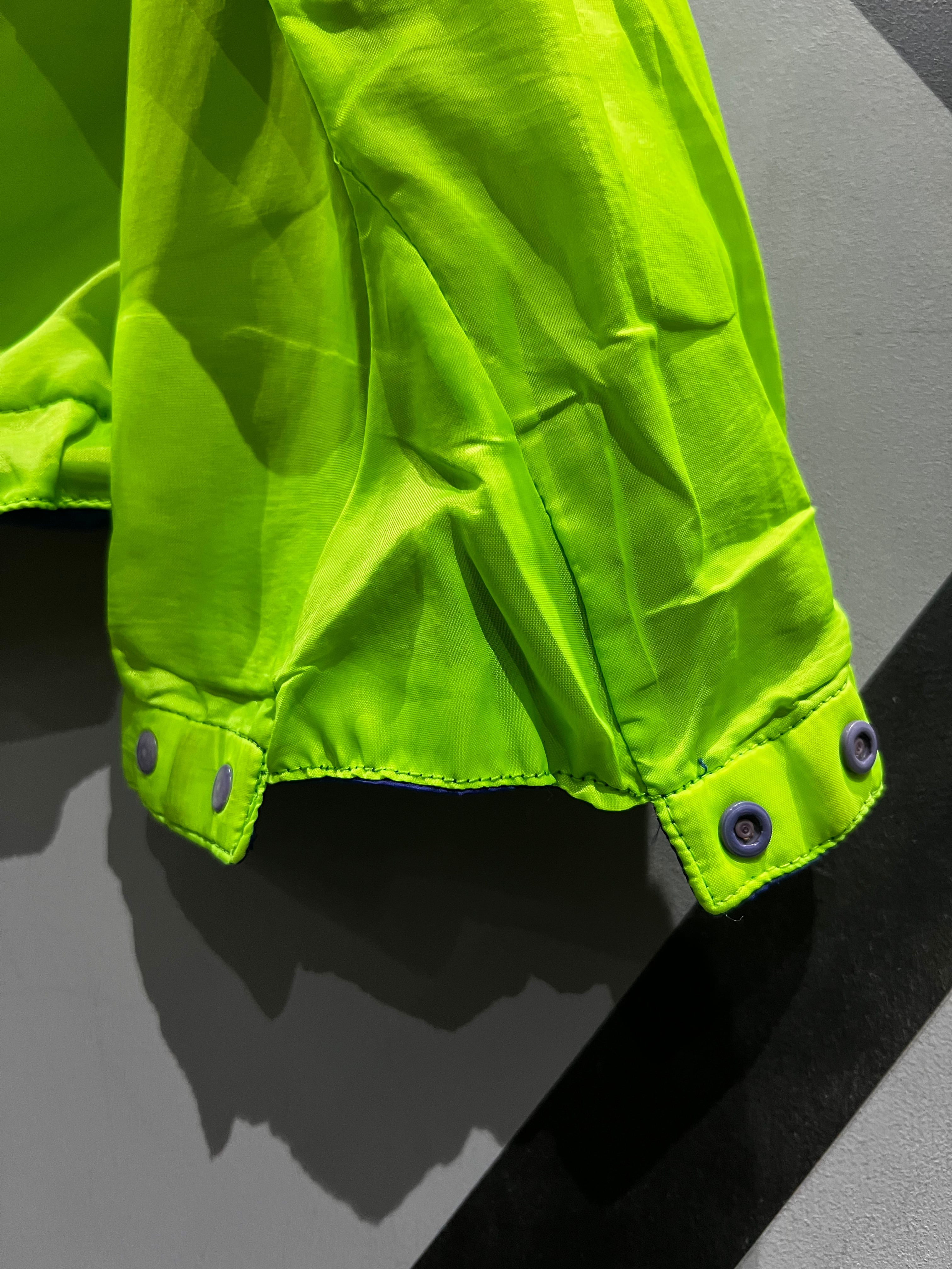 青のリップストップナイロンを用いて、ガバッと裏返すとネオングリーンへと切り替わるプルオーバー。