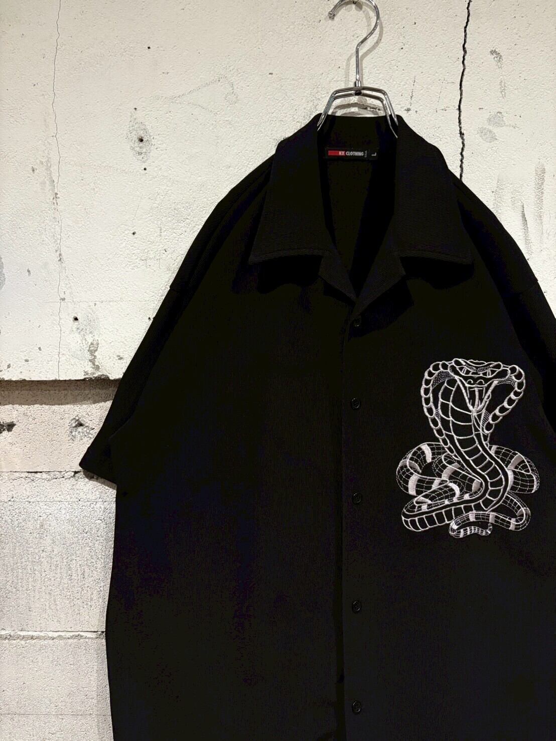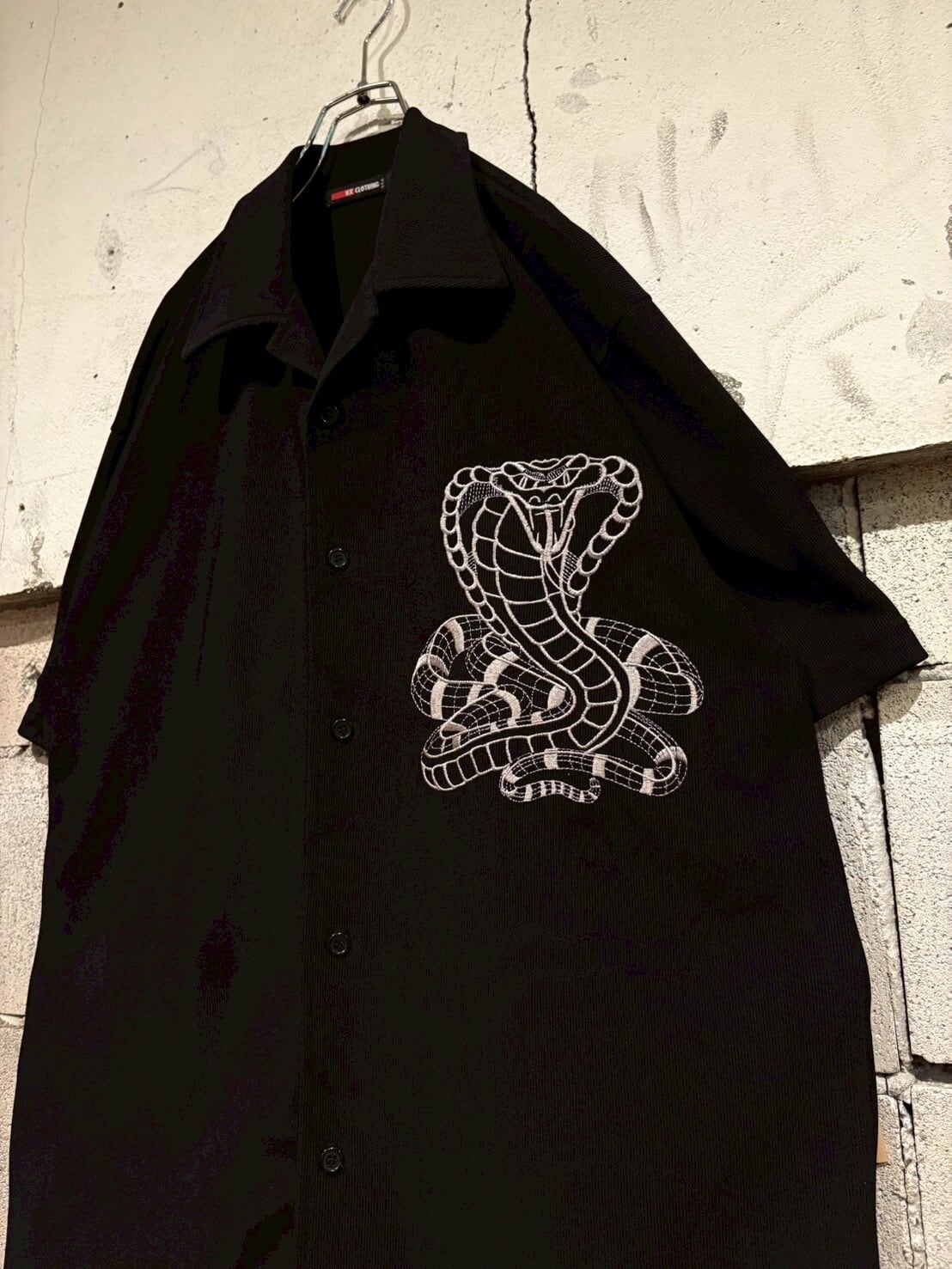 ブラックのボディをベースに、左胸付近に迫力のあるコブラの刺繍を刻んだ半袖オープンカラーシャツ。