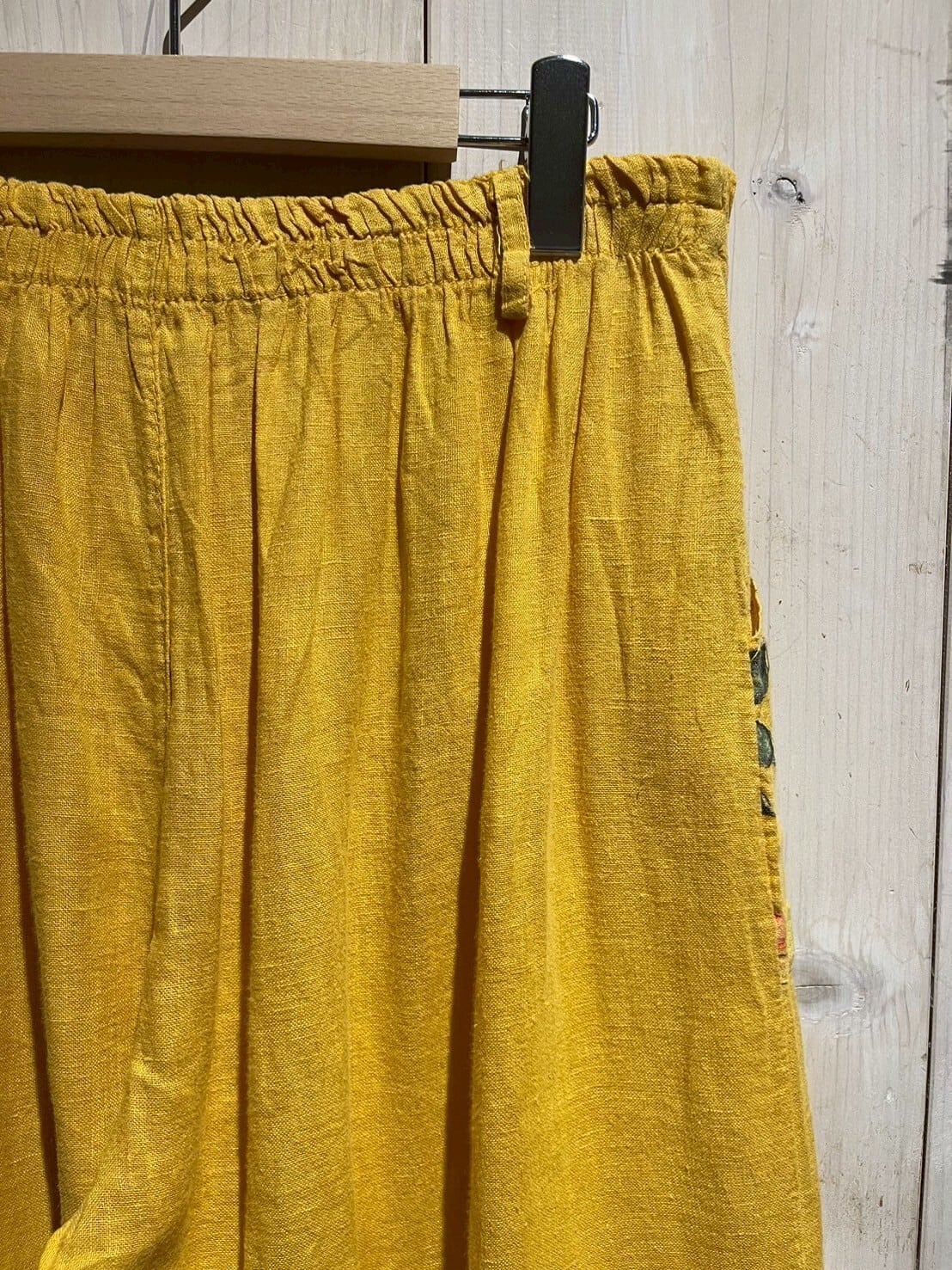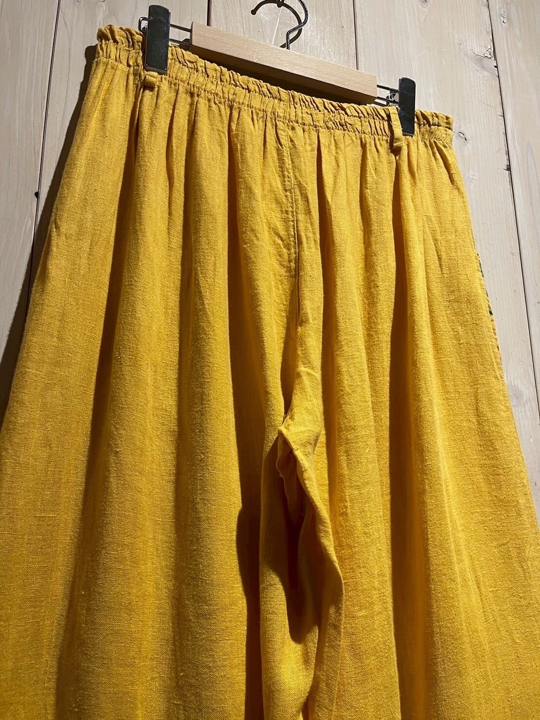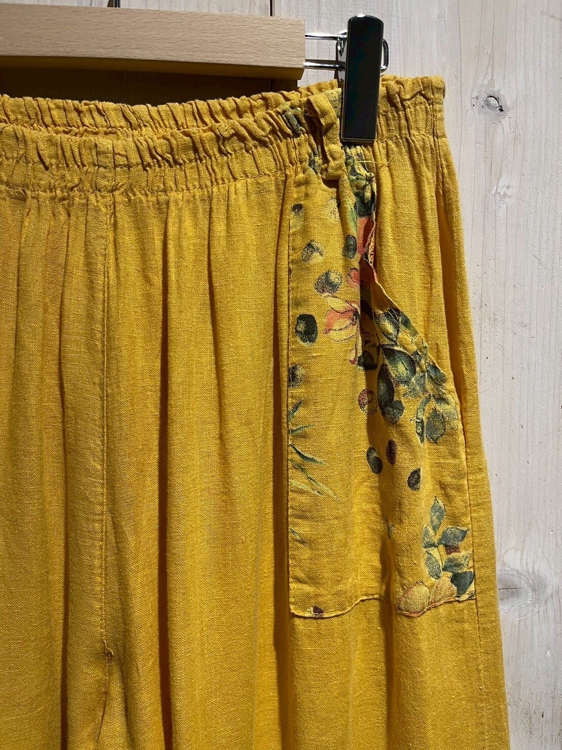 足を美しく魅せてくれる素晴らしいシルエットに、レトロな花柄がよく映え、上質なリネンを用いた、末長くご愛用して頂きたい極上の一本です。