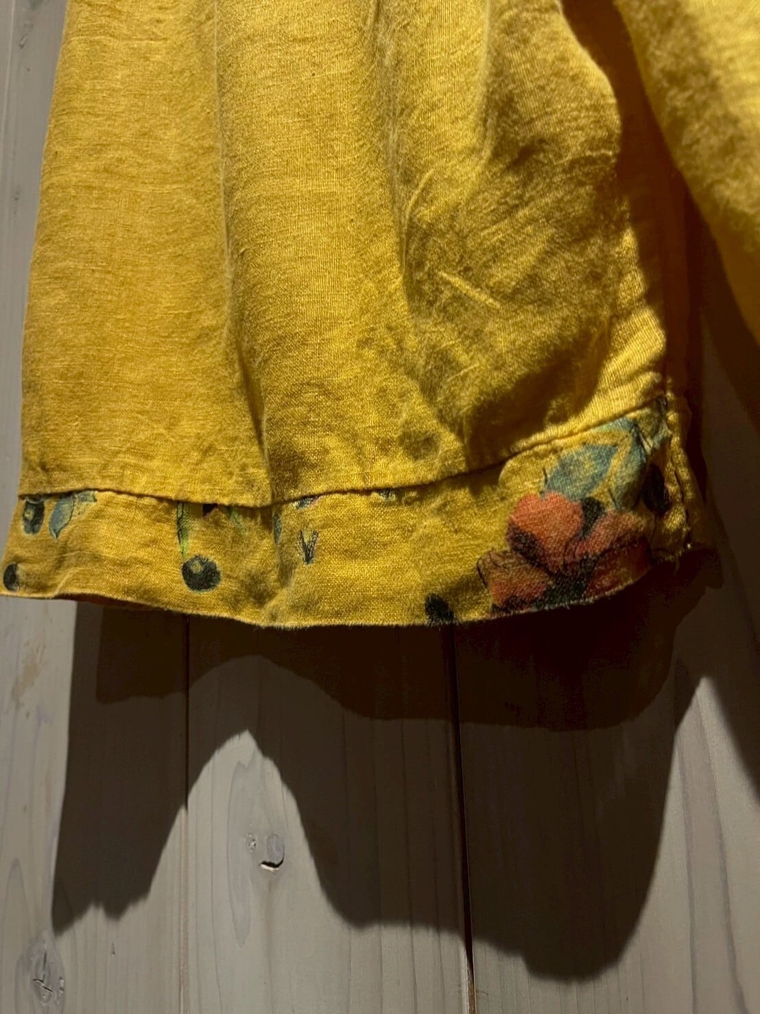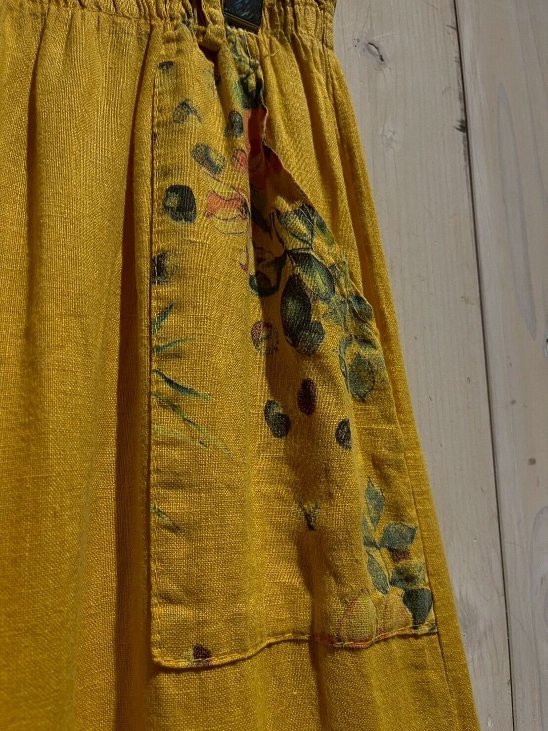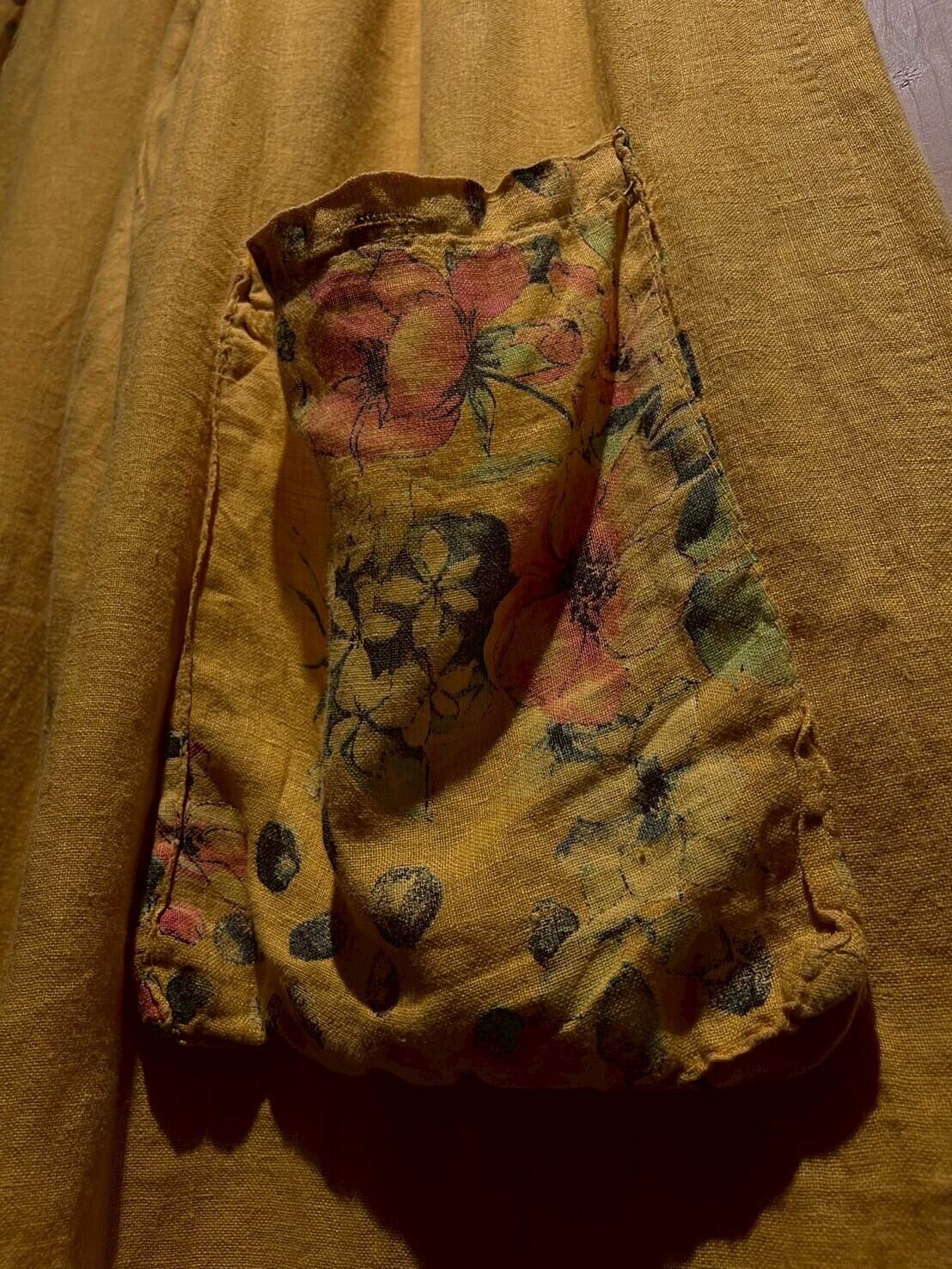 足を美しく魅せてくれる素晴らしいシルエットに、レトロな花柄がよく映え、上質なリネンを用いた、末長くご愛用して頂きたい極上の一本です。