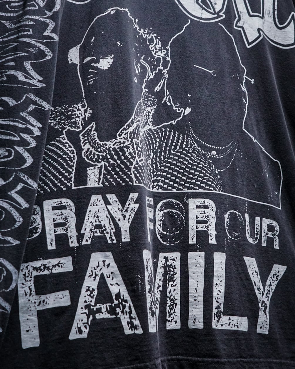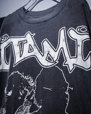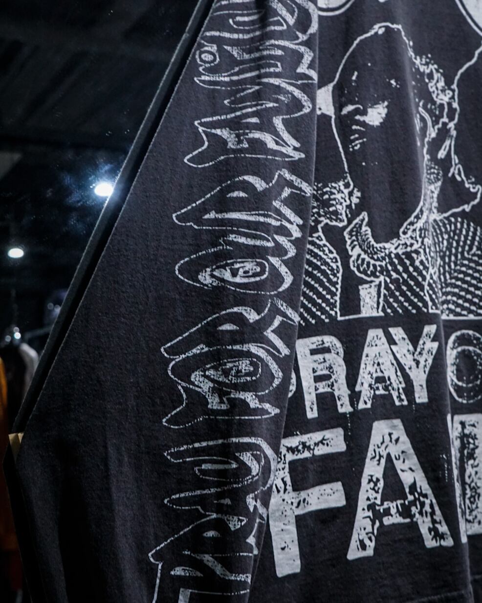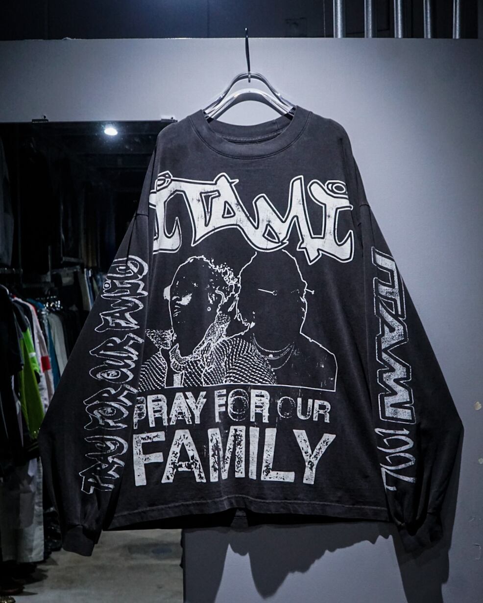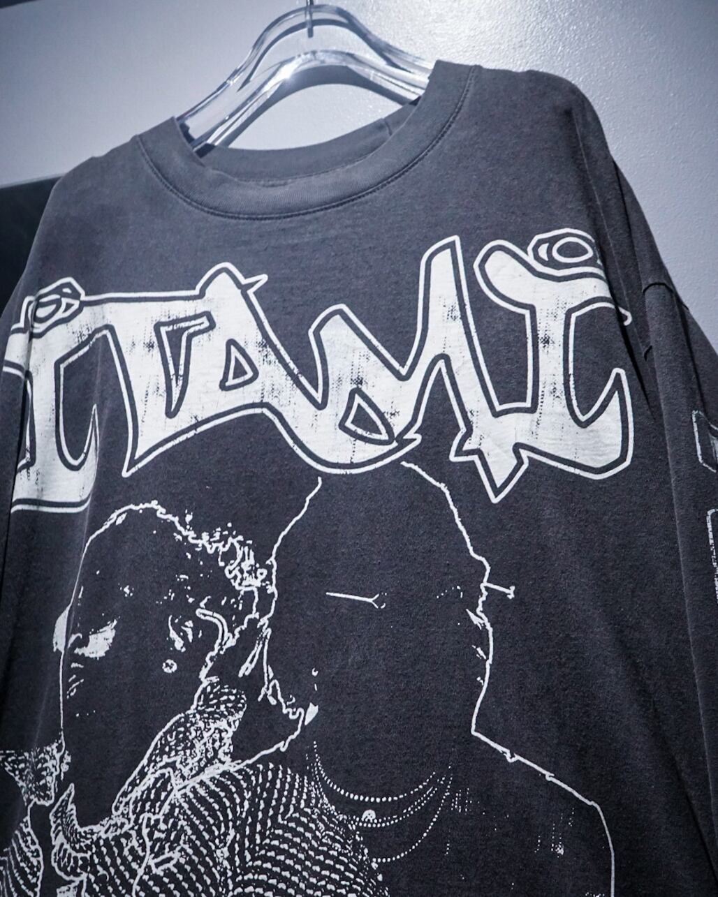 フェードの効いたブラックのボディをベースに、"ITAMI"とブラックカルチャーを感じられるような人物のプリントを載せたロンT。