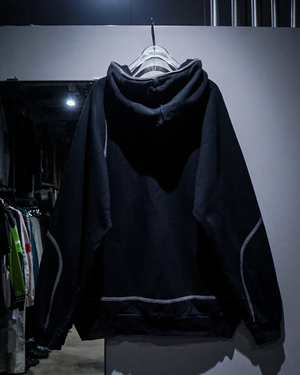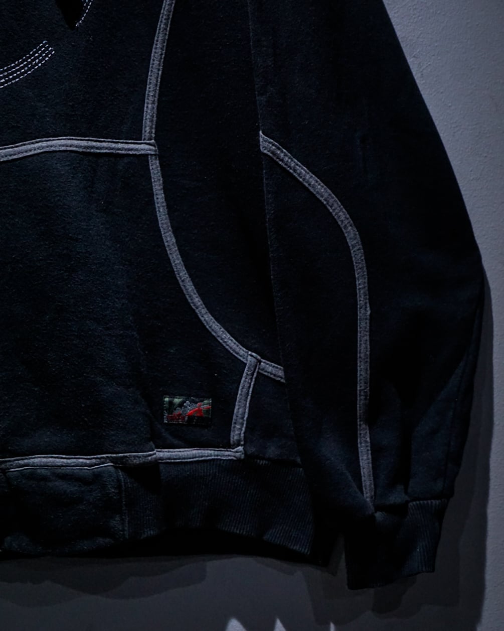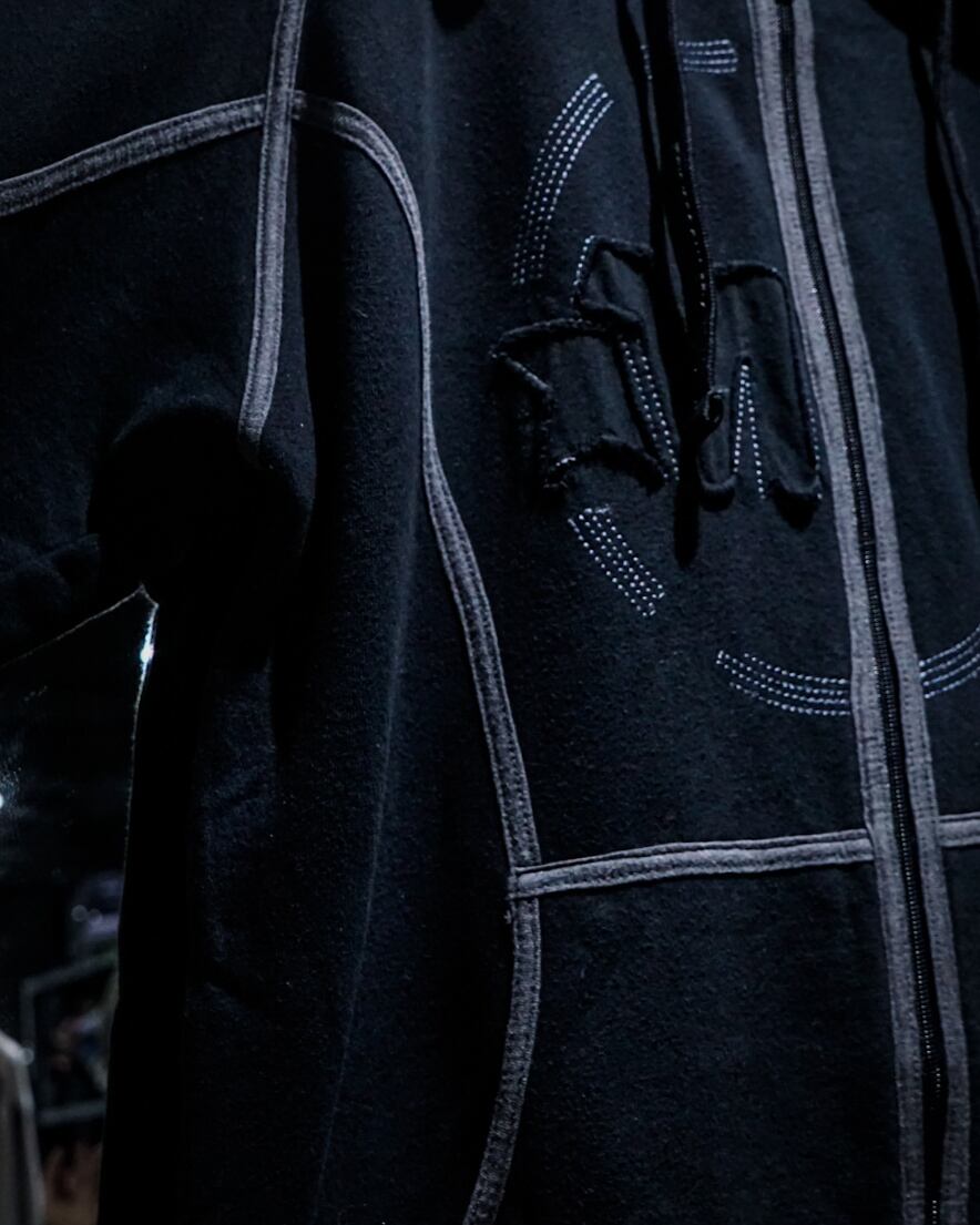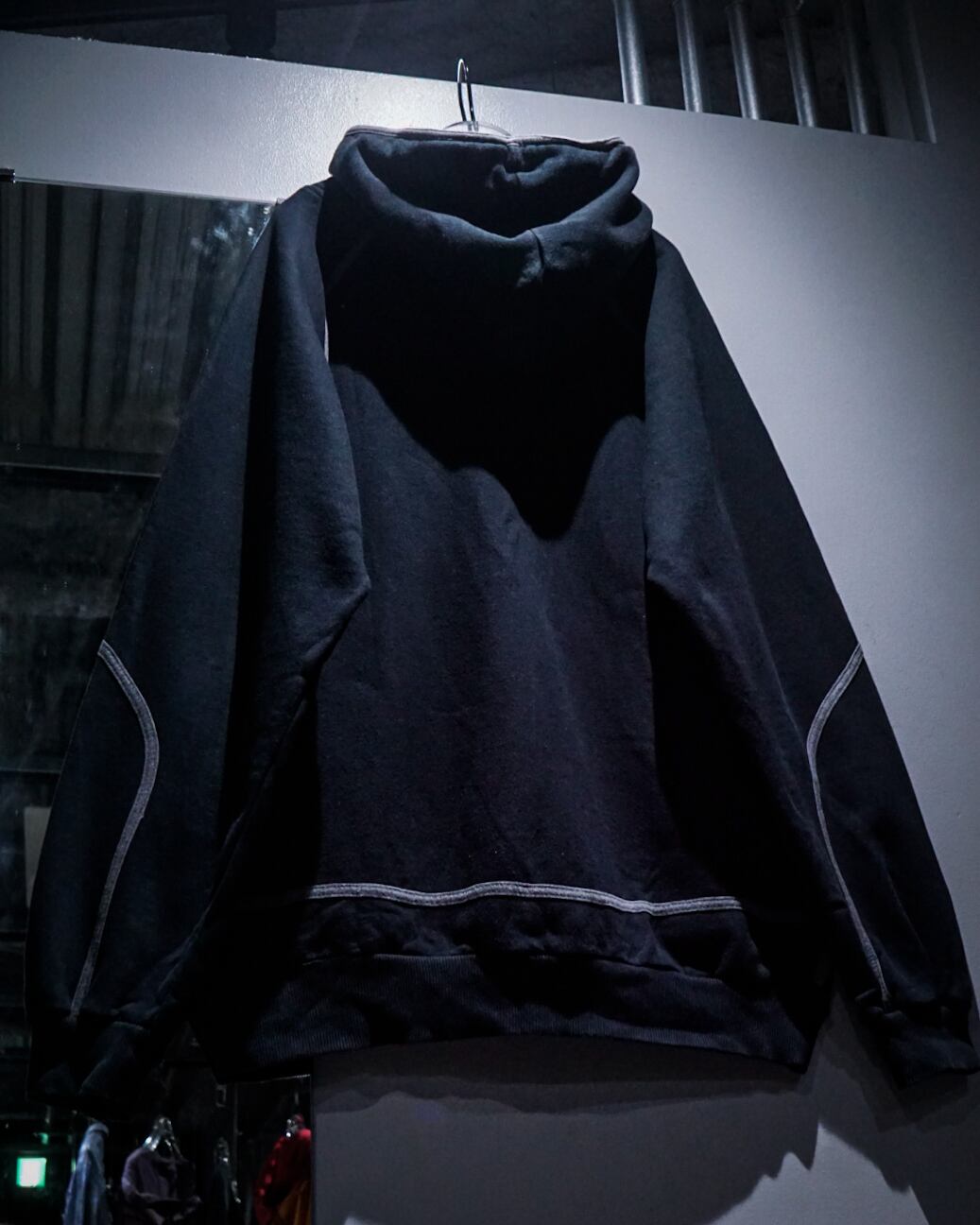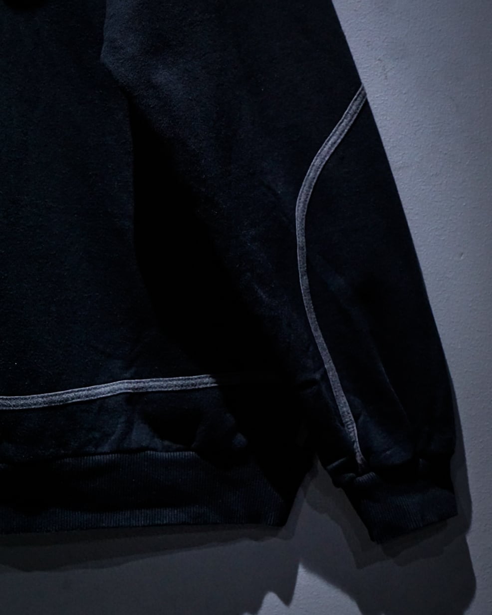 ブラックのボディをベースに、グレーのボディと同生地でテープ状にラインを走らせ、フロントにステッチ、ホール状のブランドロゴを施した1着。
