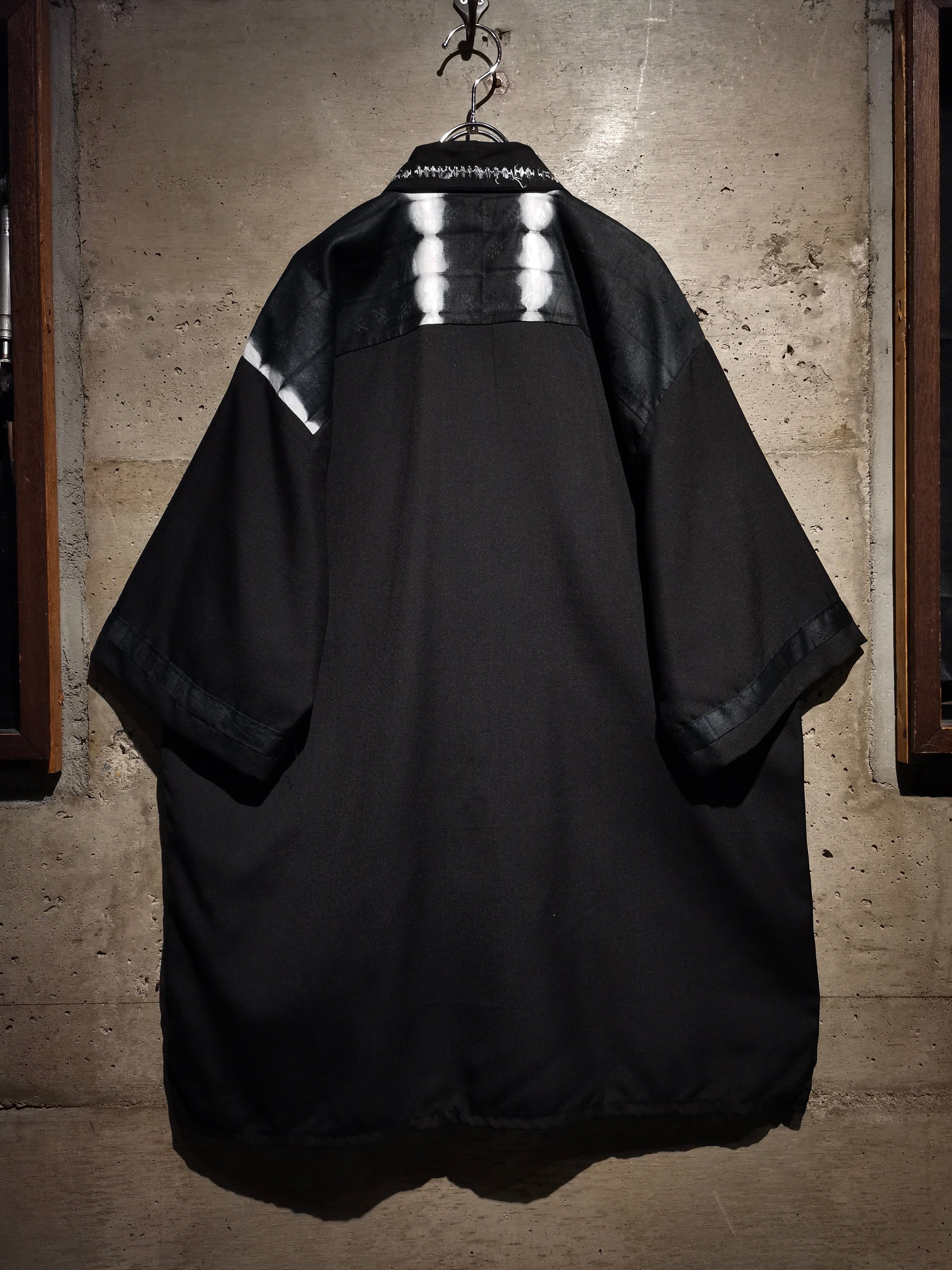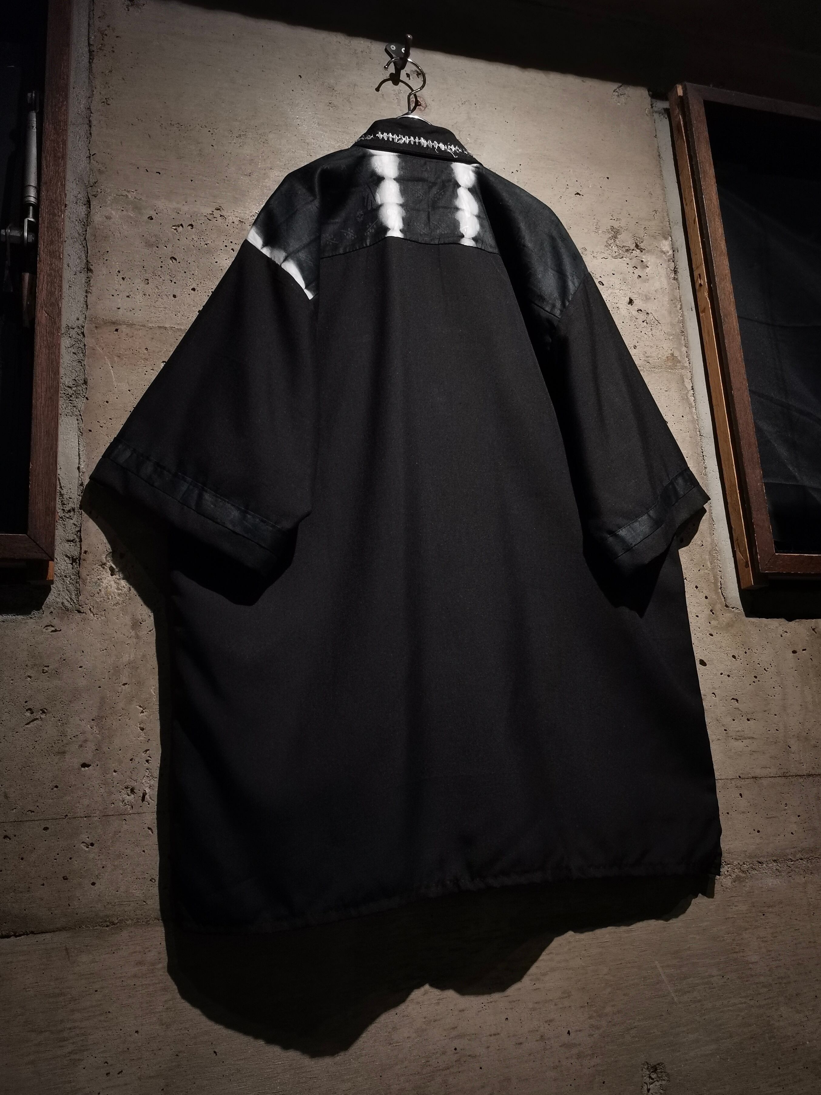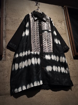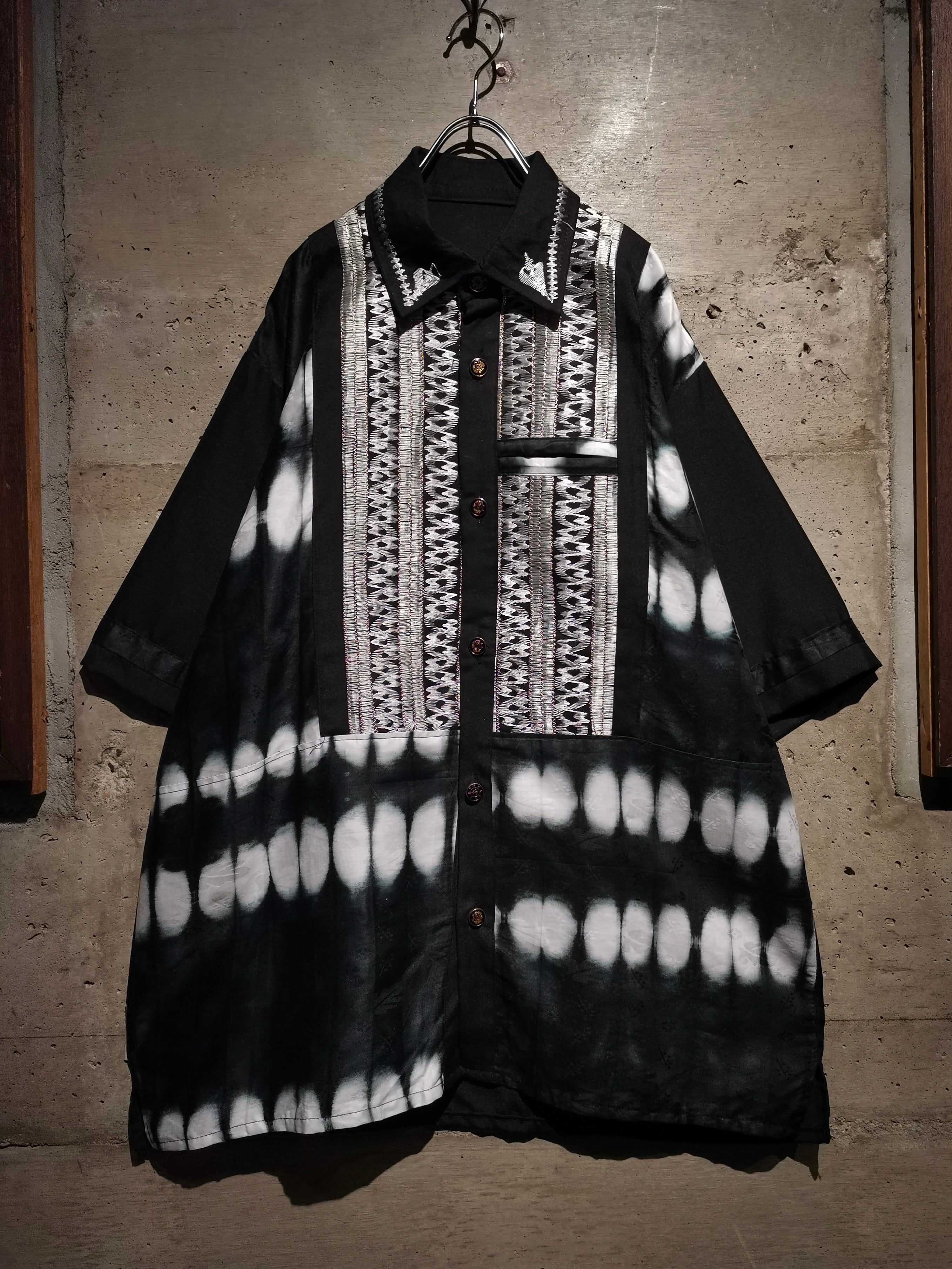 エスニックなムード漂う刺繍と、アフリカンバティックを思わせる大胆な絞り染めのコントラストが目を引く、開襟タイプのシャツの逸品。