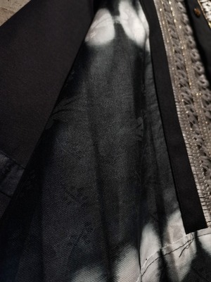 モノトーンを基調にしながらも、意匠の強さが際立ち、アートピースのような佇まいを見せる一着。