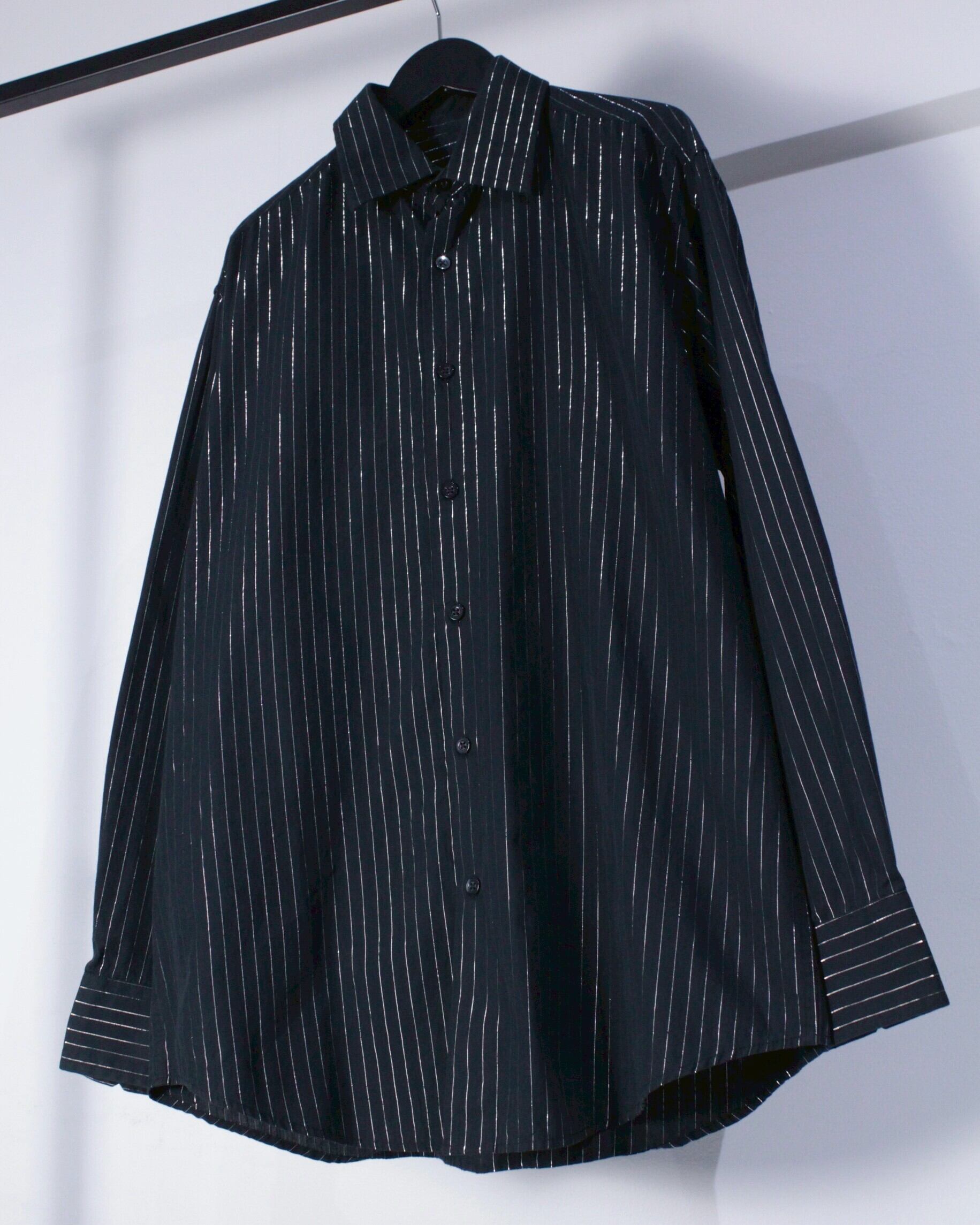 少しハリのあるブラックのボディに、上品に光沢を放つシルバーの糸を織り込んでストライプ柄を載せた長袖シャツ。