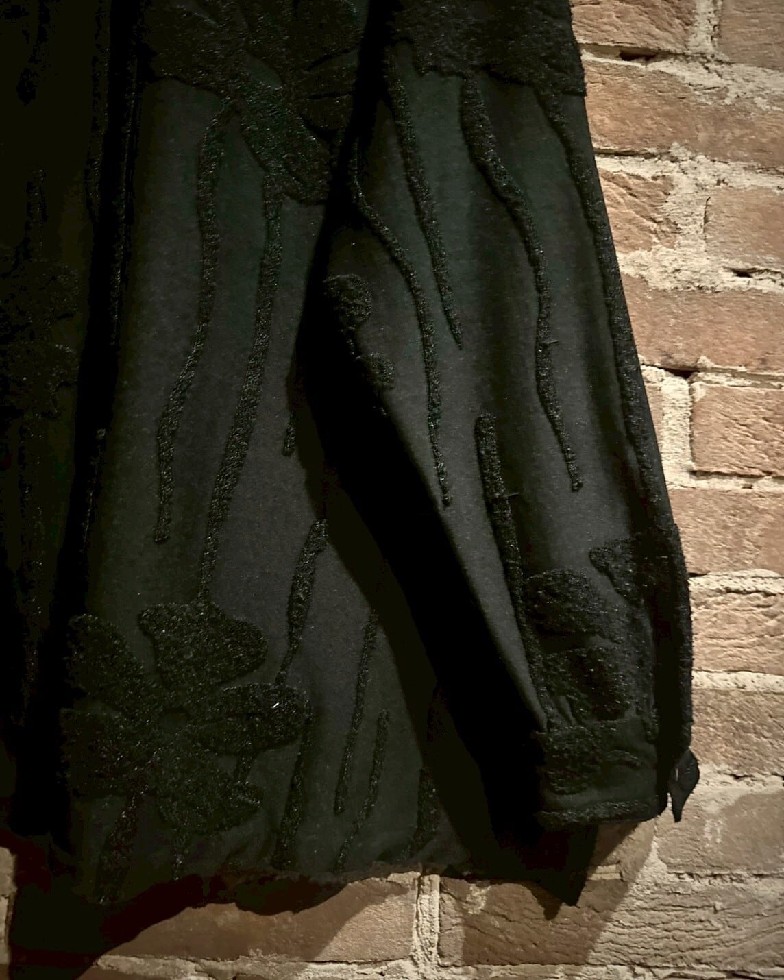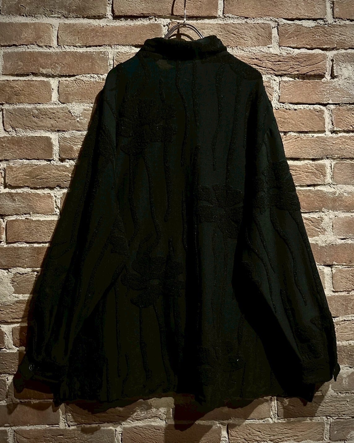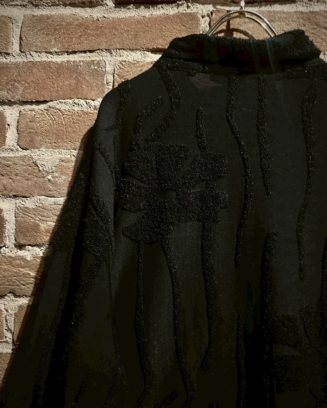 マットなブラックのボディをベースに、フワッと柔らかなパイル地で花の装飾を施した長袖シャツ。