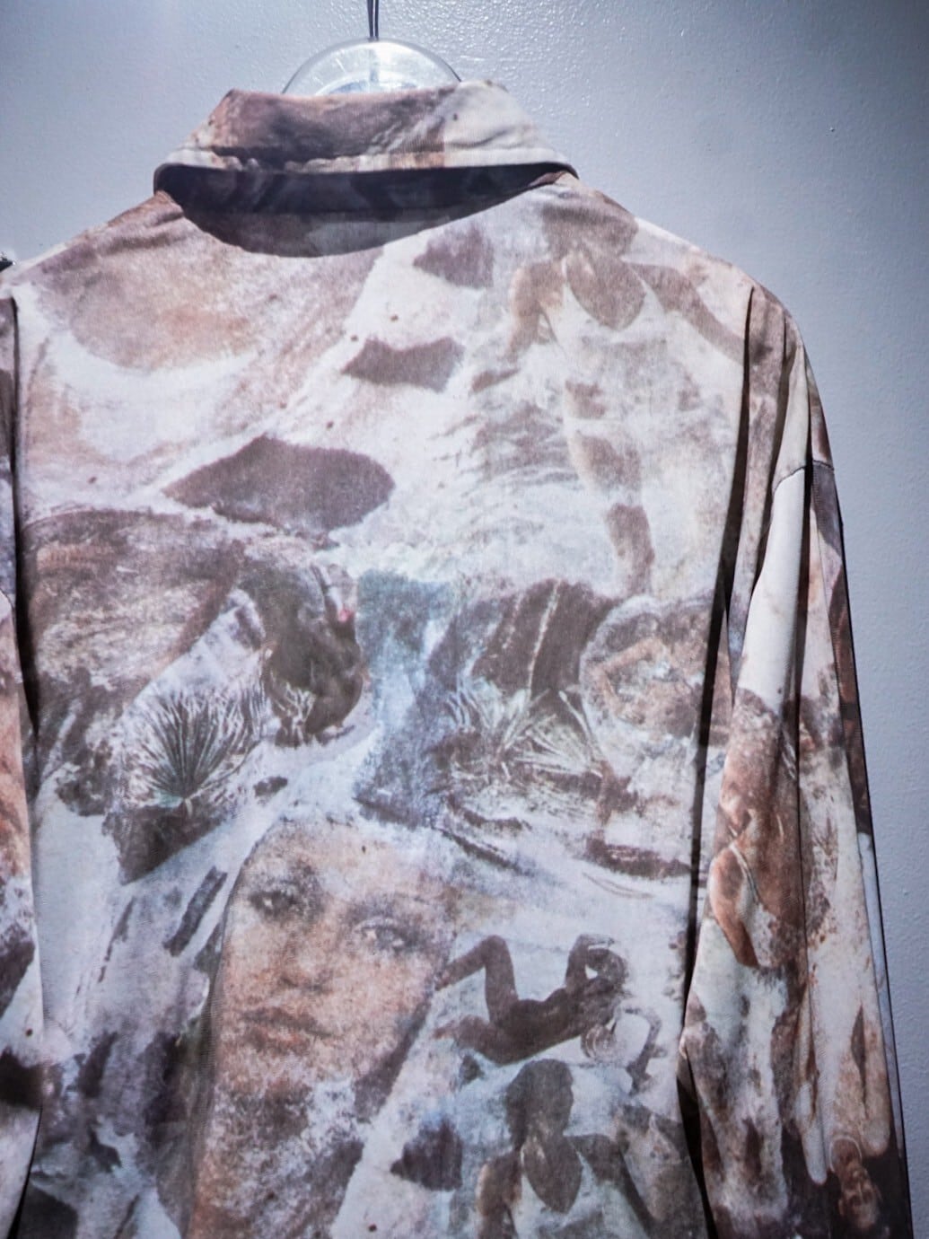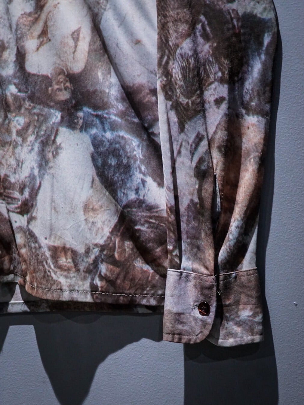 ツルッと滑らかなボディに、転写で様々な写真を載せた70'sヴィンテージの長袖シャツ。