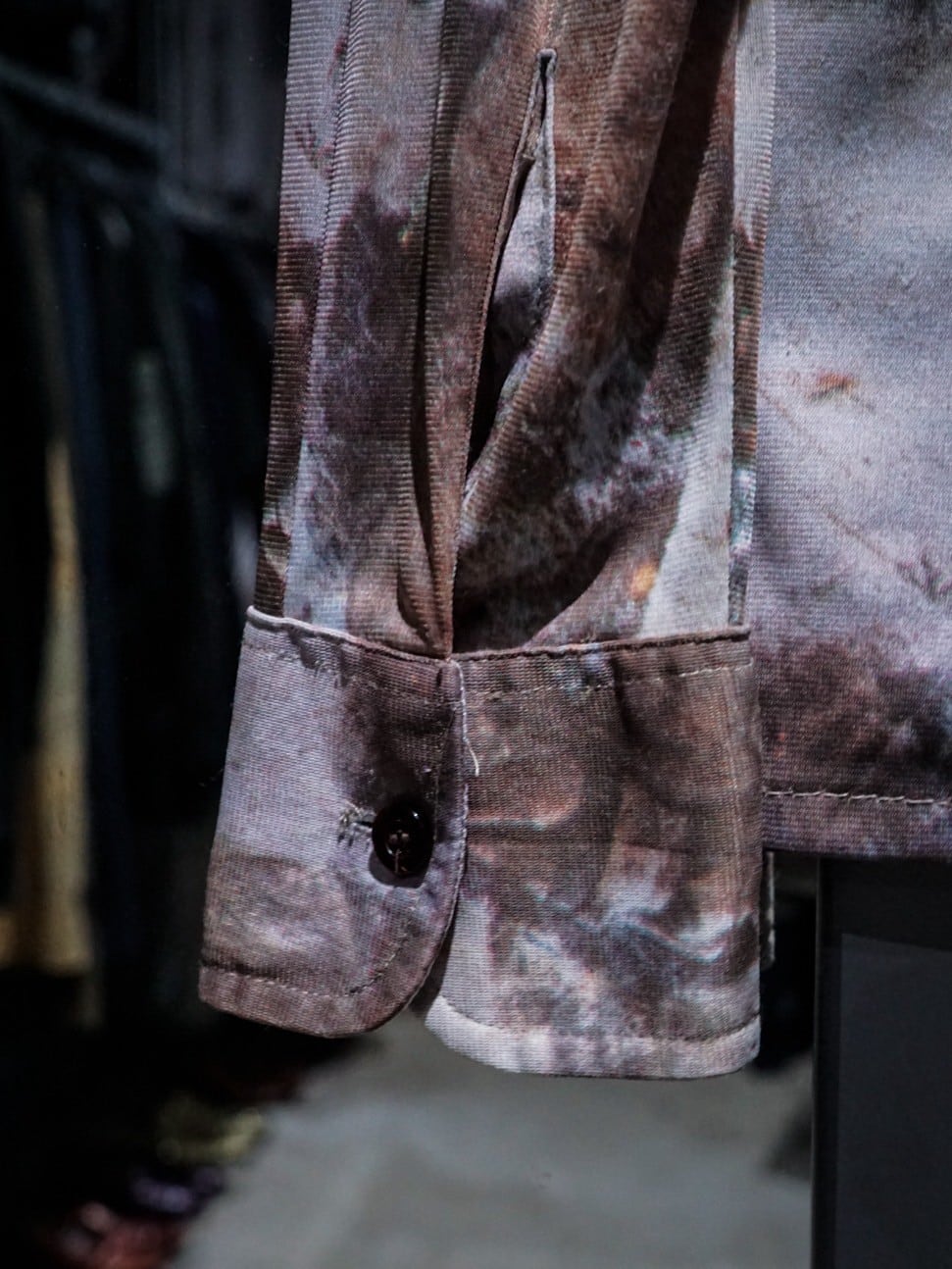 スレた写真のカラーリングや、当時の雰囲気を感じられるデザイン。総柄ながらもデザインバランス感も良く、コーディネートにアクセントを加えてくれます。