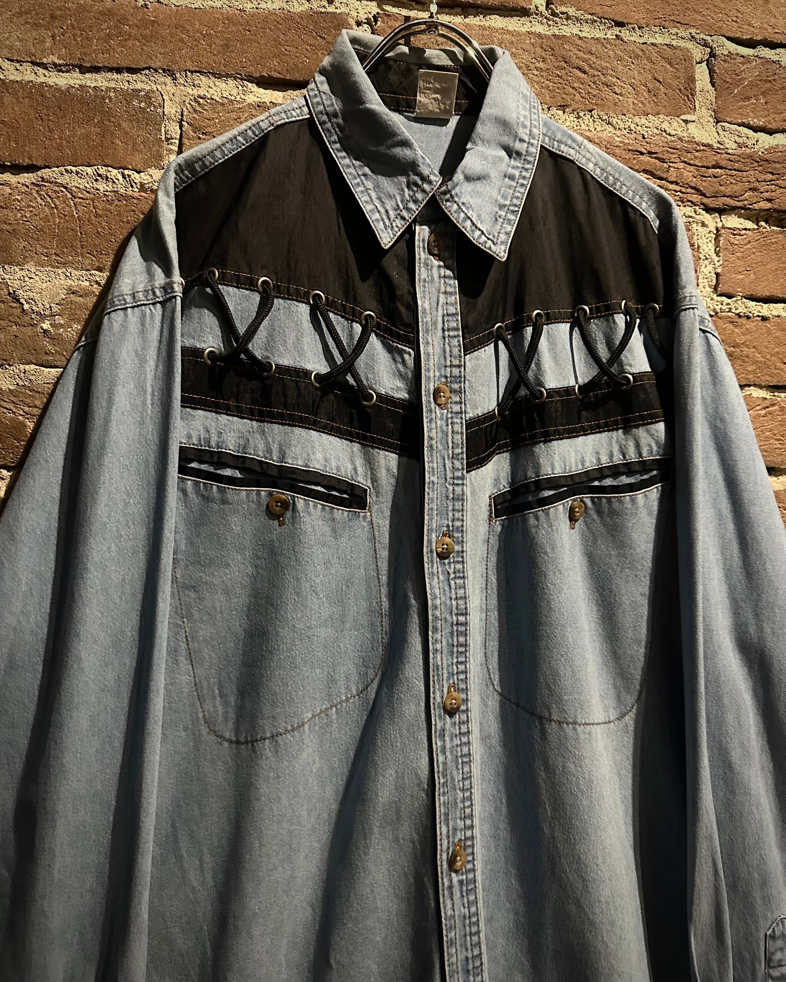 スレ感と味のあるデニム生地に、胸元のフラップポケットや肩部分にナイロン切り替えが施されており、尚且つバツ印を描く紐ギミックが加えられた、エッジの効いたデニムシャツ。