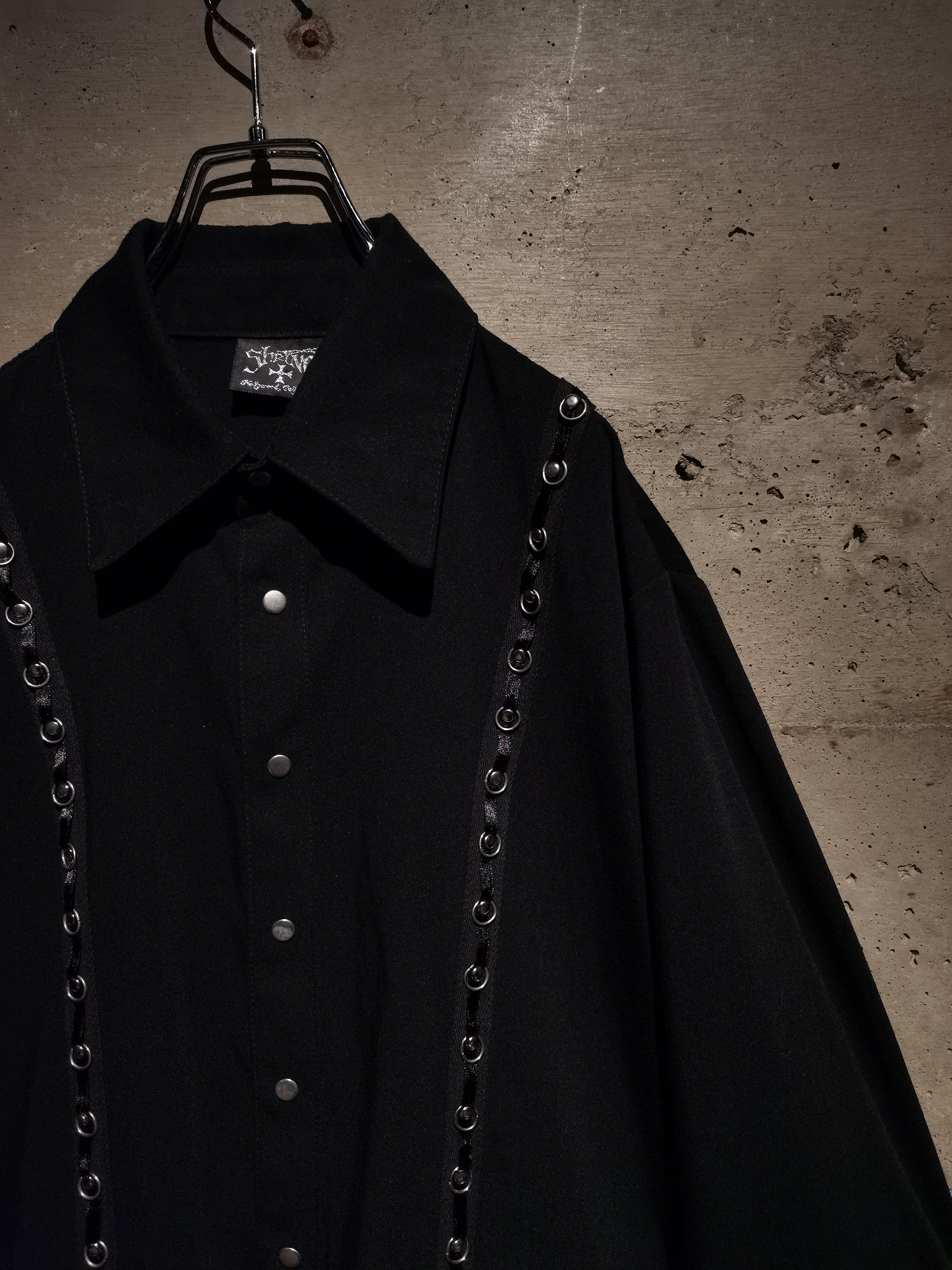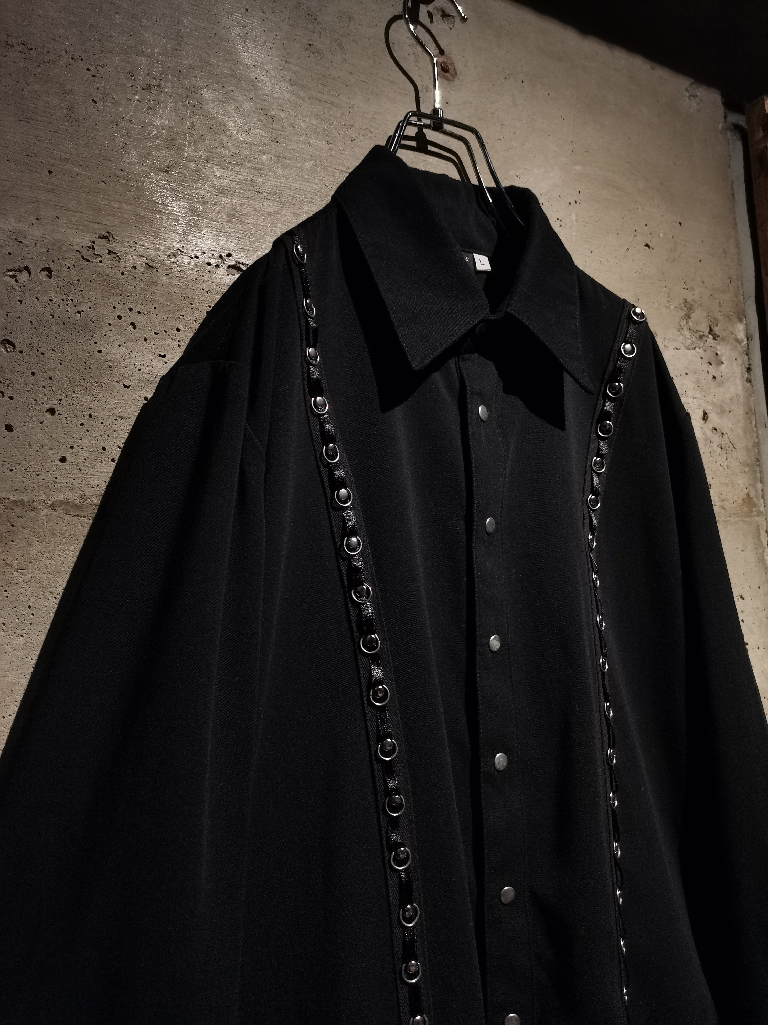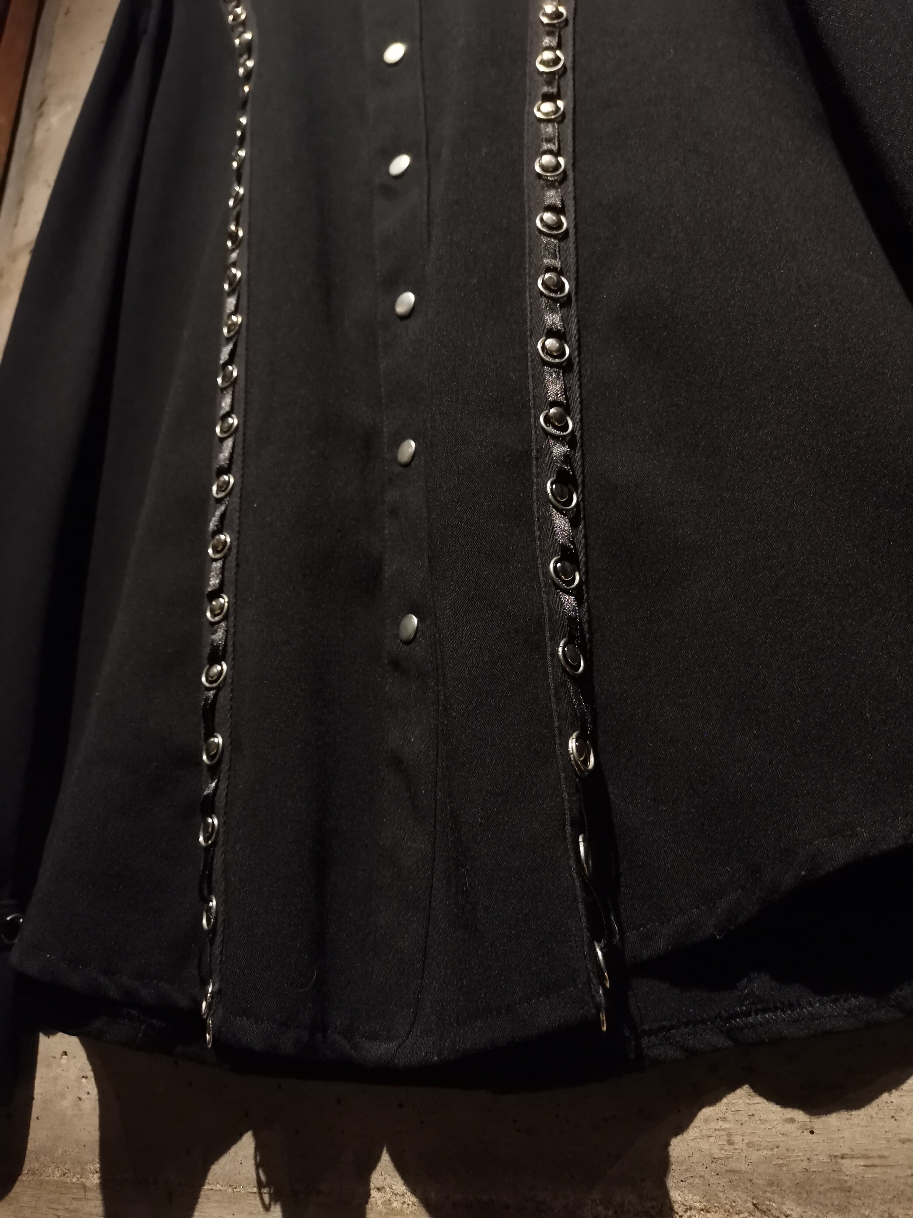 サラッとした質感のブラックボディをベースに、シルバーのスタッズやリングの装飾が施されたラインを前身頃&袖口に走らせた1着。