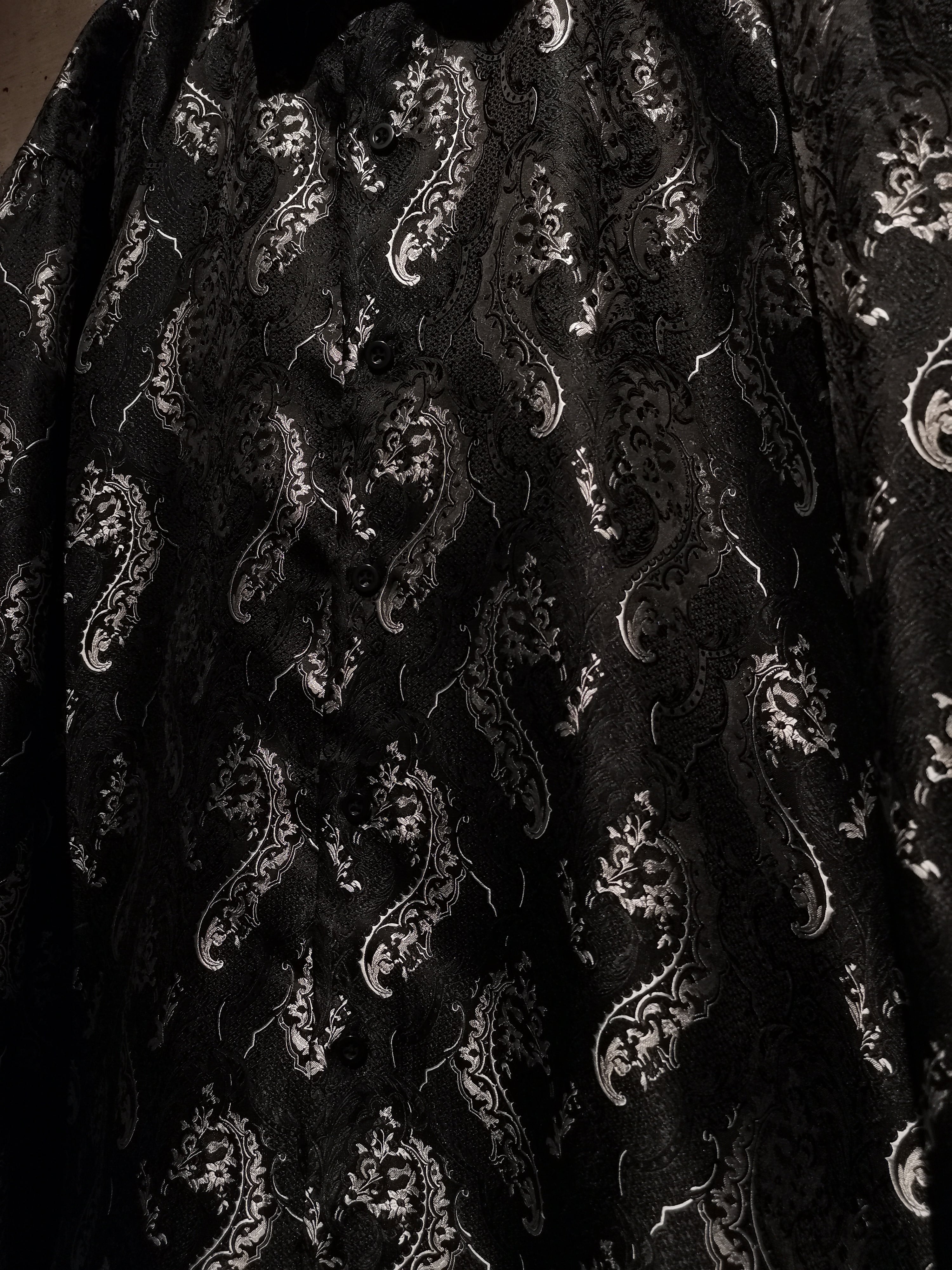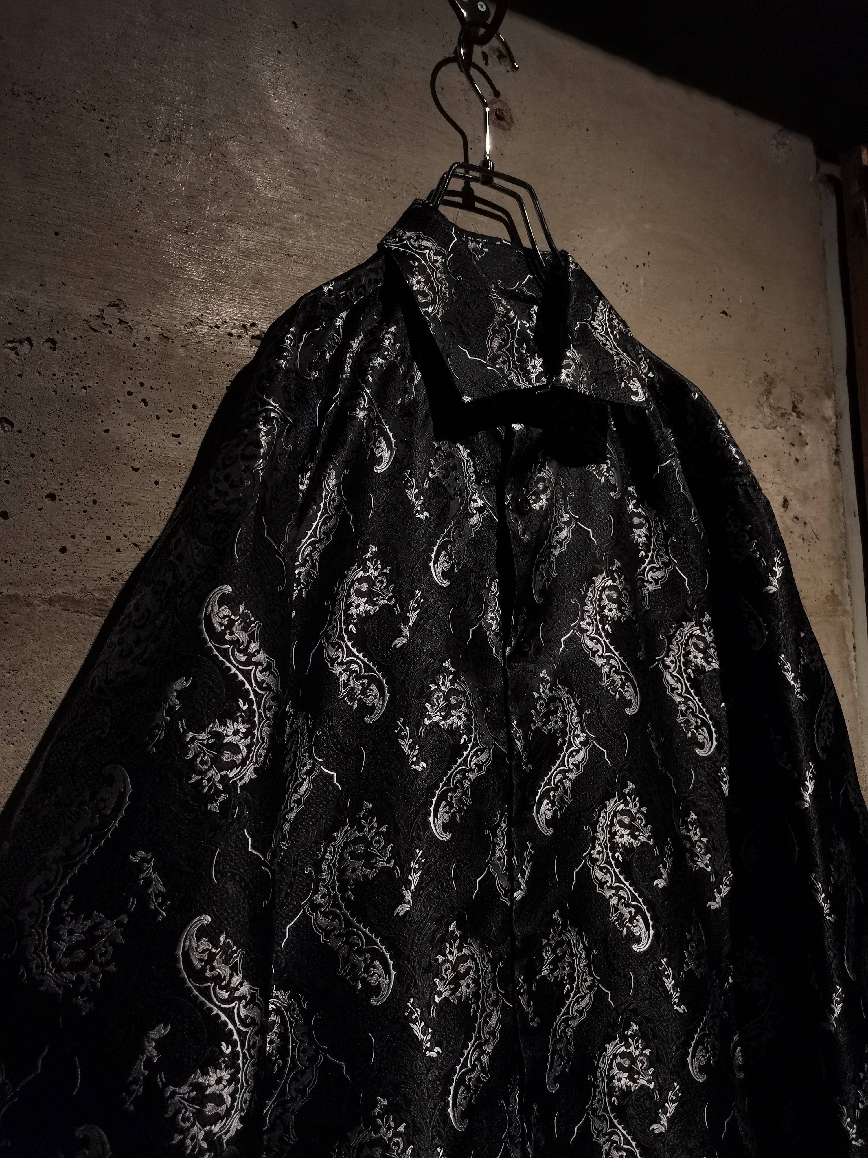 光の当たり具合によって見え方が変わる、独特の光沢を帯びたボディに、繊細な織りによって美しい植物モチーフの柄をボディ全体に表現した稀有かつスペシャルな1着。