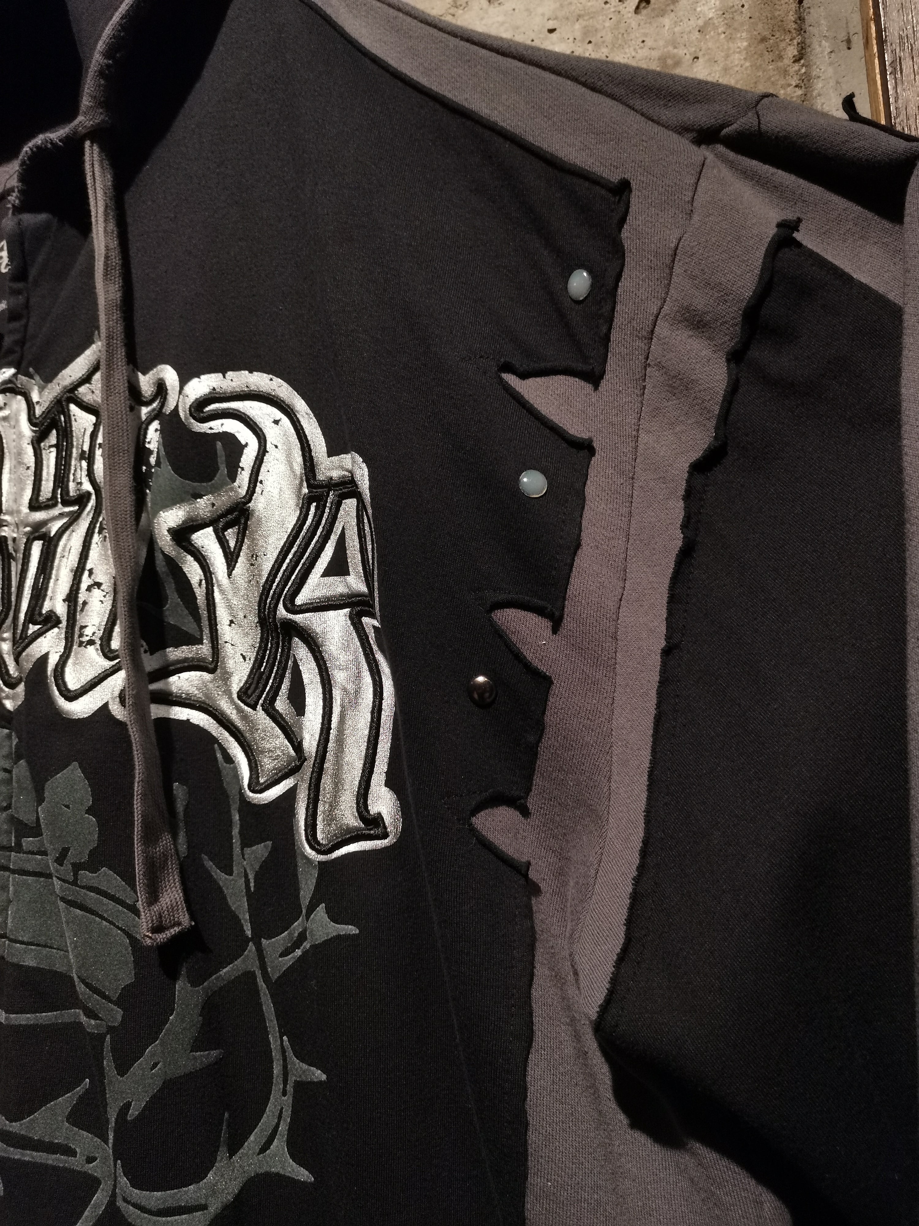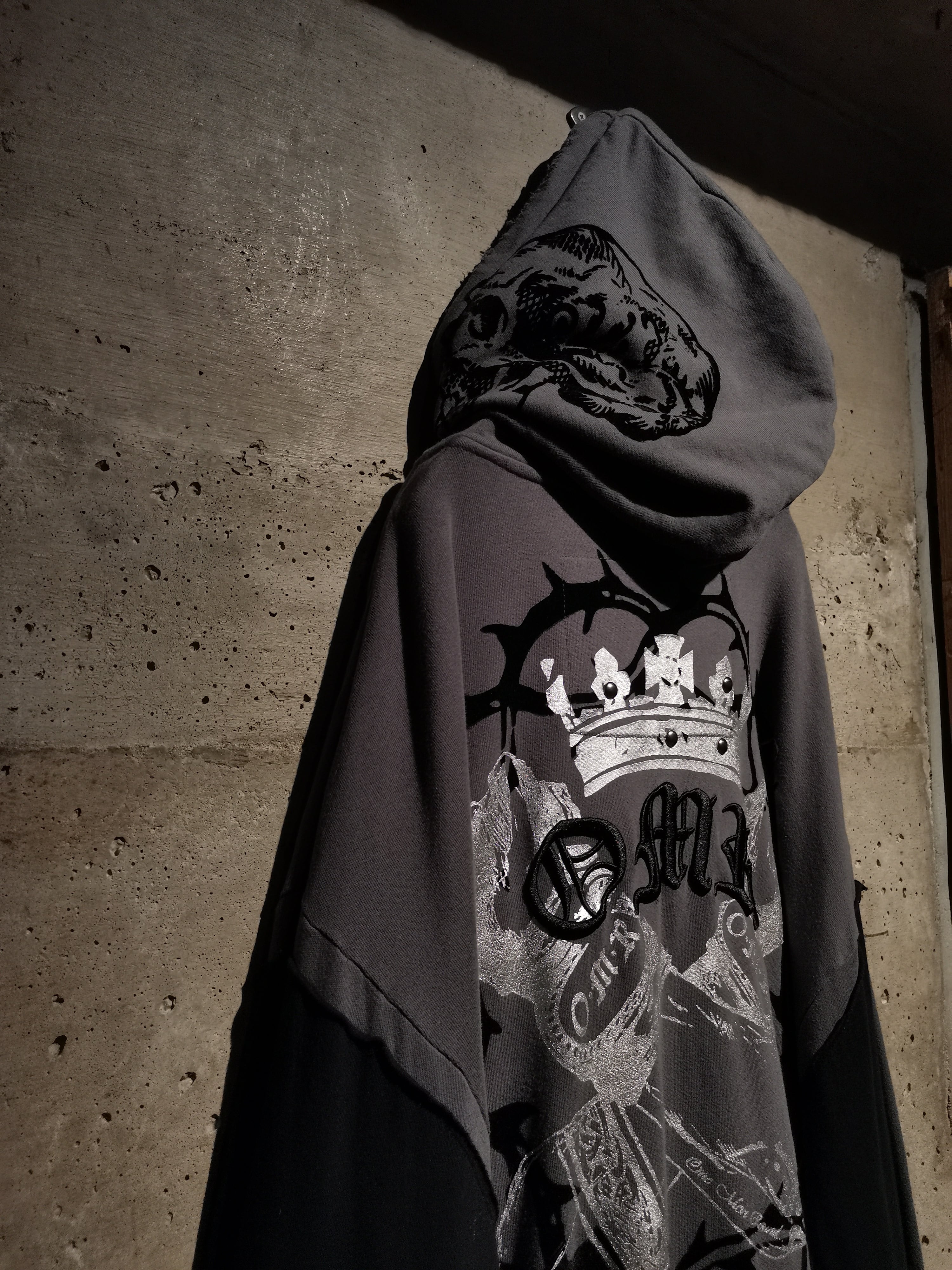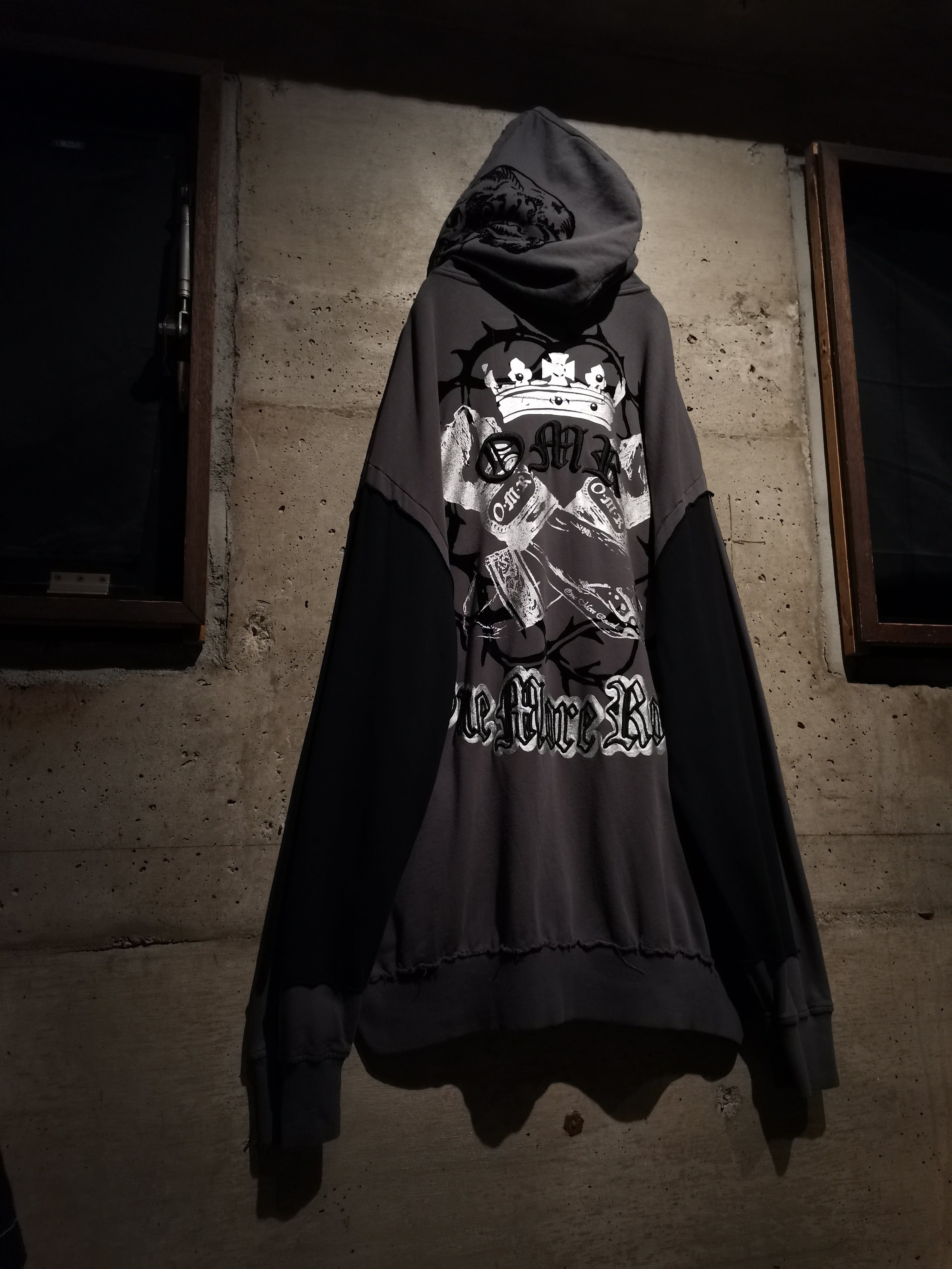 随所にカットオフの生地を用いたインサイドアウト風のデザイン、若干ボロ感のあるフードにもスカルのプリント、ショルダー部分にはスタッズが打ち込まれており、細部まで抜かりのない、このブランドの中でもクオリティの高い作り込みに心打たれます。