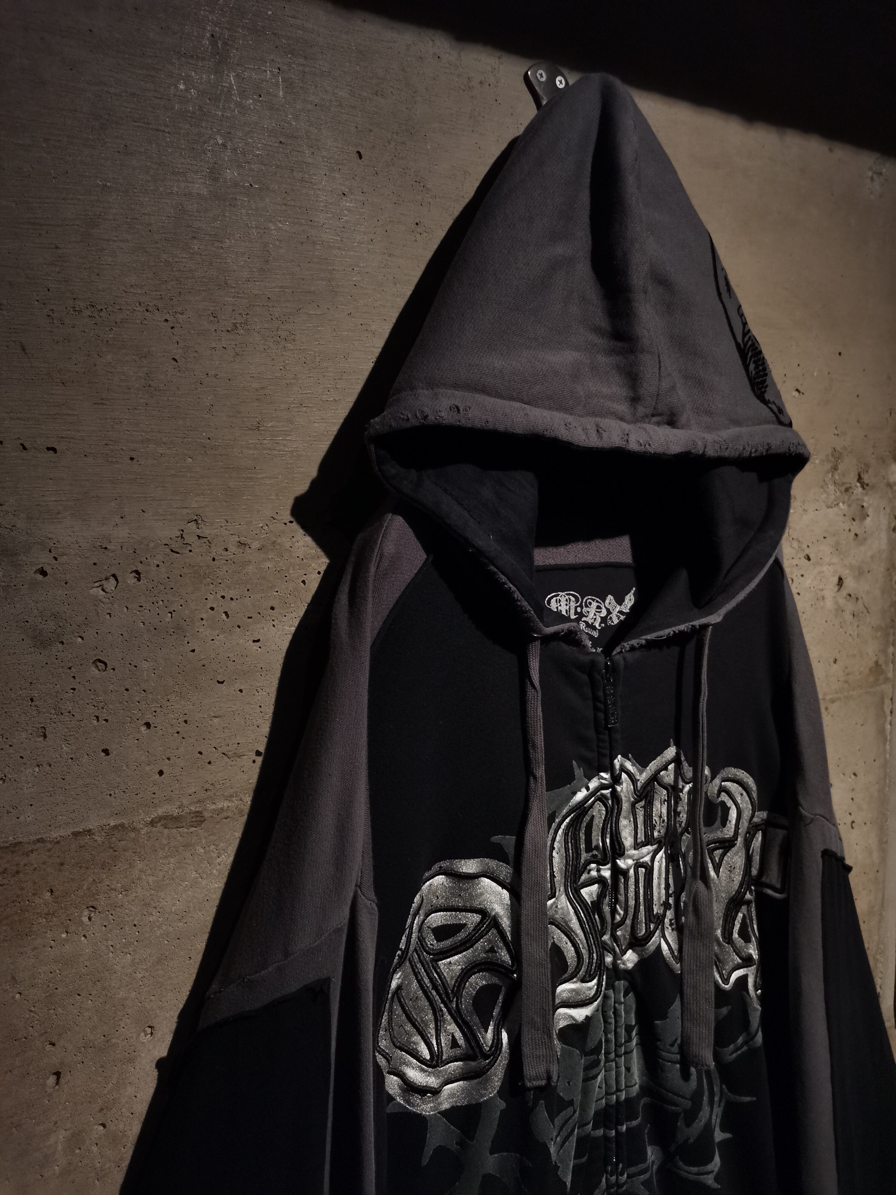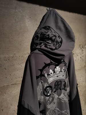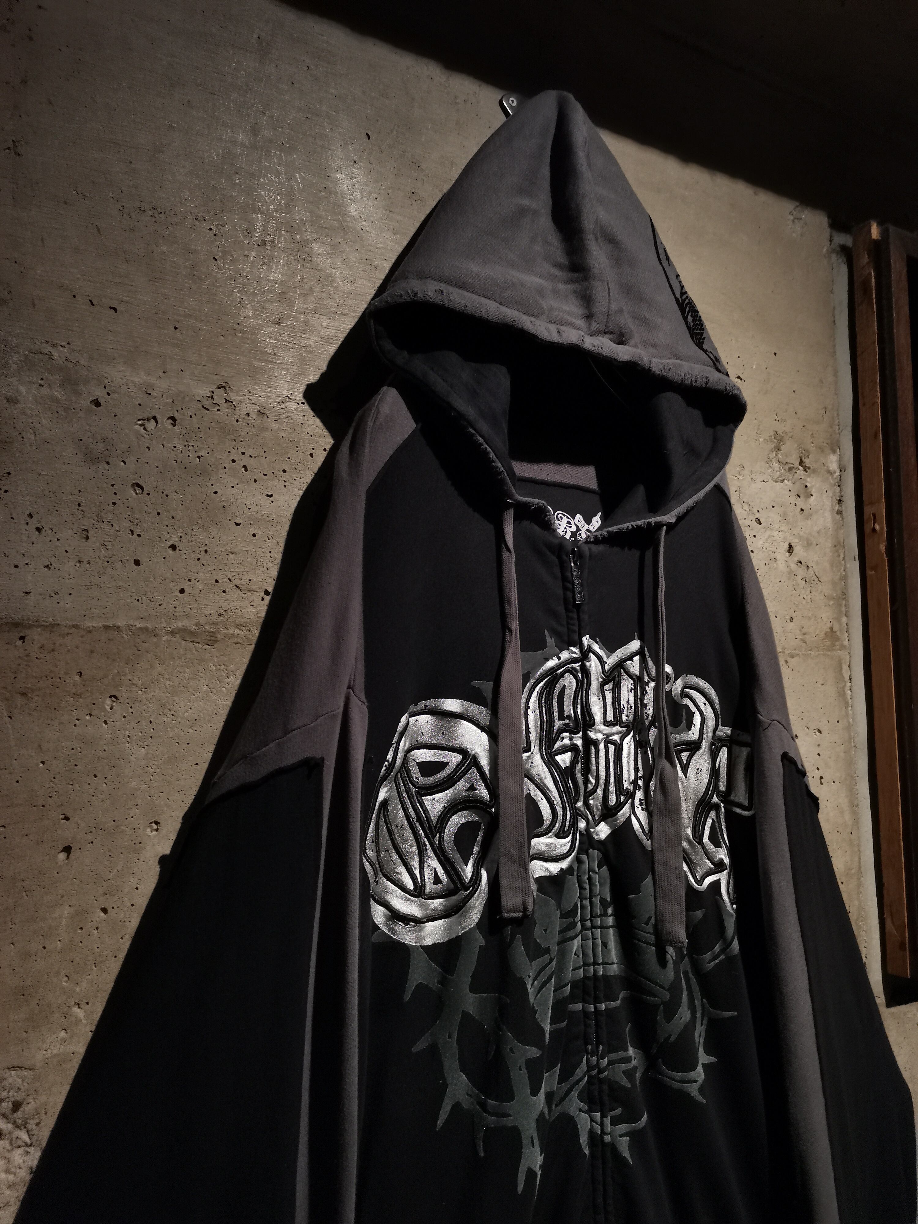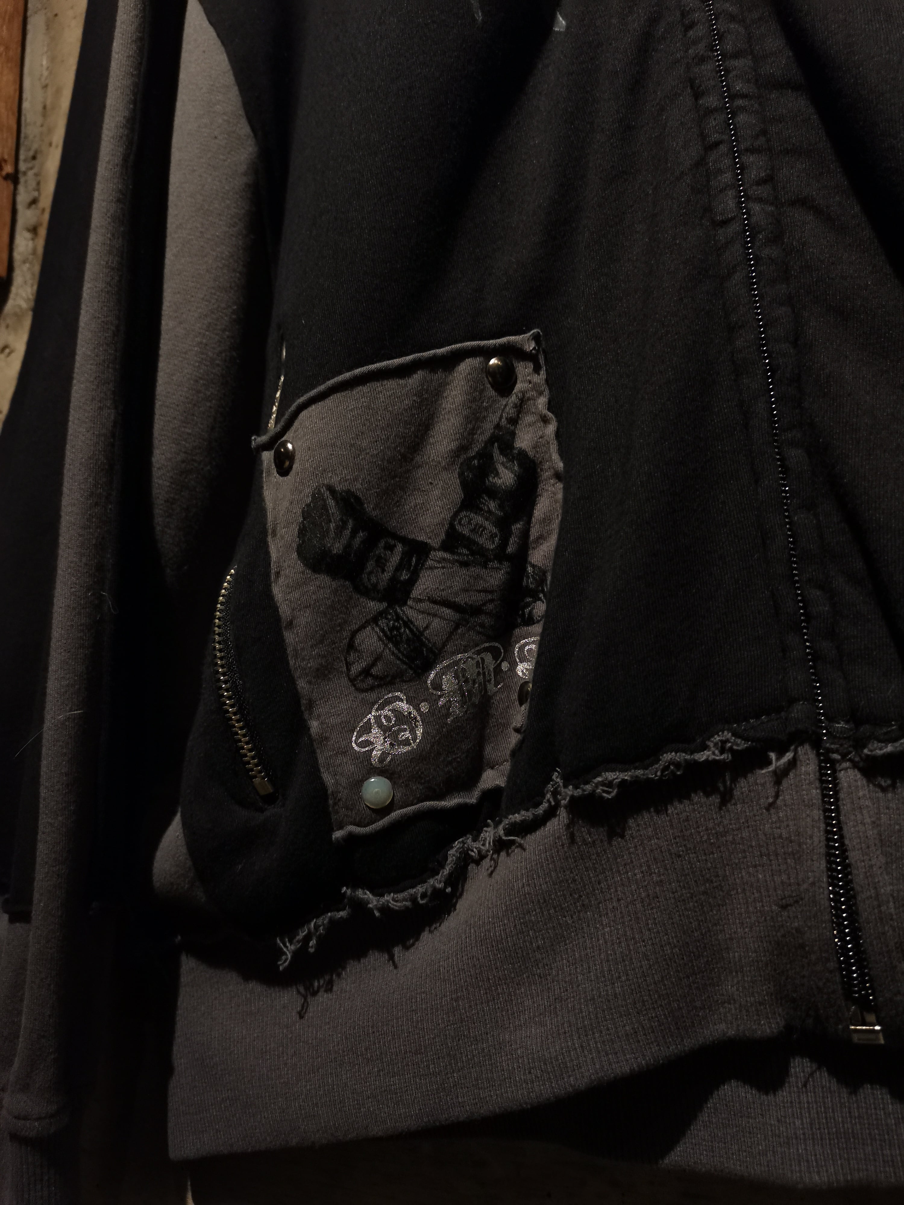 随所にカットオフの生地を用いたインサイドアウト風のデザイン、若干ボロ感のあるフードにもスカルのプリント、ショルダー部分にはスタッズが打ち込まれており、細部まで抜かりのない、このブランドの中でもクオリティの高い作り込みに心打たれます。