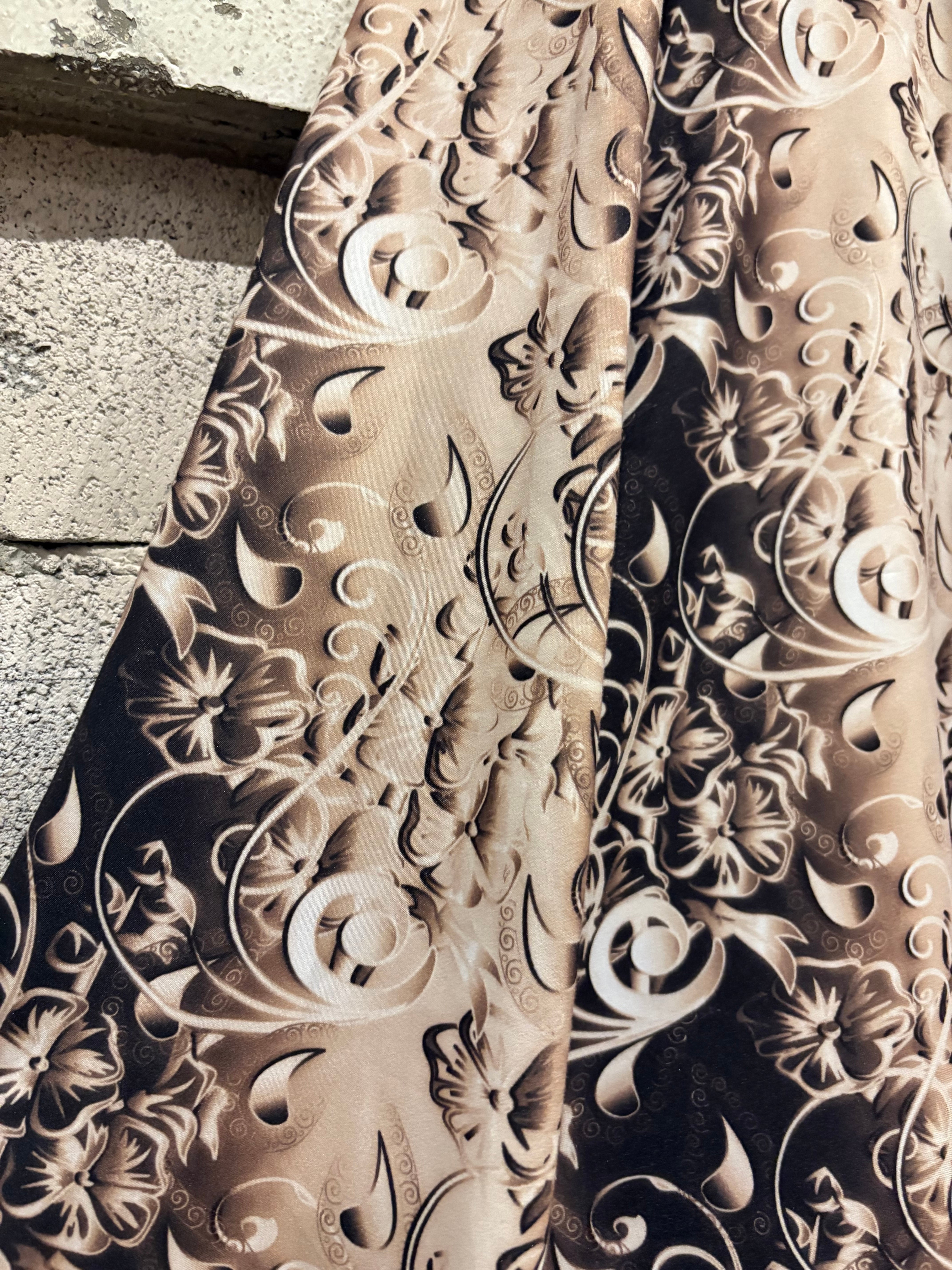 黒×茶色のグラデーションがかったストライプのボディに、立体感のあるタッチで花などのボタニカル柄を載せた長袖シャツ。