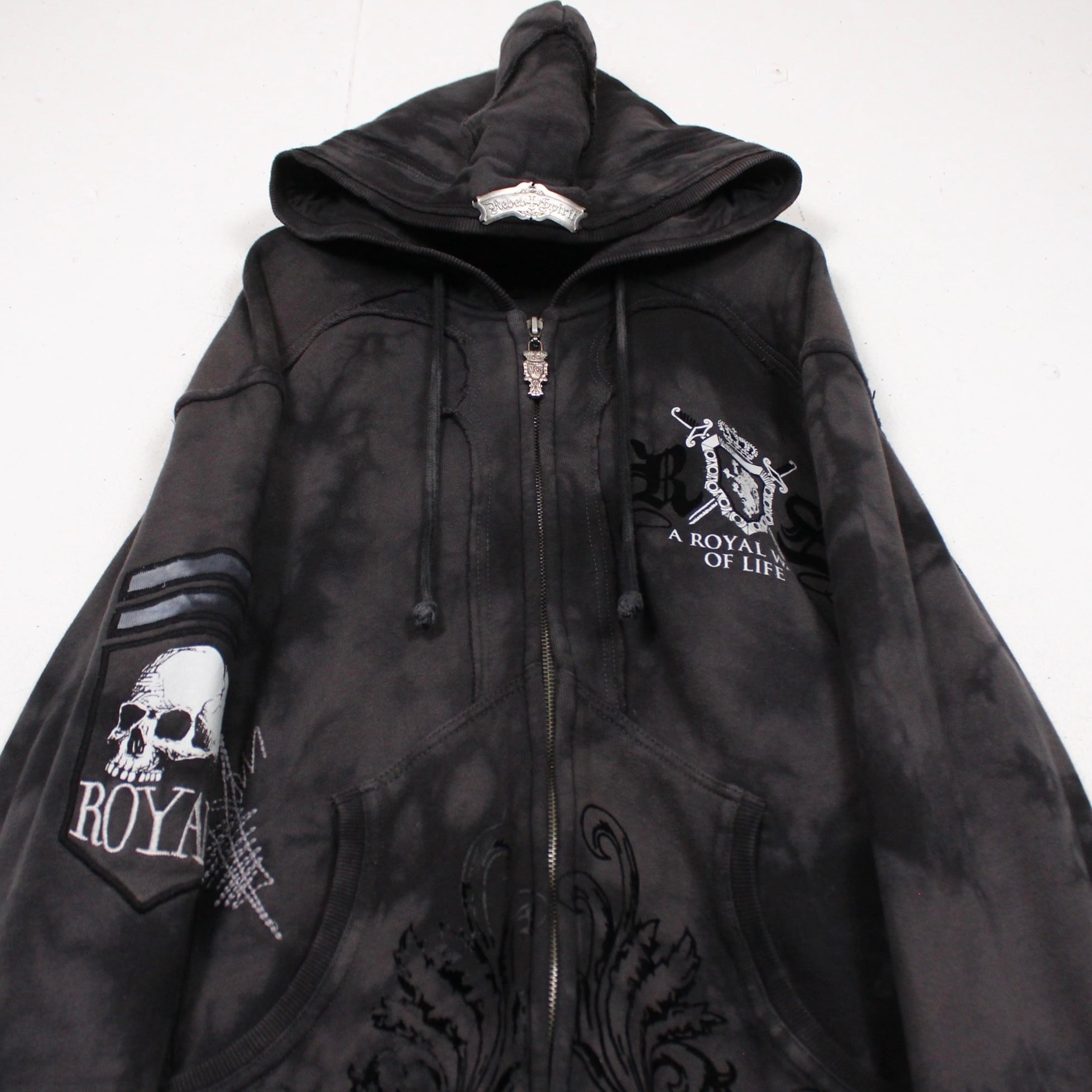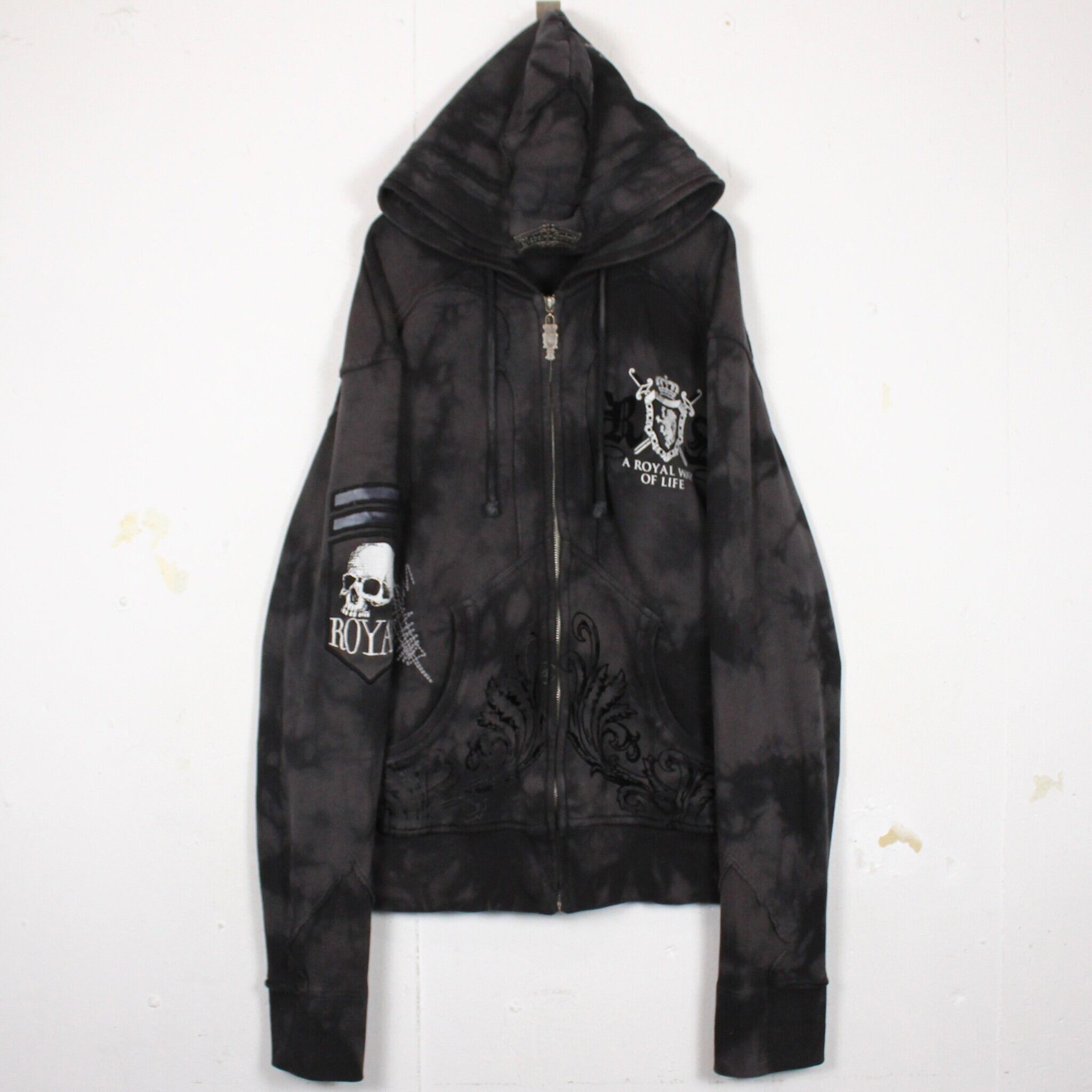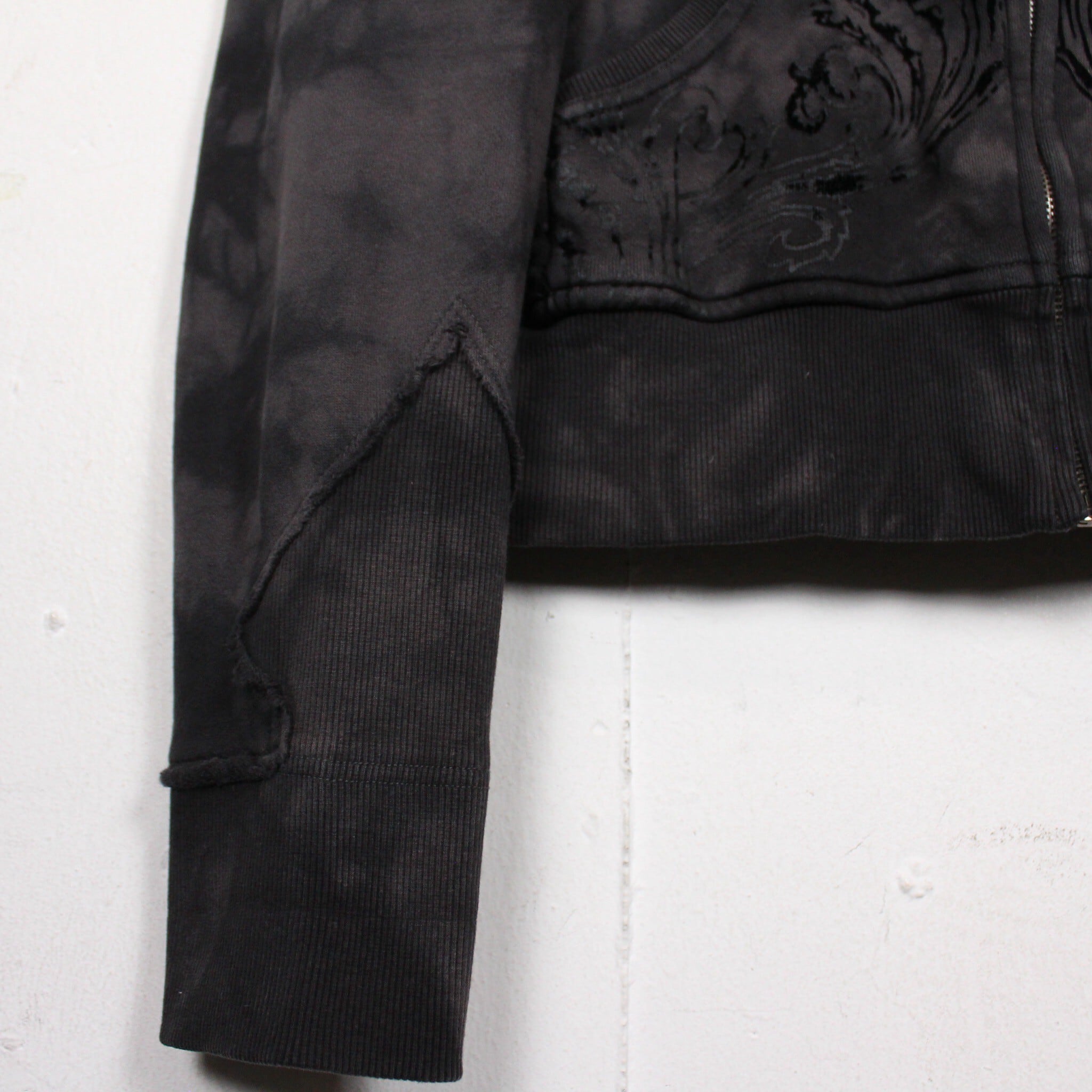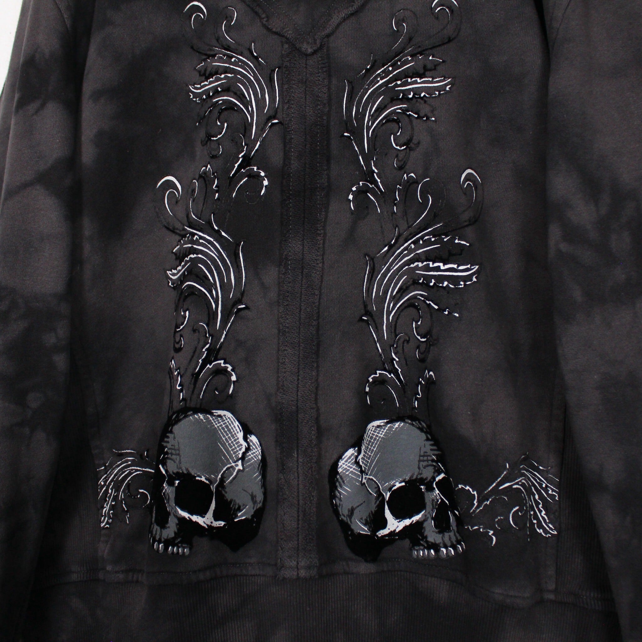 染めを効かせたようなグラデーション掛かったボディに、スカルやボタニカルなどをふんだんに使い雰囲気を放つゴシックなプリントデザインを載せたジップフーディー。