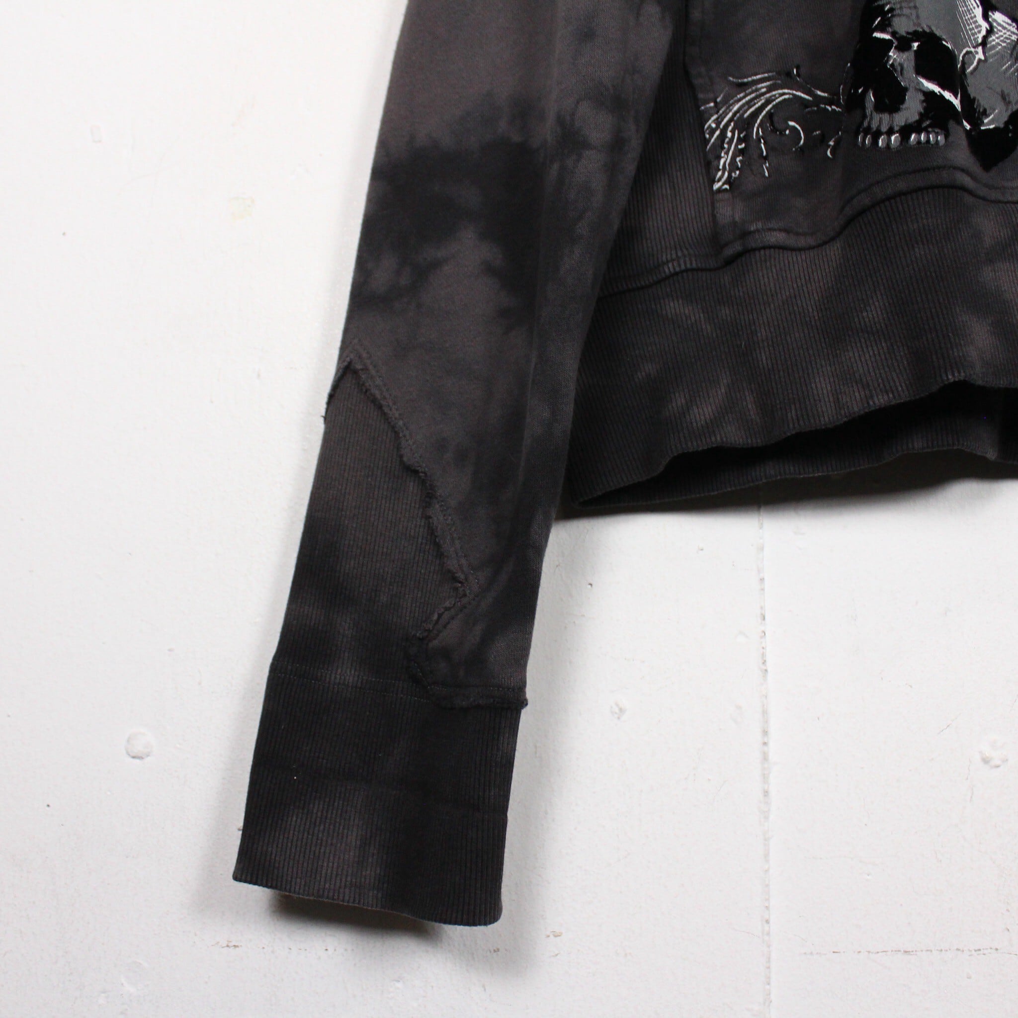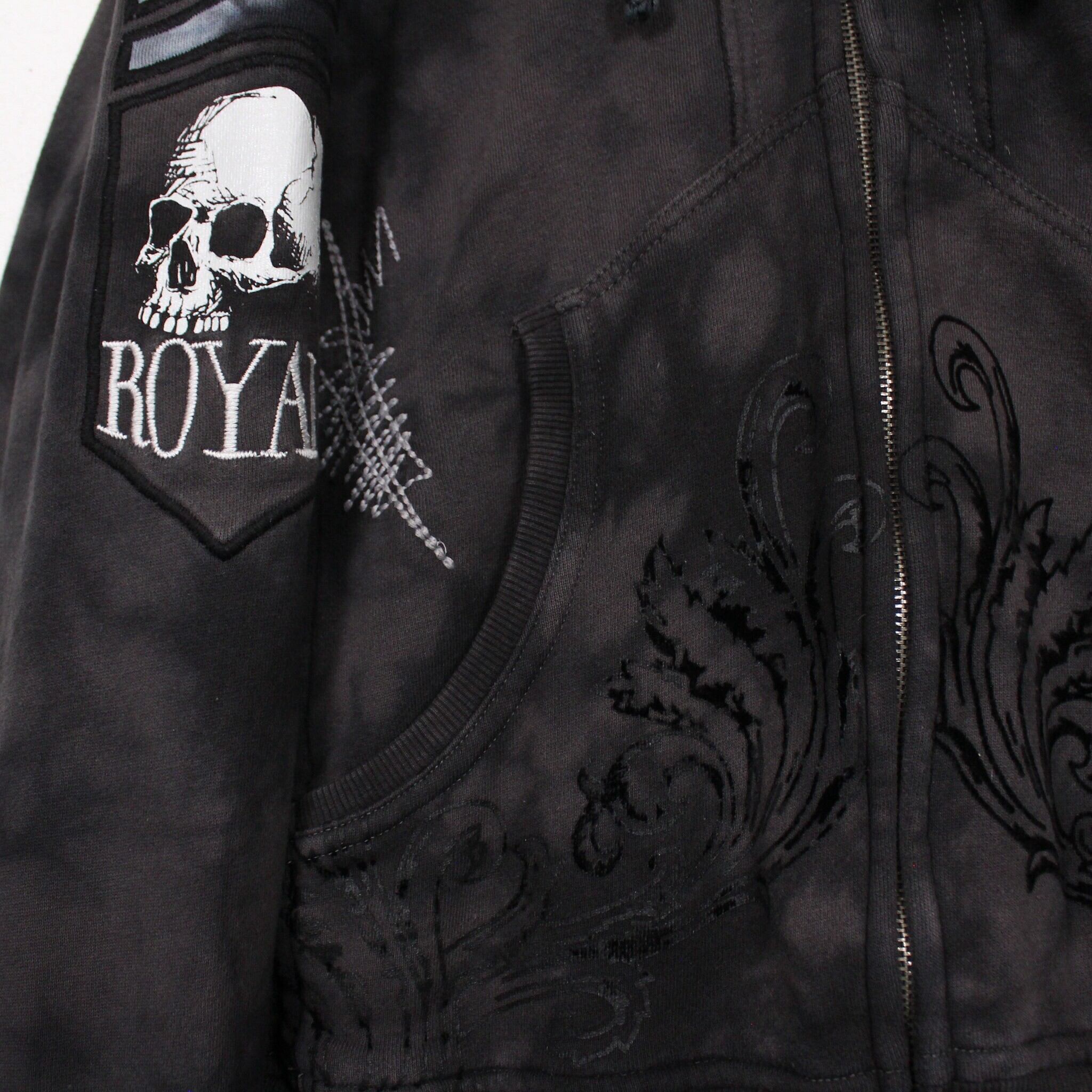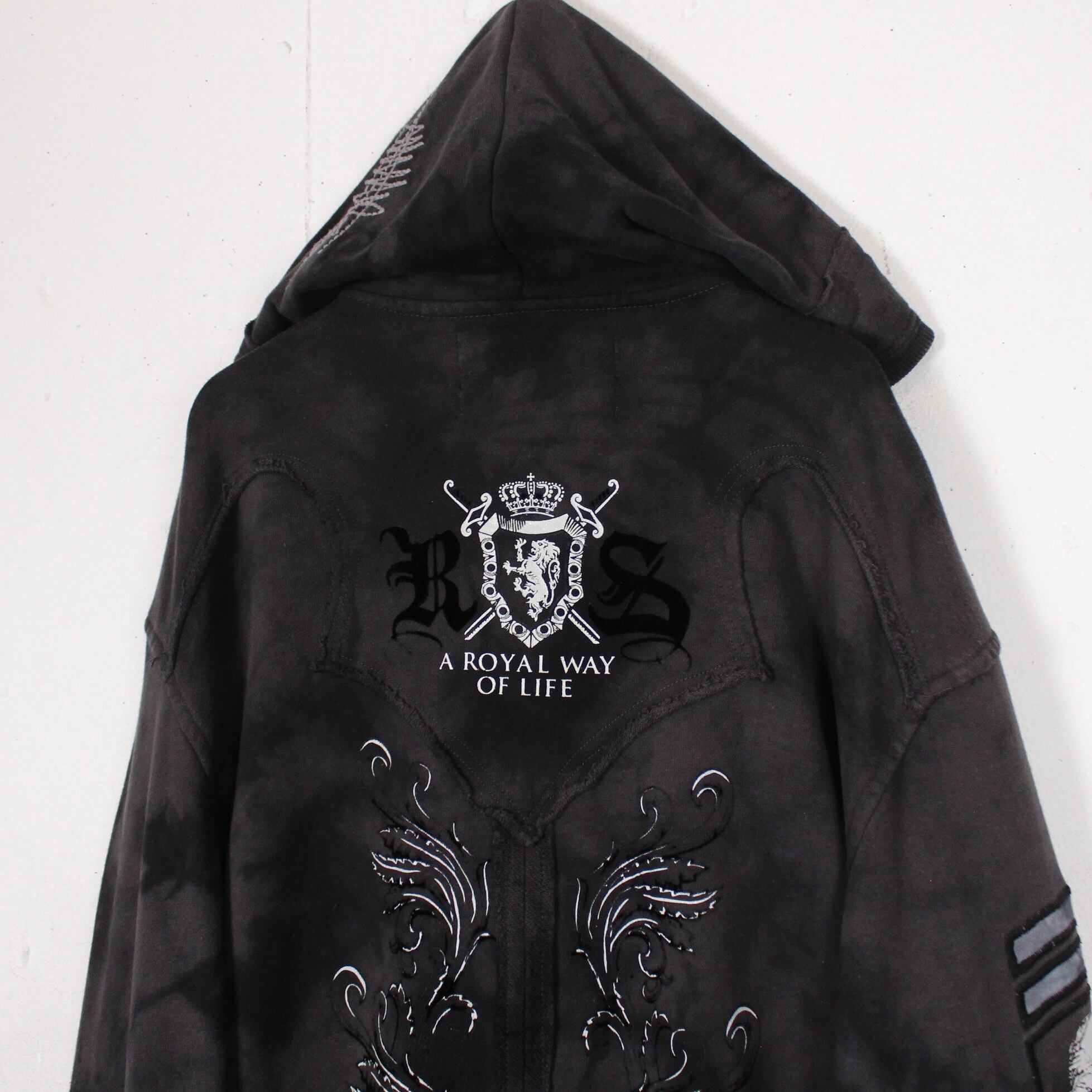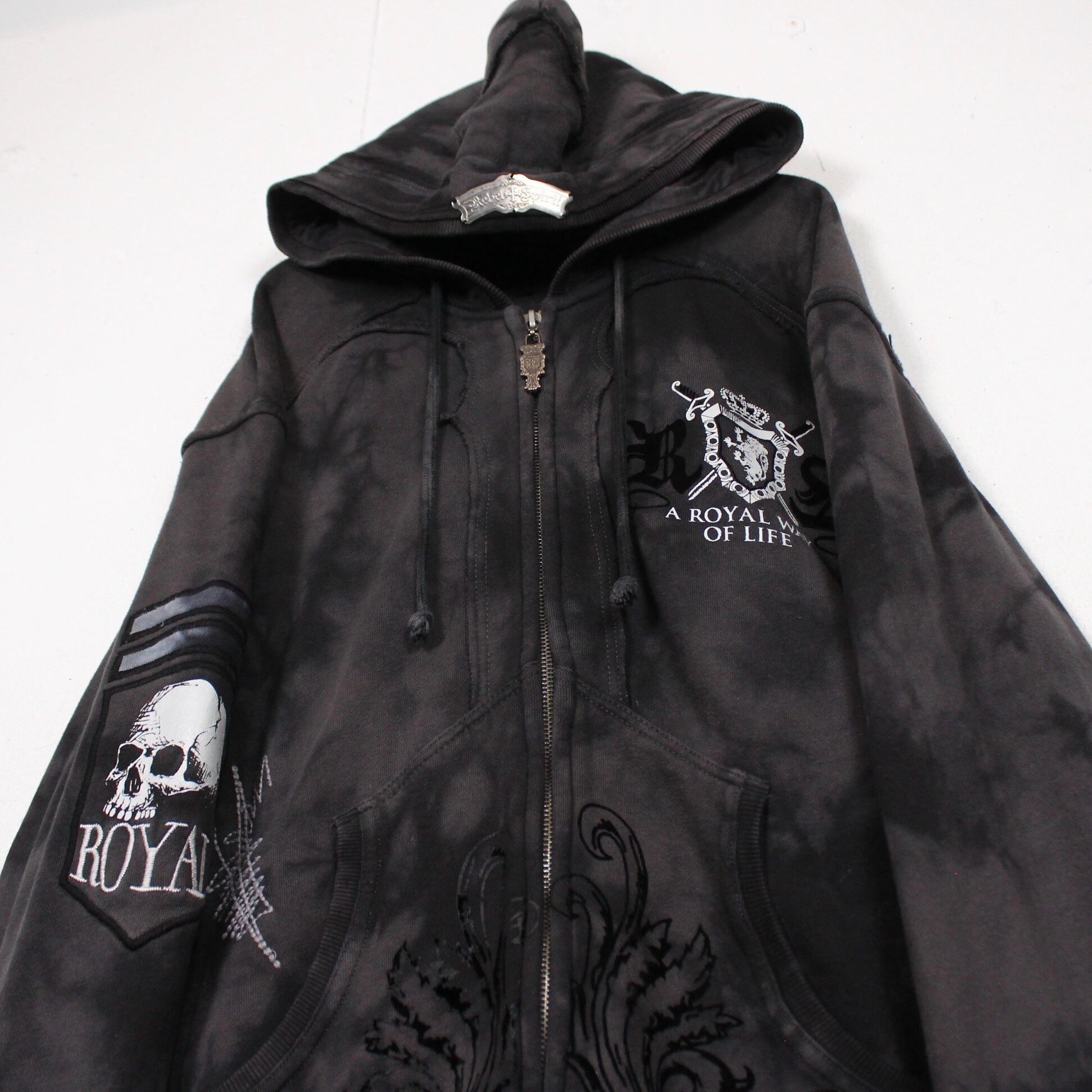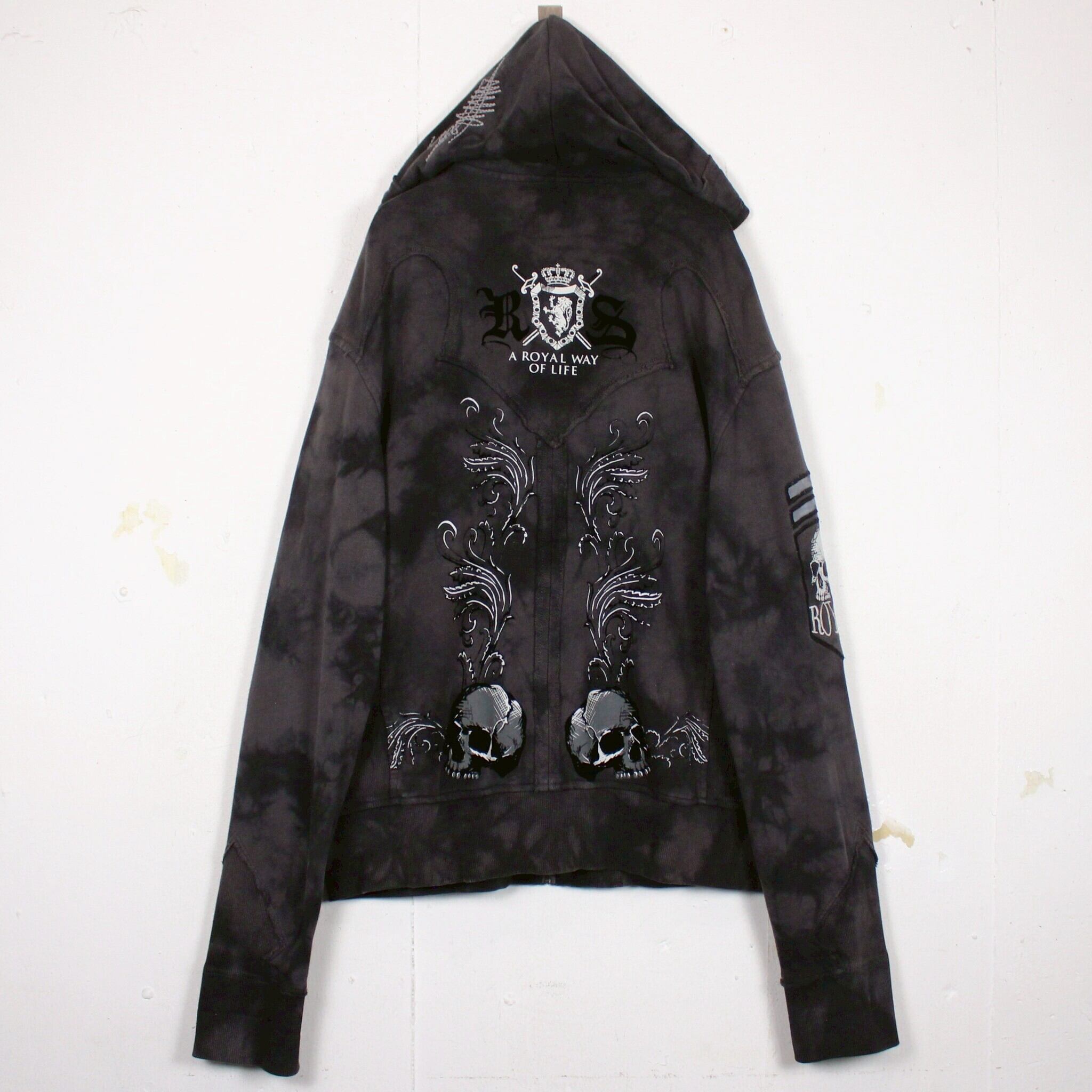 染めを効かせたようなグラデーション掛かったボディに、スカルやボタニカルなどをふんだんに使い雰囲気を放つゴシックなプリントデザインを載せたジップフーディー。