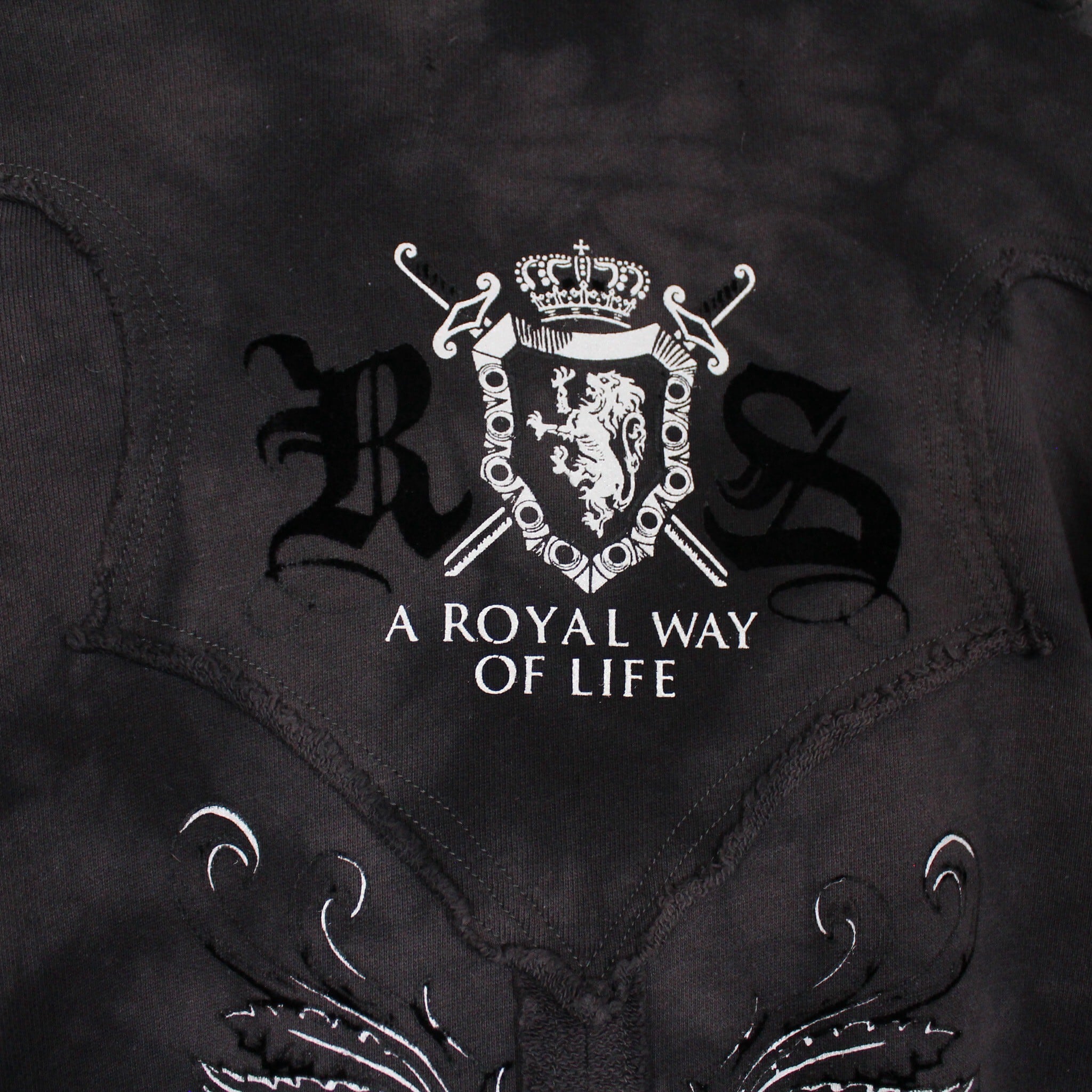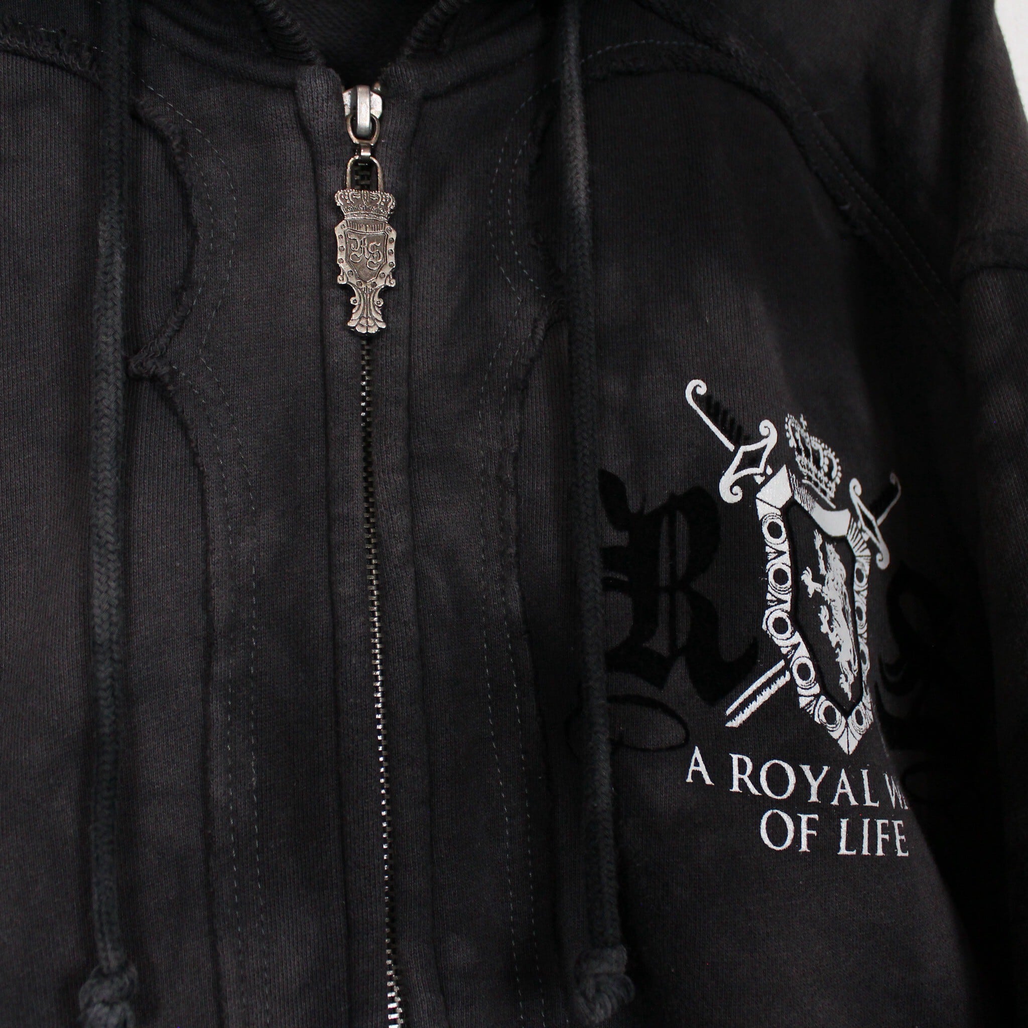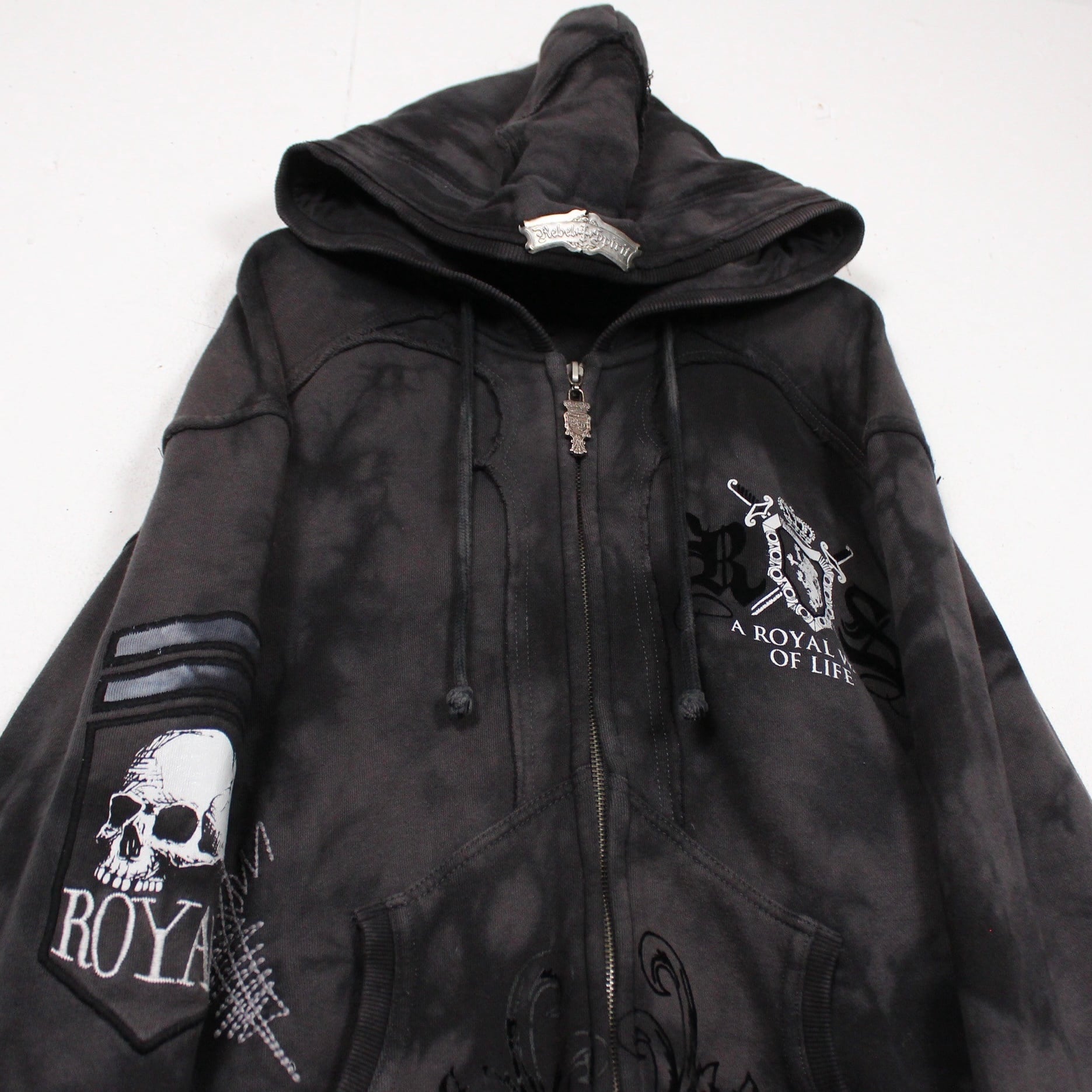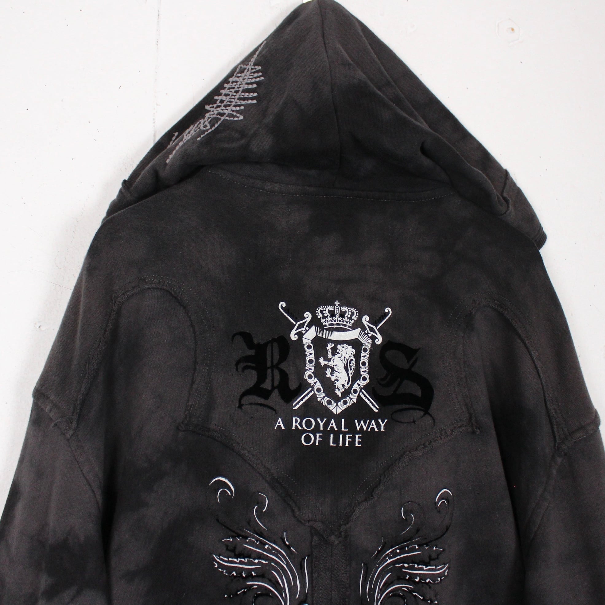 染めを効かせたようなグラデーション掛かったボディに、スカルやボタニカルなどをふんだんに使い雰囲気を放つゴシックなプリントデザインを載せたジップフーディー。