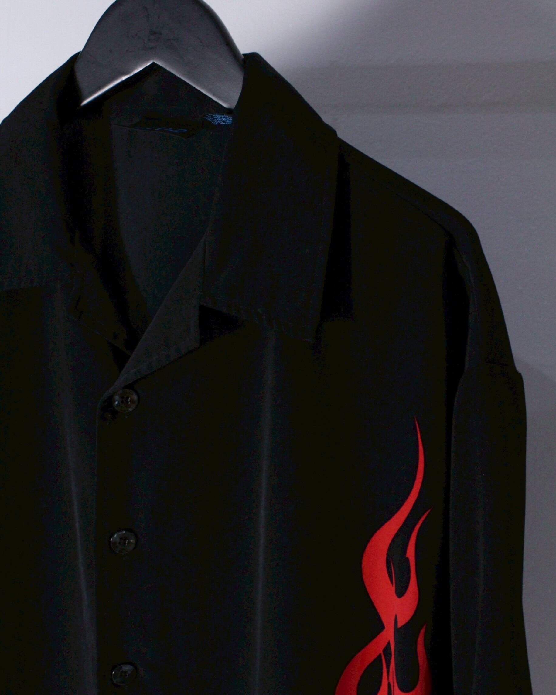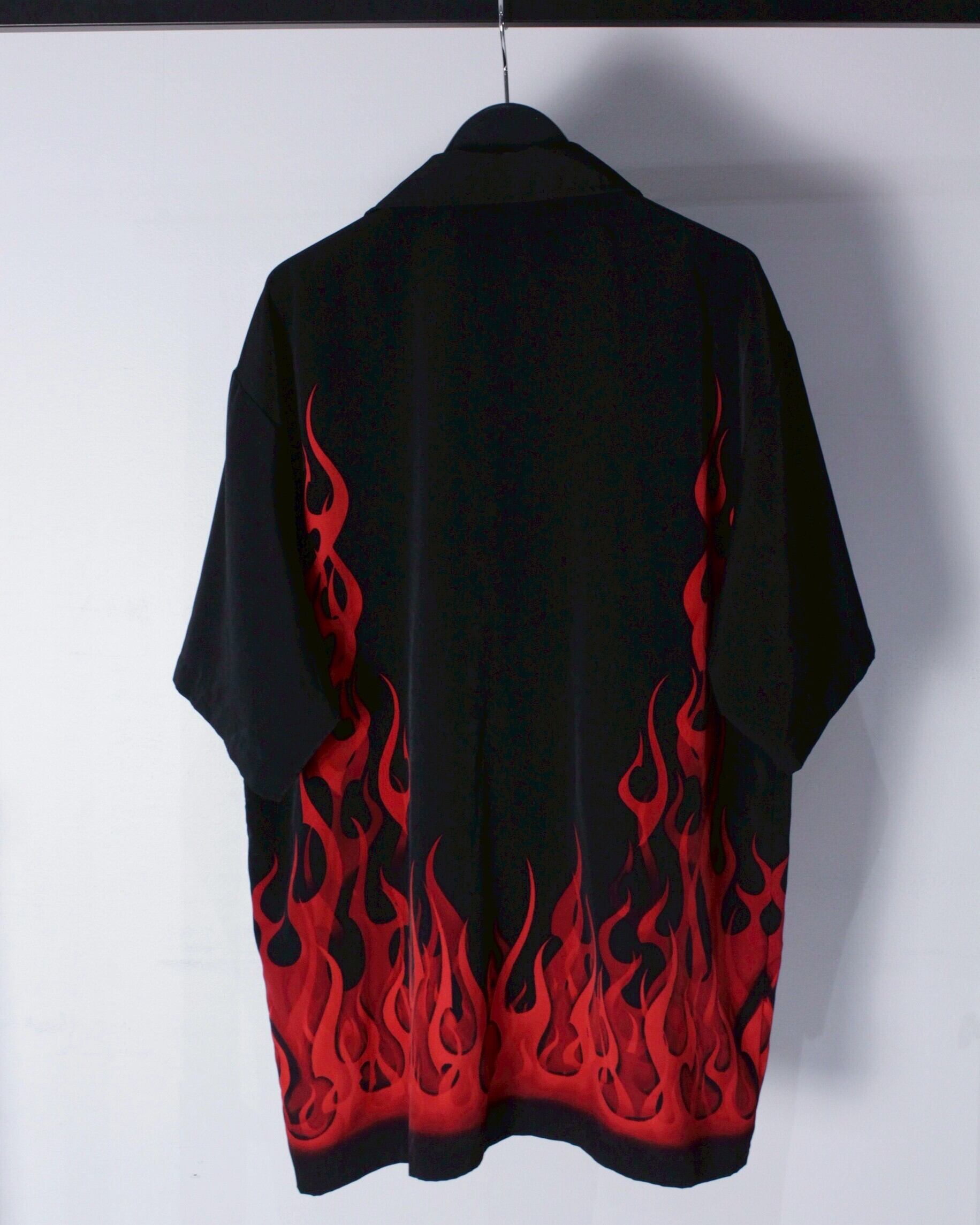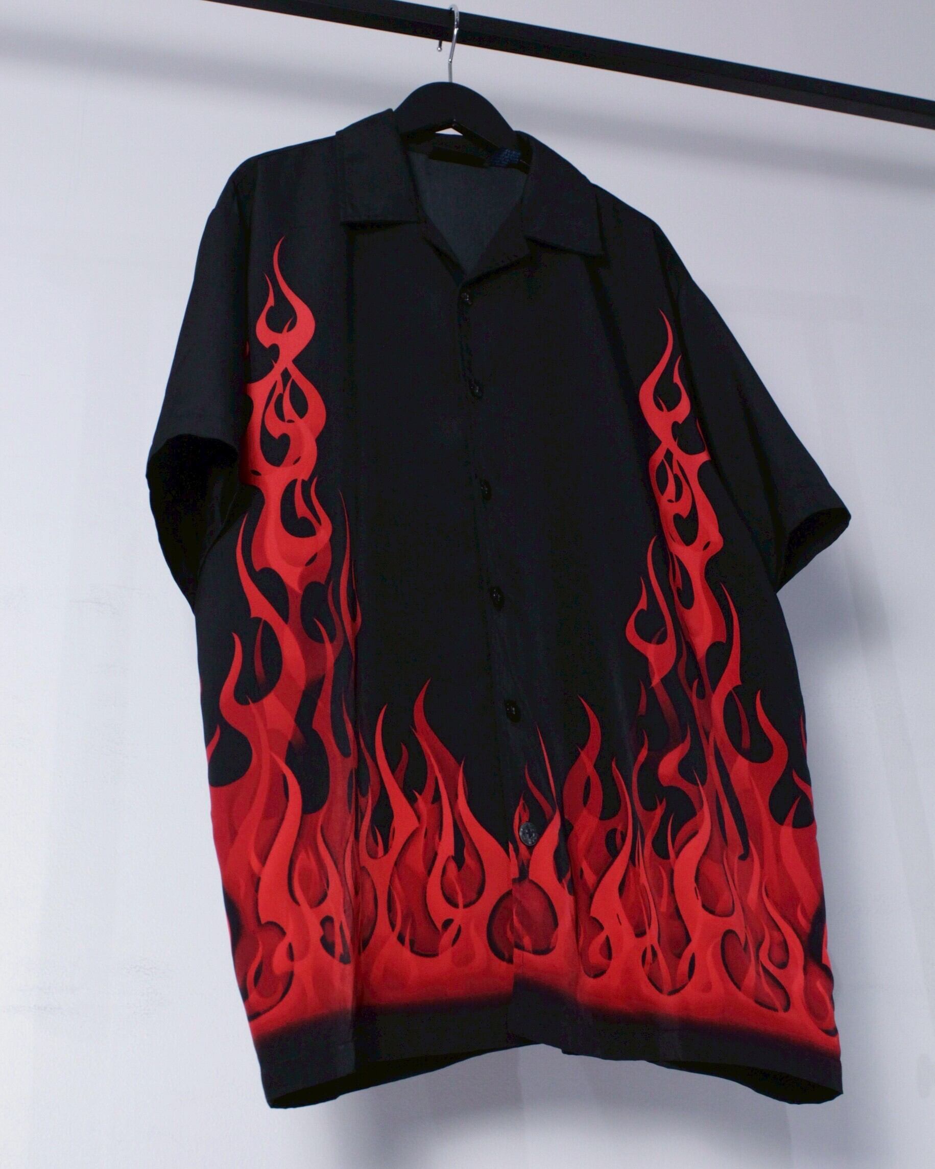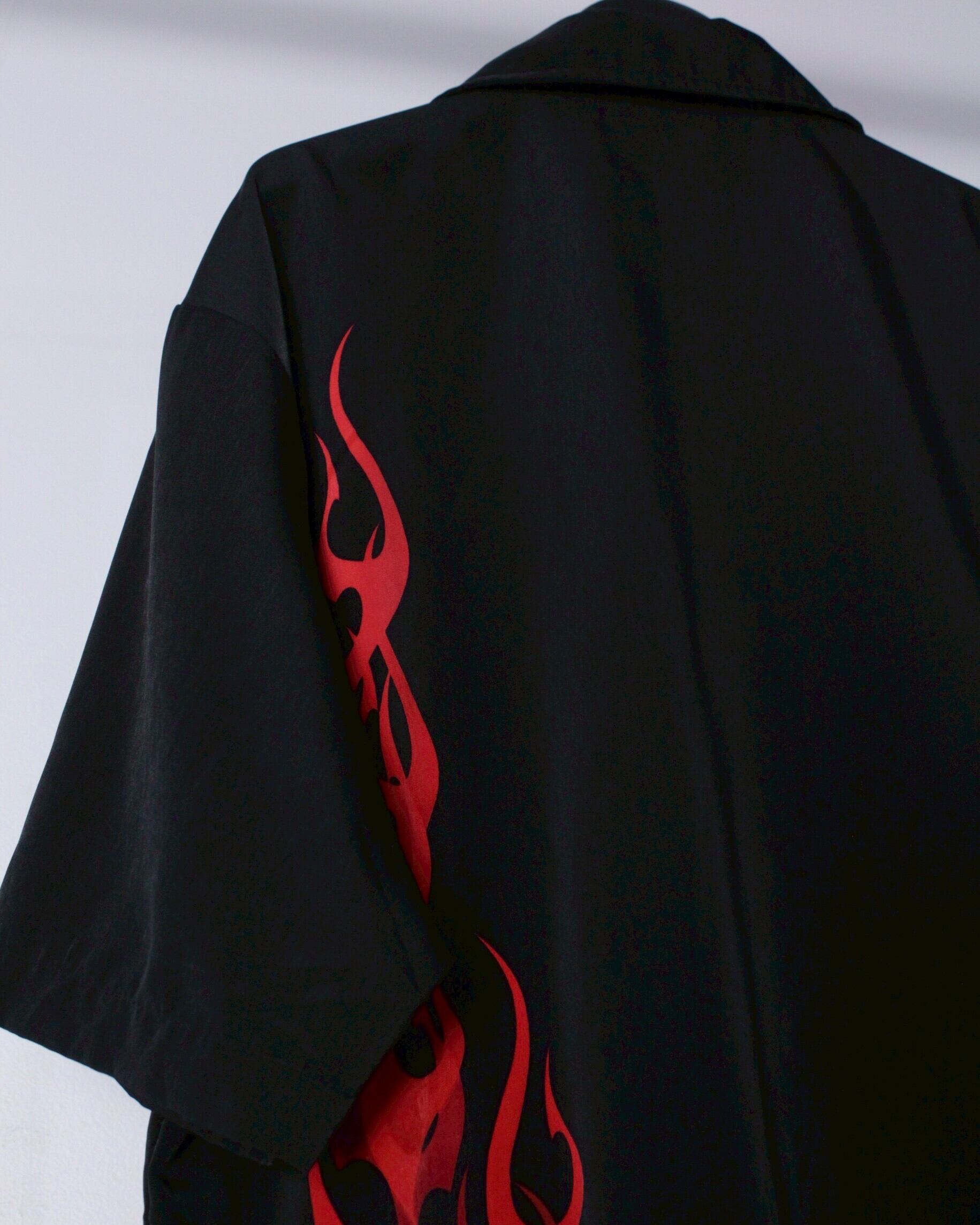 サラッとしたブラックのボディをベースに、ファイヤーパターン調のトライバルデザインを載せた半袖シャツ。