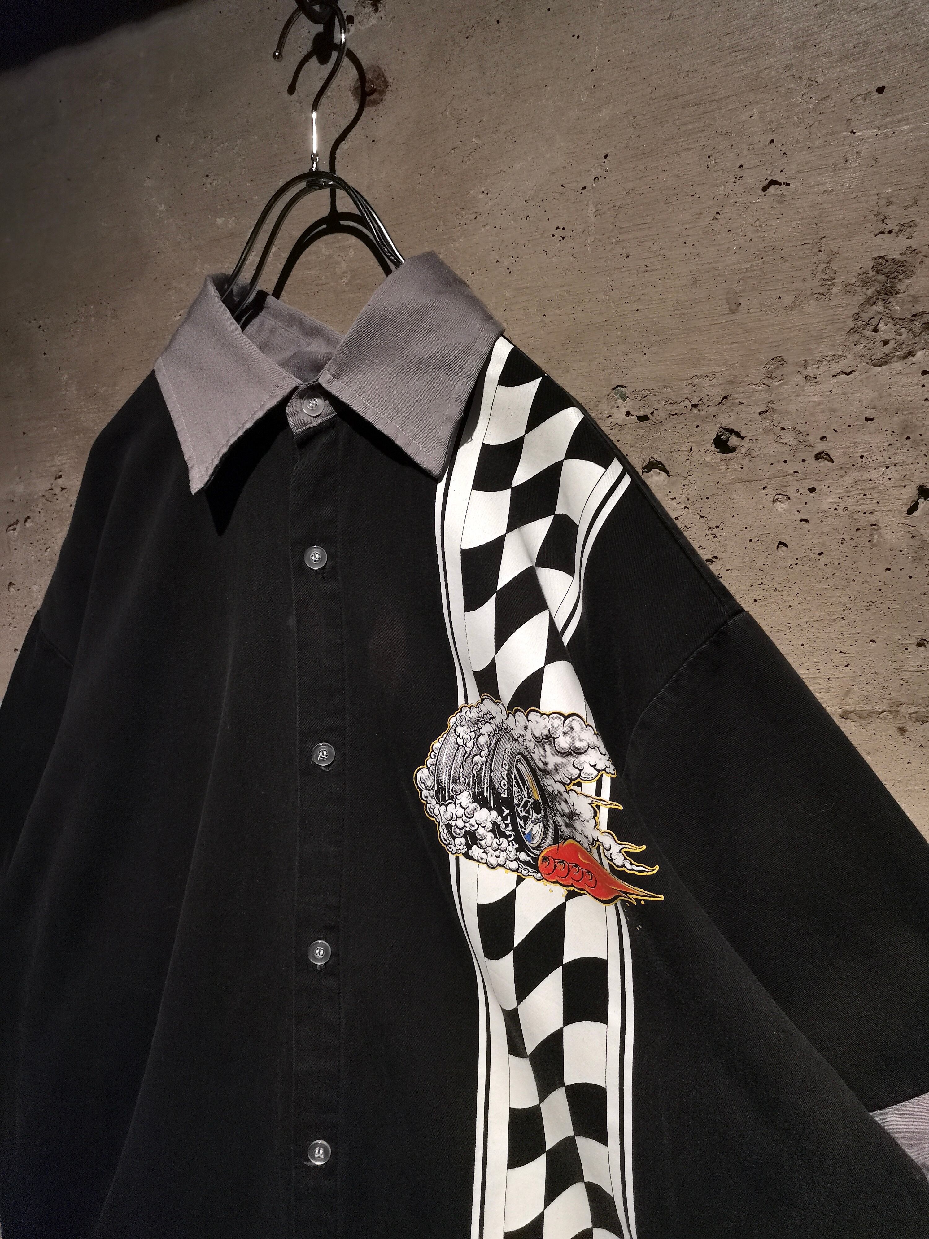 フロントにはチェッカーフラッグとスモークを巻いたタイヤを施した、ホットロッド文化も感じるデザインに。