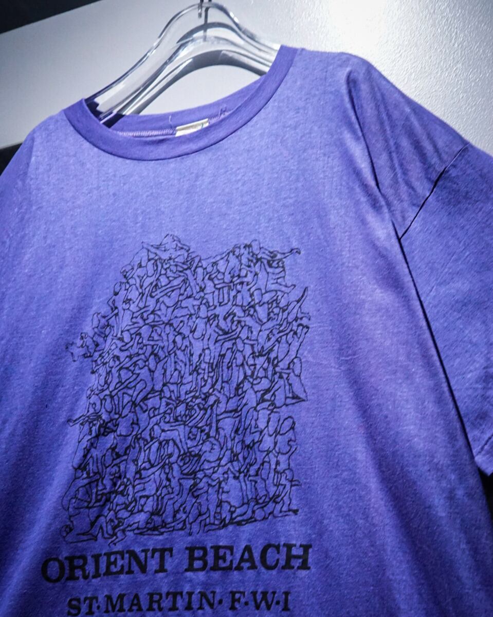 霜降り調の薄紫のボディに、セント・マーチン島にあるビーチの一つであるオリエントビーチのデザインが載ったTシャツ。