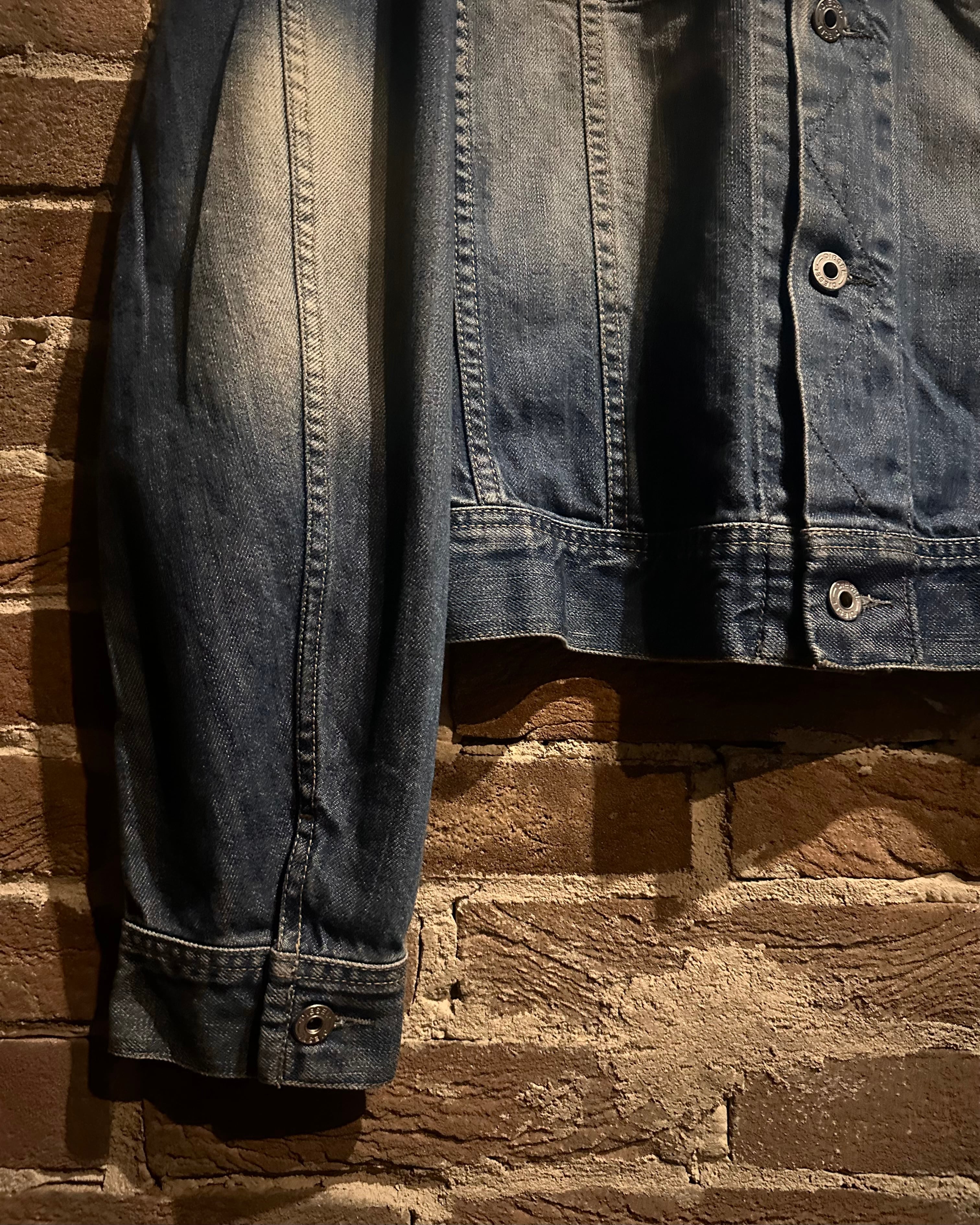インディゴブルーのデニムに、フェード加工をガッツリと施したショート丈のデニムジャケット。DIESELならではのデニムの上質な質感、そしてデザインセンスが最高です。