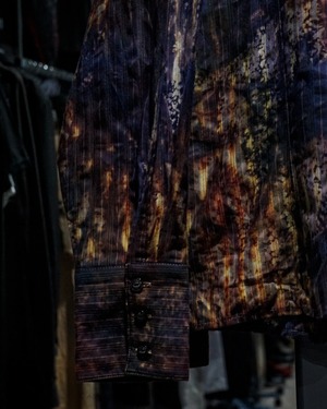 織りによってストライプ状の柄が入ったボディに、マダラな柄を全面に配した長袖シャツ。