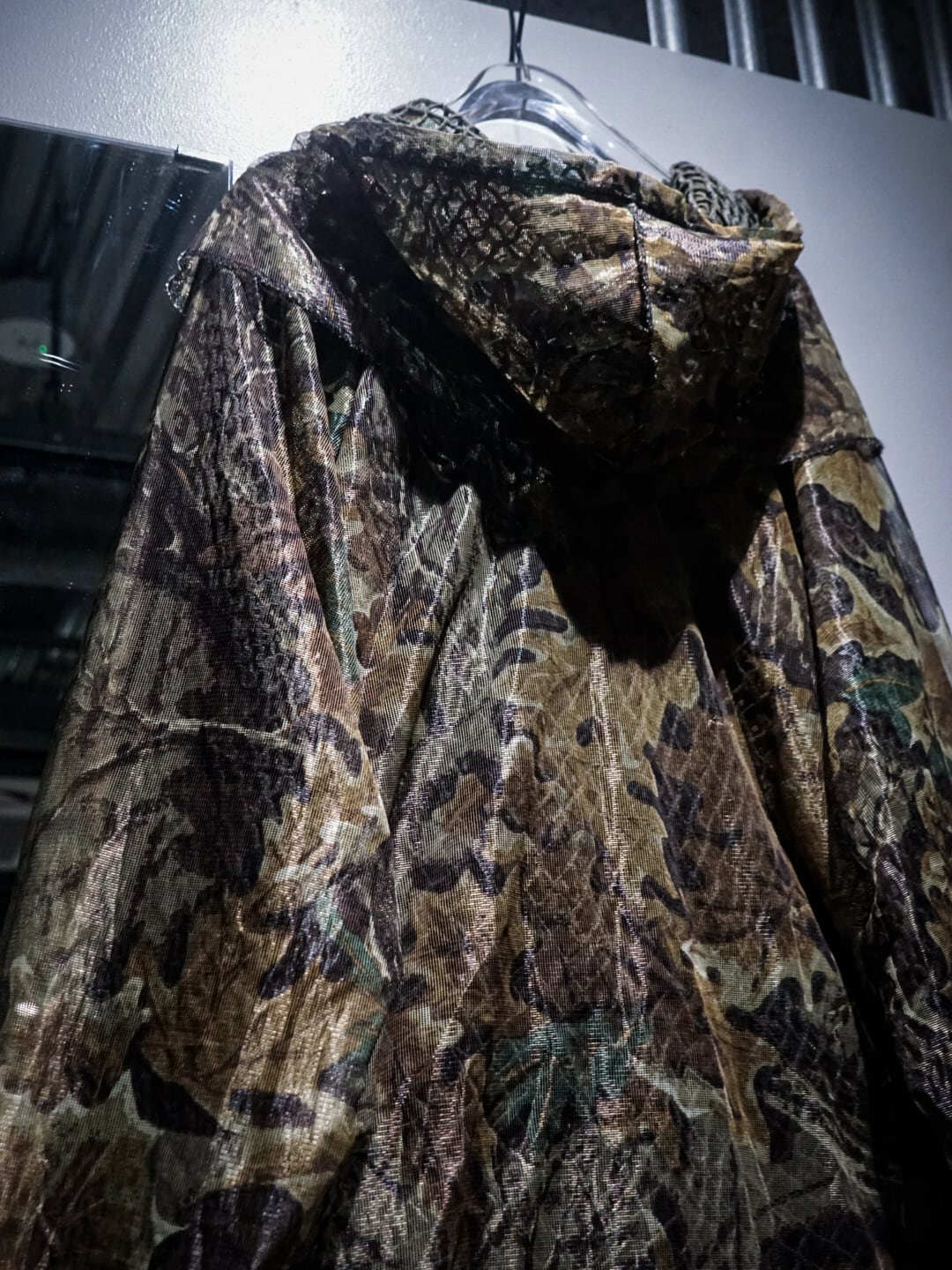 全体に迷彩柄が描かれ、1枚羽織るだけでインパクト抜群な一着。