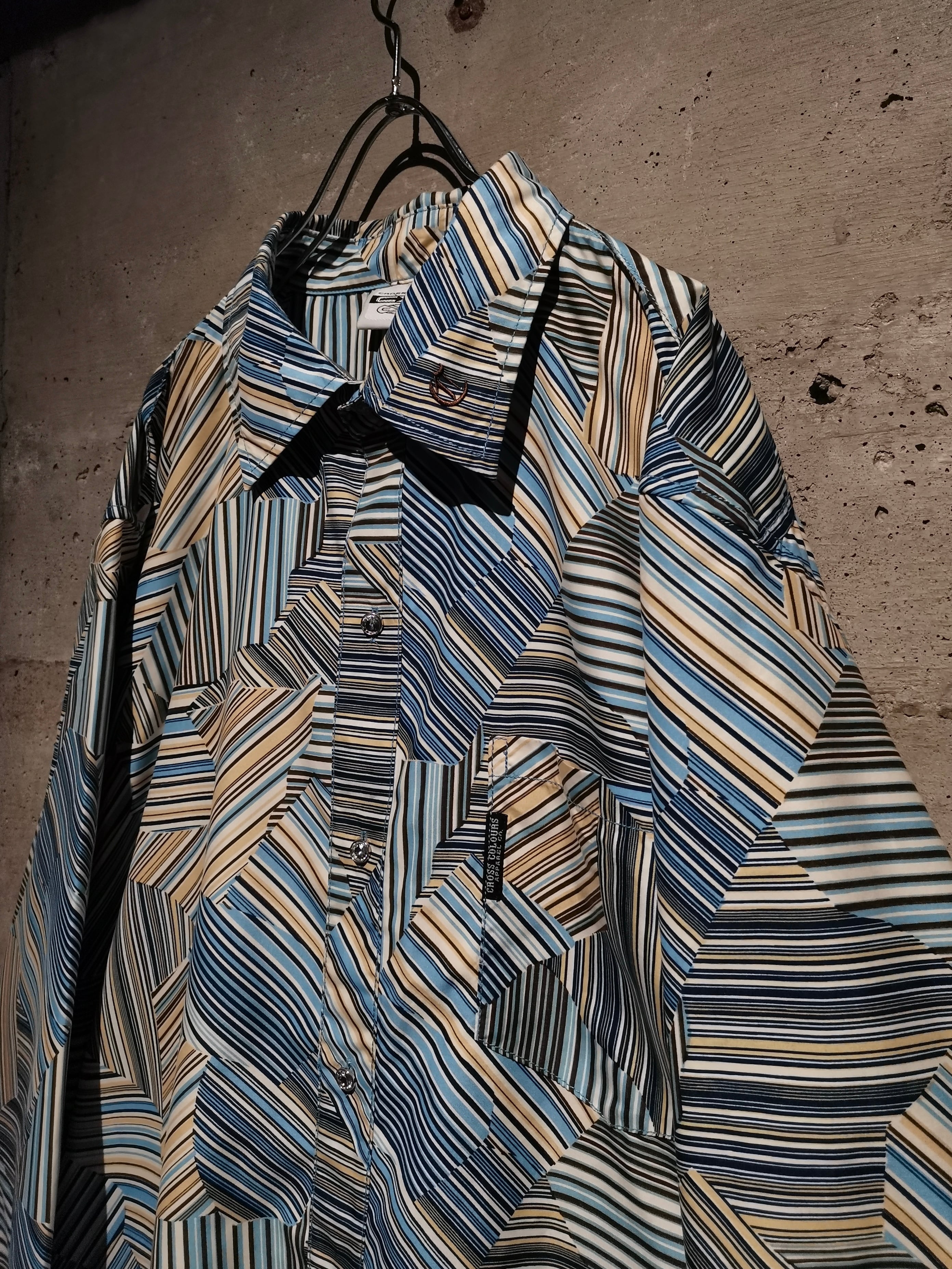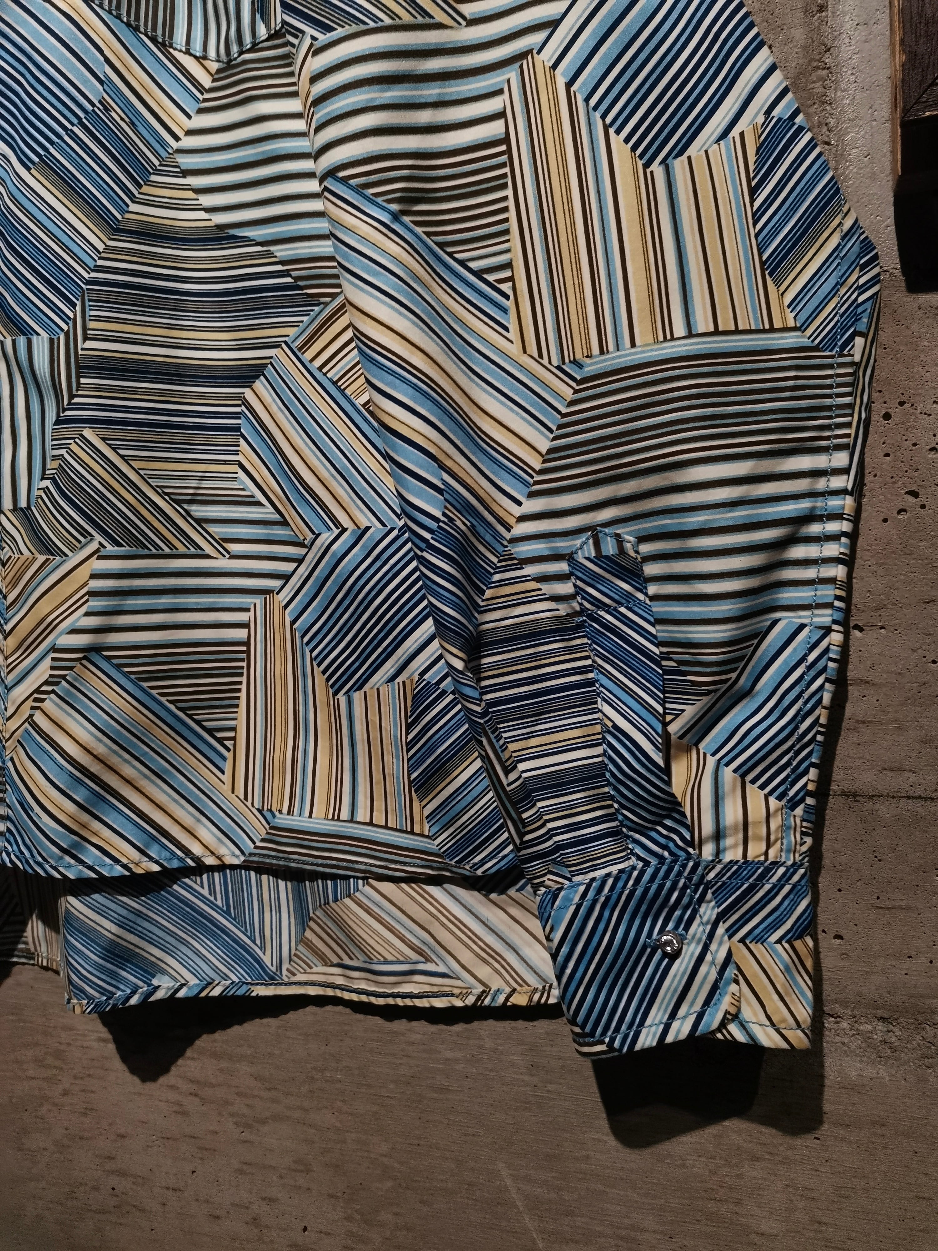 ブルー、ブラウン、ベージュ、ホワイトといった爽やかな配色で構成されたストライプ柄をボディ全体にランダムで配した1着。