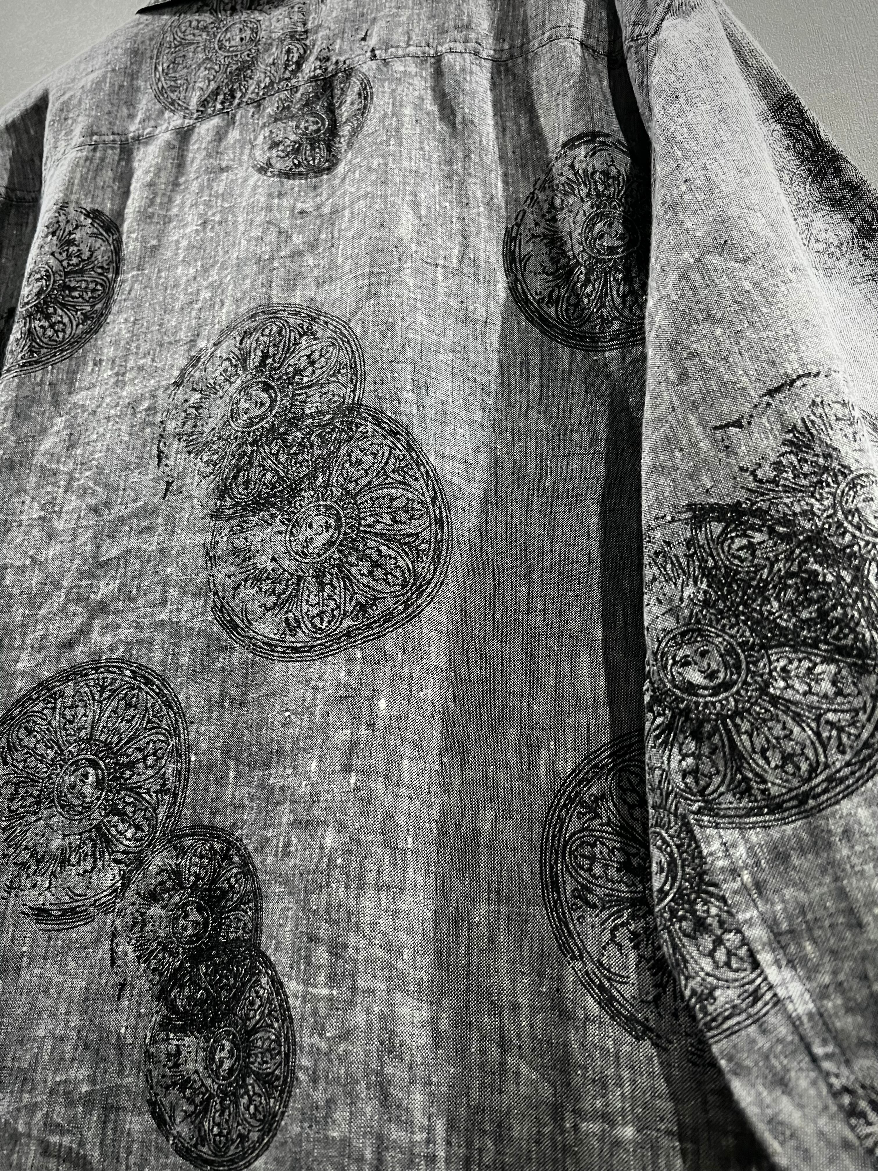 ドライな質感のグレーのボディに、アーティスティックな花のデザインを載せたリネンジャケット。