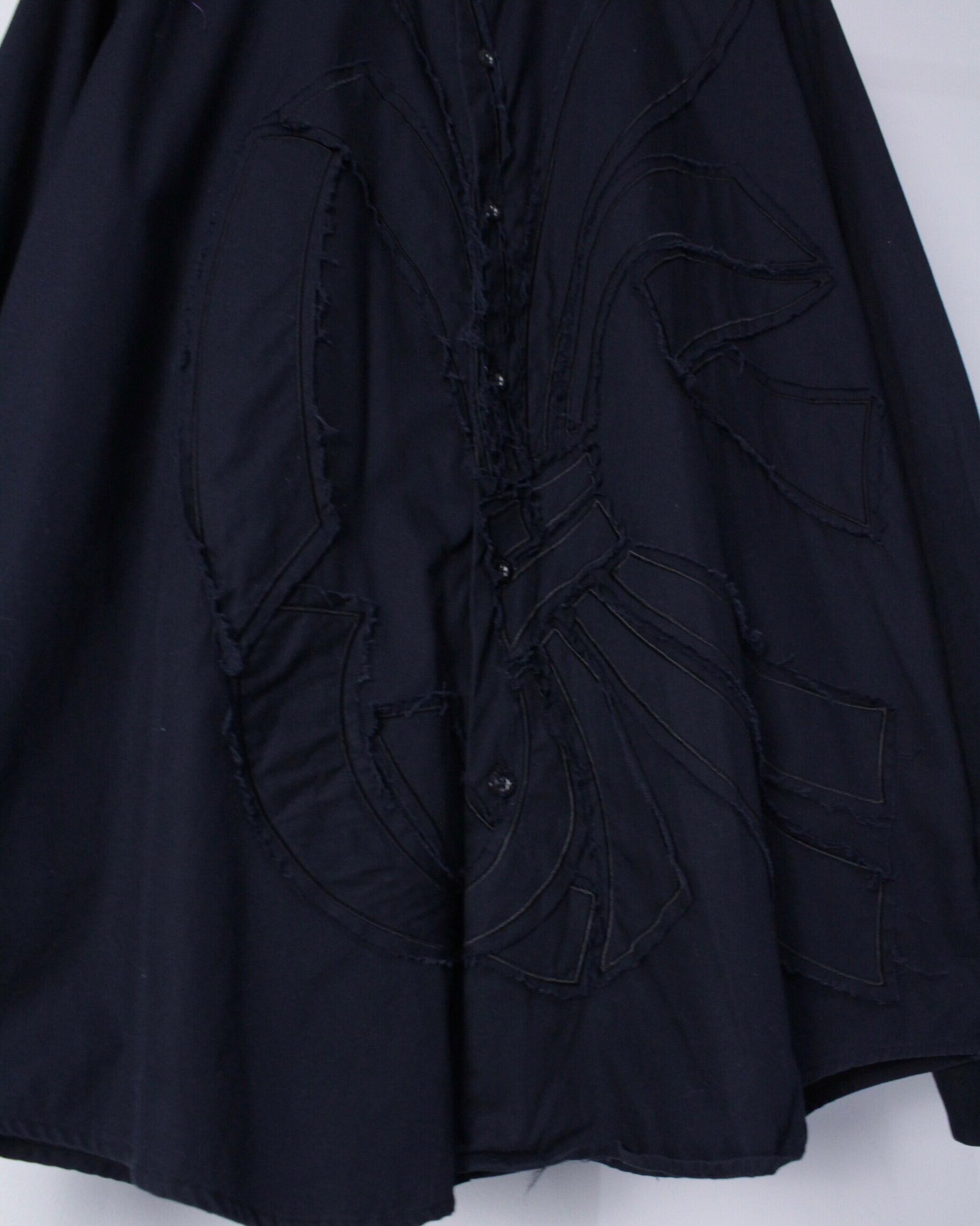 ボディと同生地を用い、フロントに抽象的なアップリケを大胆に載せた長袖シャツ。